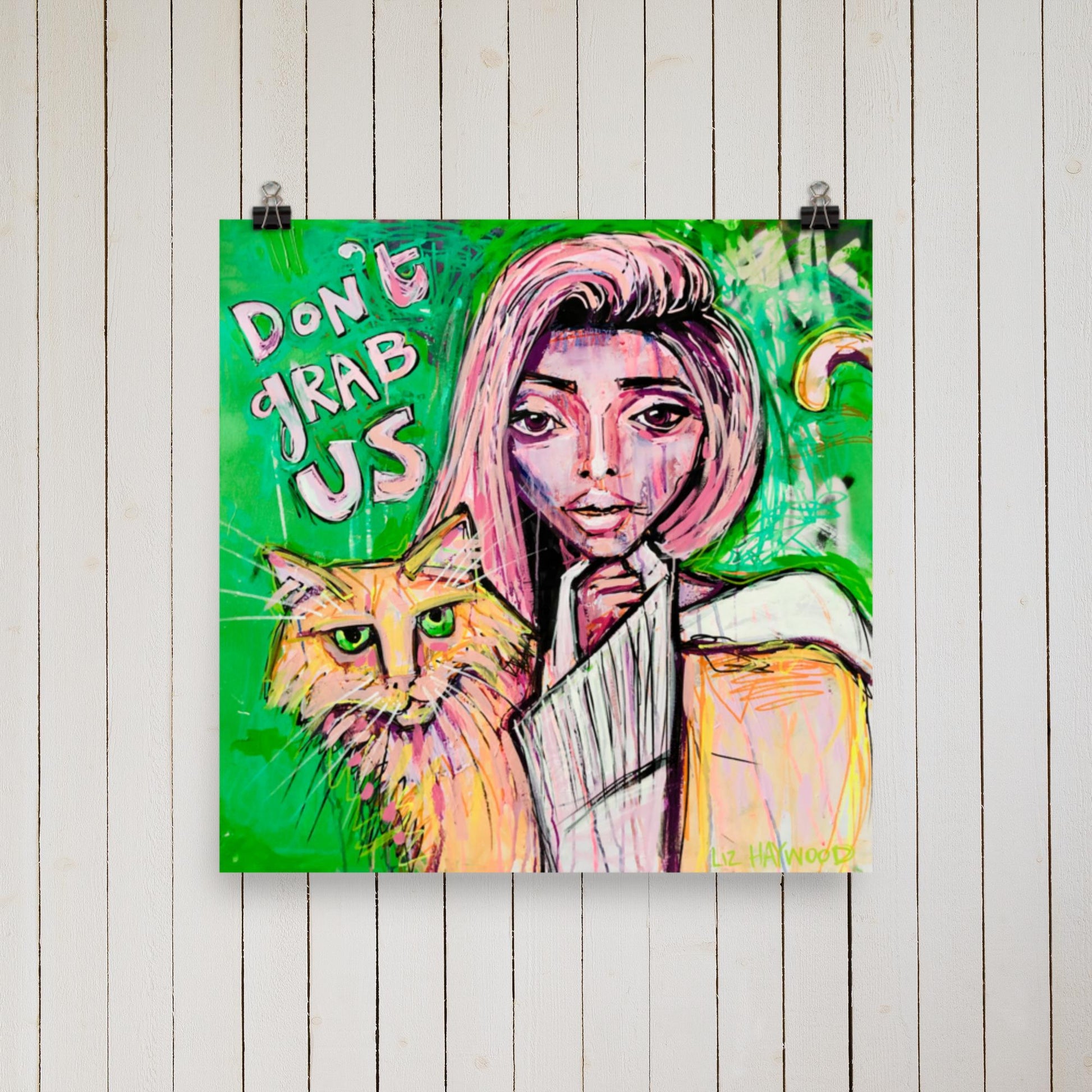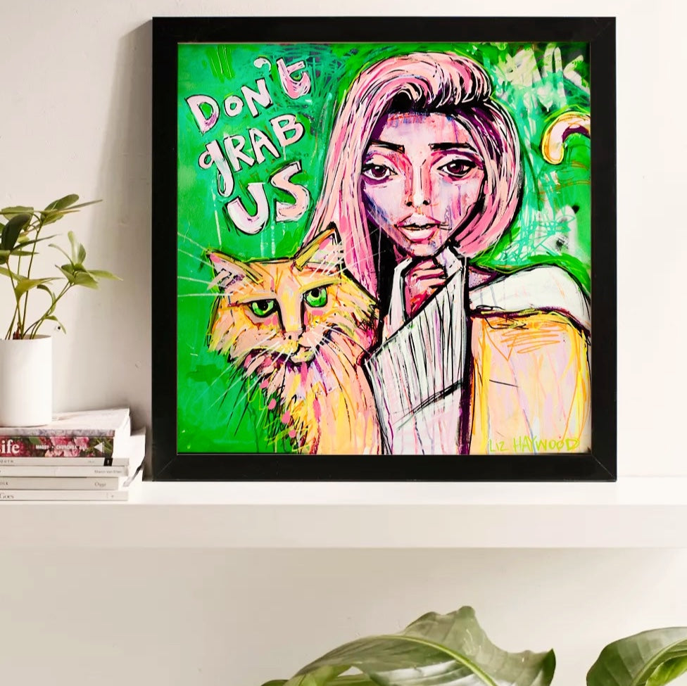 Make a powerful statement with the 'Don't Grab Us' print by Liz Haywood, set against a bold green background. This striking artwork was created in response to Trump's derogatory comments about women, serving as a defiant and artistic protest against his misogynistic remarks. Liz Haywood’s vibrant and unapologetic style captures the anger and resilience of those who demand respect and equality.