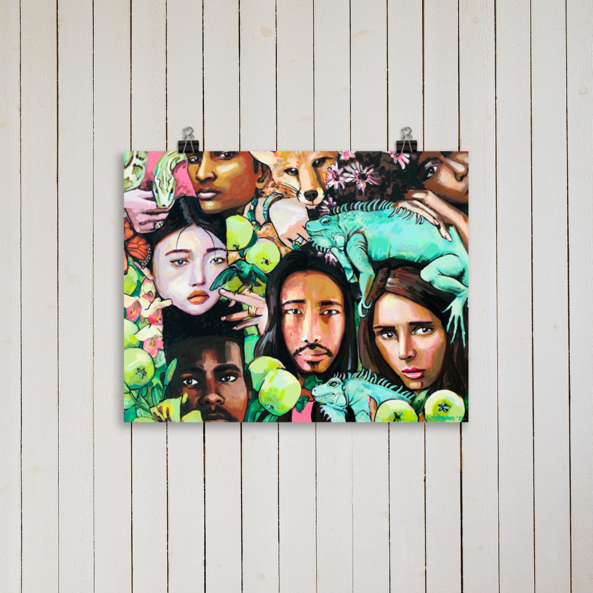 This vibrant and captivating 11 x 14 art print is made from a painting in Liz Haywood's series of art, Many Faces. It celebrates the beauty and diversity of our world. Featuring a mix of people of many different ethnicities and skin tones, this artwork also displays a variety of plants and animals, all painted with an array of colorful media—spray paint, latex paint, and acrylic pens. This unique design radiates a sense of joy and awe. It’s a reminder of our responsibility to protect the stunningly diverse world we inhabit. A fox, an iguana, a snake, and a husky dog wearing a flower crown of daisies offer fun and whimsical detail, furthering this beautiful print’s celebration of biodiversity. Hang this special art print in your home and you’ll be reminded daily of the immense beauty of our world—and our role in protecting it. This museum-quality poster is made on thick matte paper. Add a wonderful accent to your room with these posters that are sure to brighten any environment.