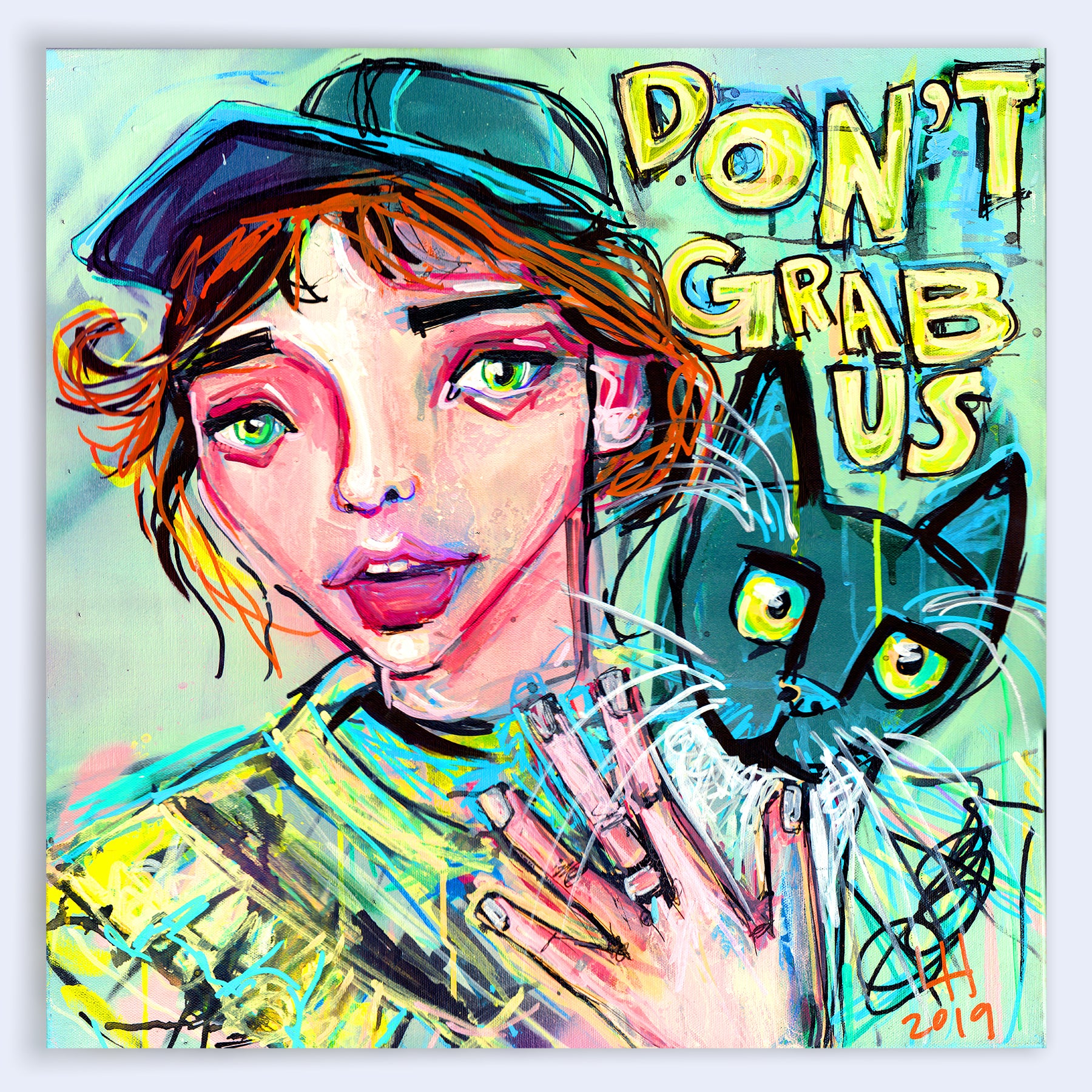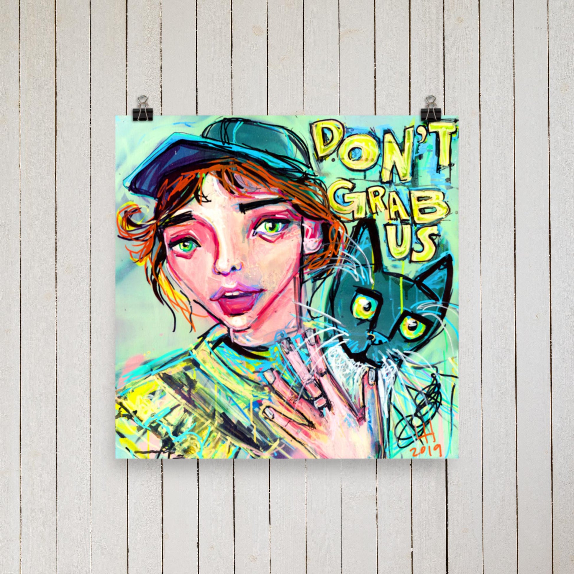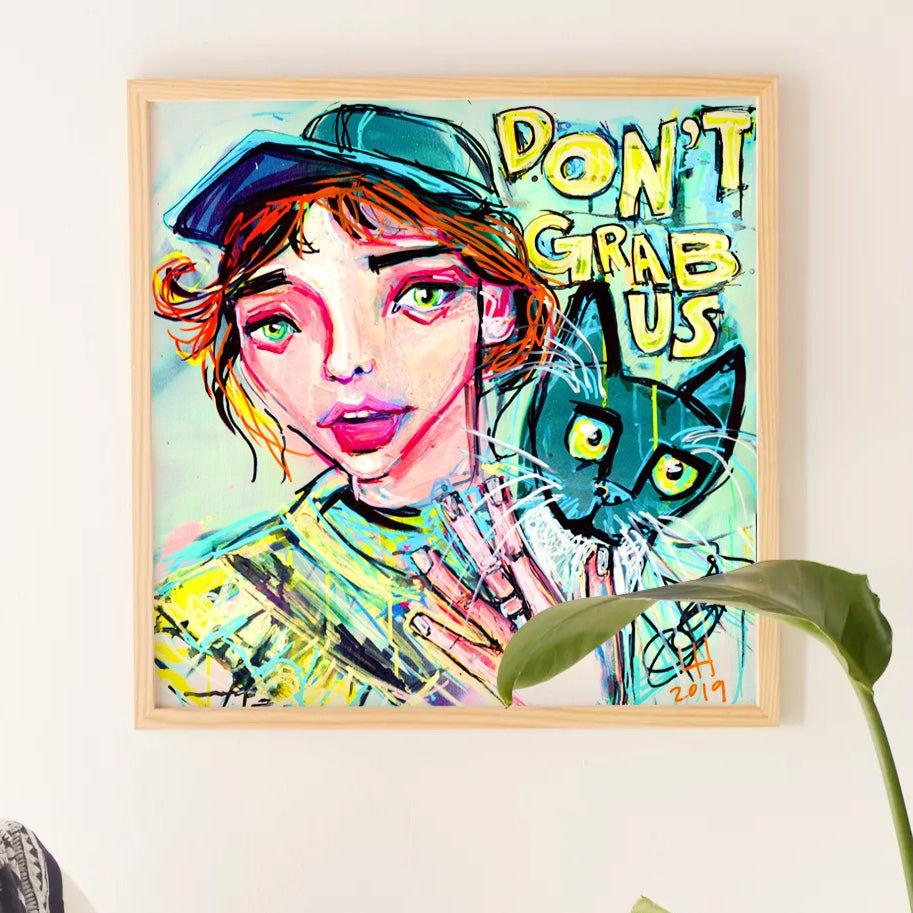 Make an impactful statement with the 'Don't Grab Us' 16 x 16 print by Liz Haywood. This provocative artwork confronts and critiques the derogatory attitudes and comments of the past, embodying a powerful feminist stance against disrespect and objectification. Liz Haywood’s vibrant, high-energy style infuses the print with a bold, defiant character that commands attention.