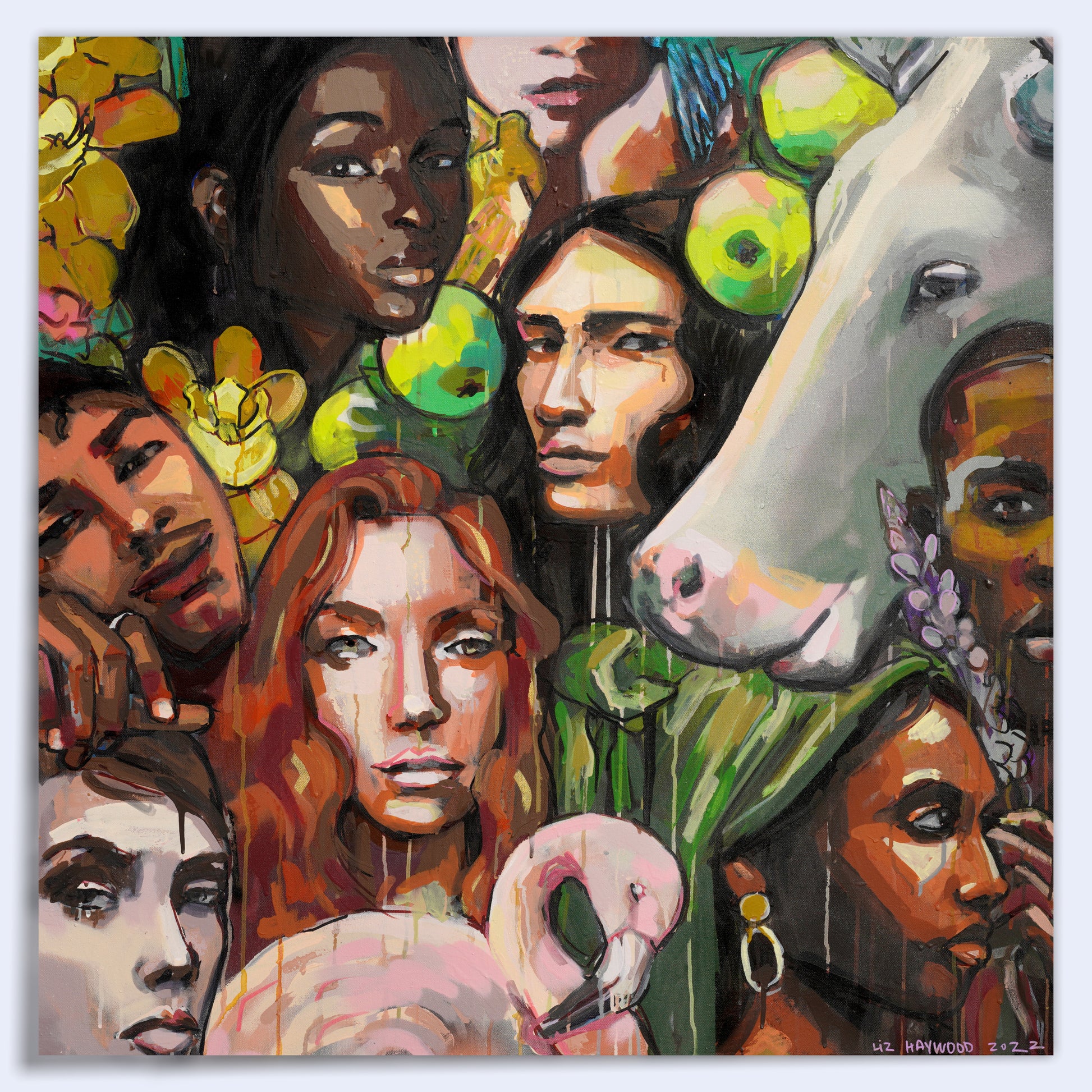 This vibrant piece of art celebrates the beauty and diversity of life on earth with a unique fusion of animal imagery and human figures of varying skin tones. This artwork is a gorgeous addition to the Many Faces series of artwork. Liz Haywood’s “Green Apples and People” will be sure to grab instant attention with its bold and colorful use of spray paint and latex paint. The painting features sketchy lines depicting yellow orchids, birds, a flamingo, and a lavender flower and a large gray ox on the right side. The artwork has rich texture and the use of drips in the original painting looks marvelous as an art print. This is an ideal piece for home decor enthusiasts who love to celebrate diversity in every form.