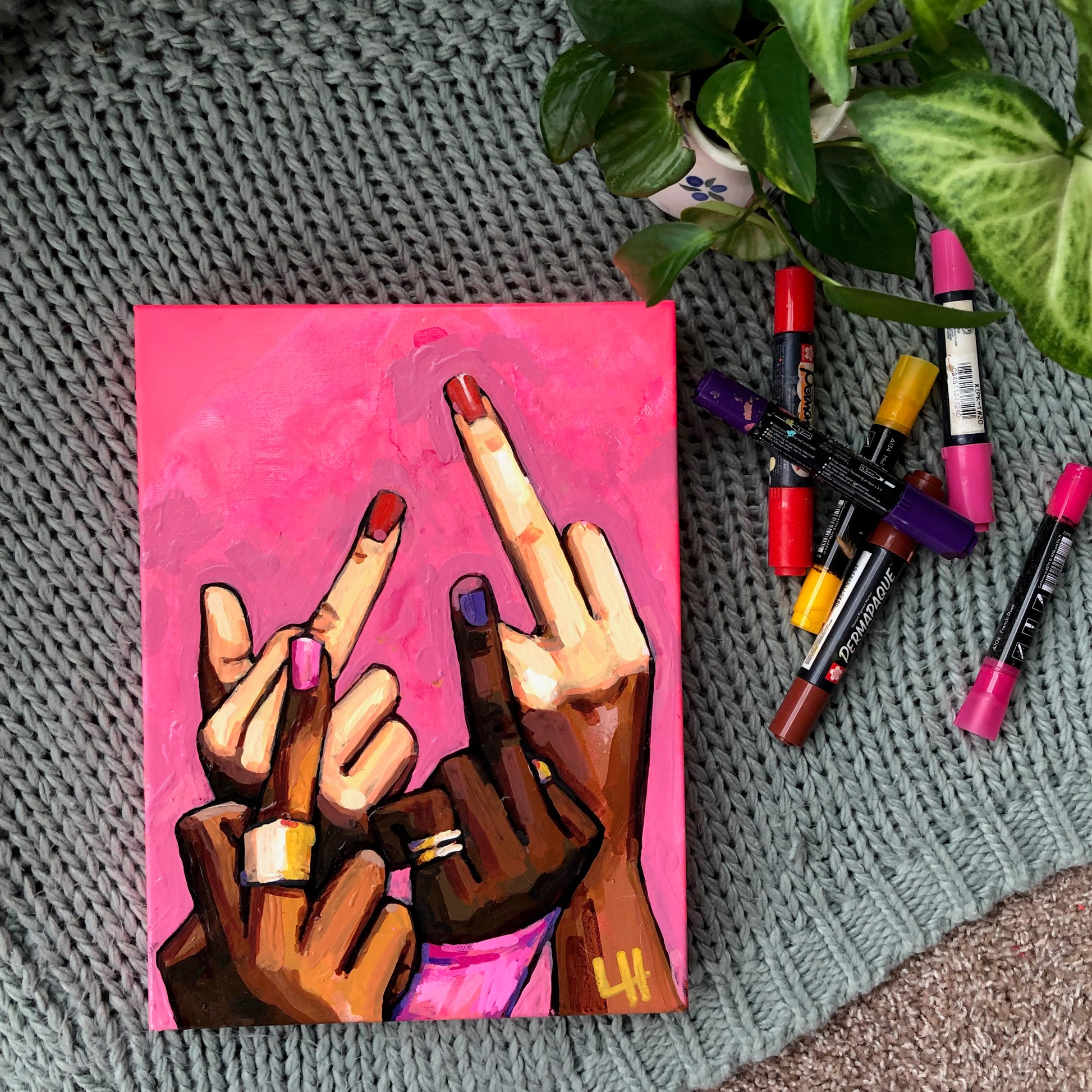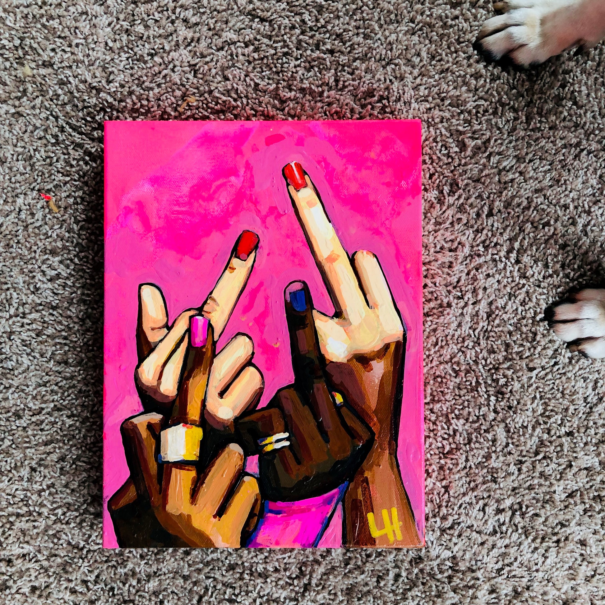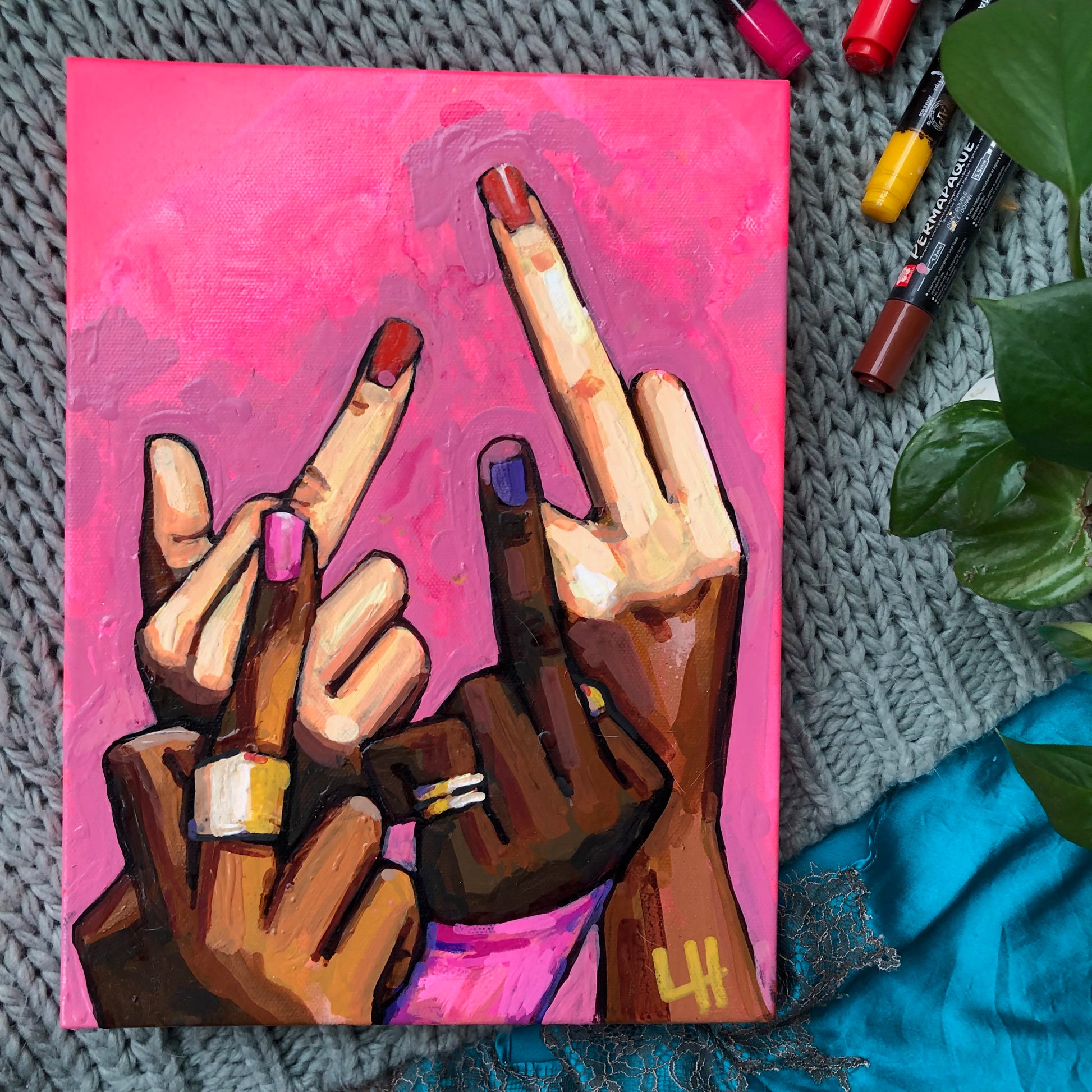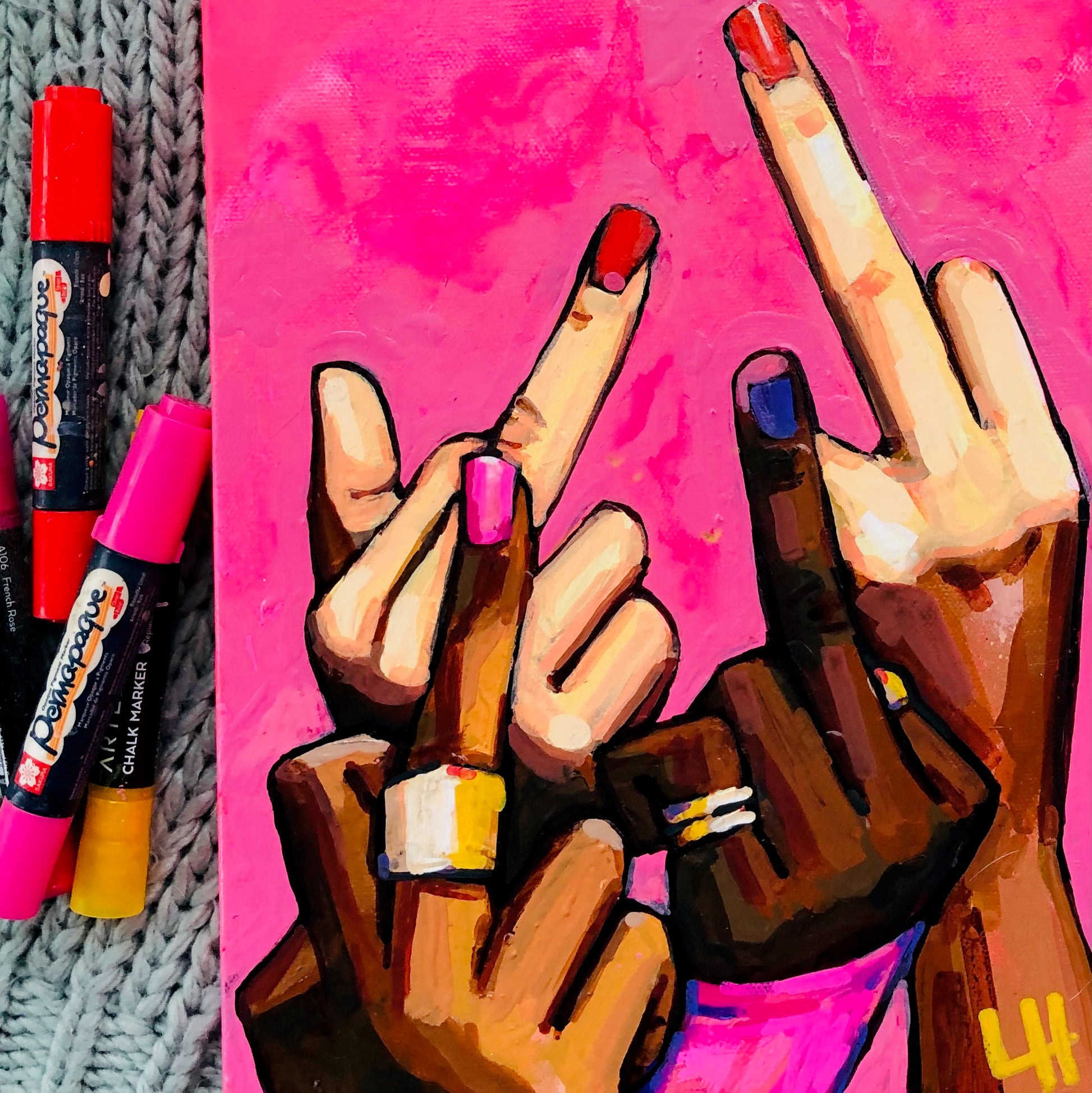 Painting middle fingers up in my art is an act of defiance, of reclaiming power from a patriarchal society and the oppressive structures it puts up. As a feminist, painting the middle finger is an act of protest and a proclamation of my autonomy over my body.
