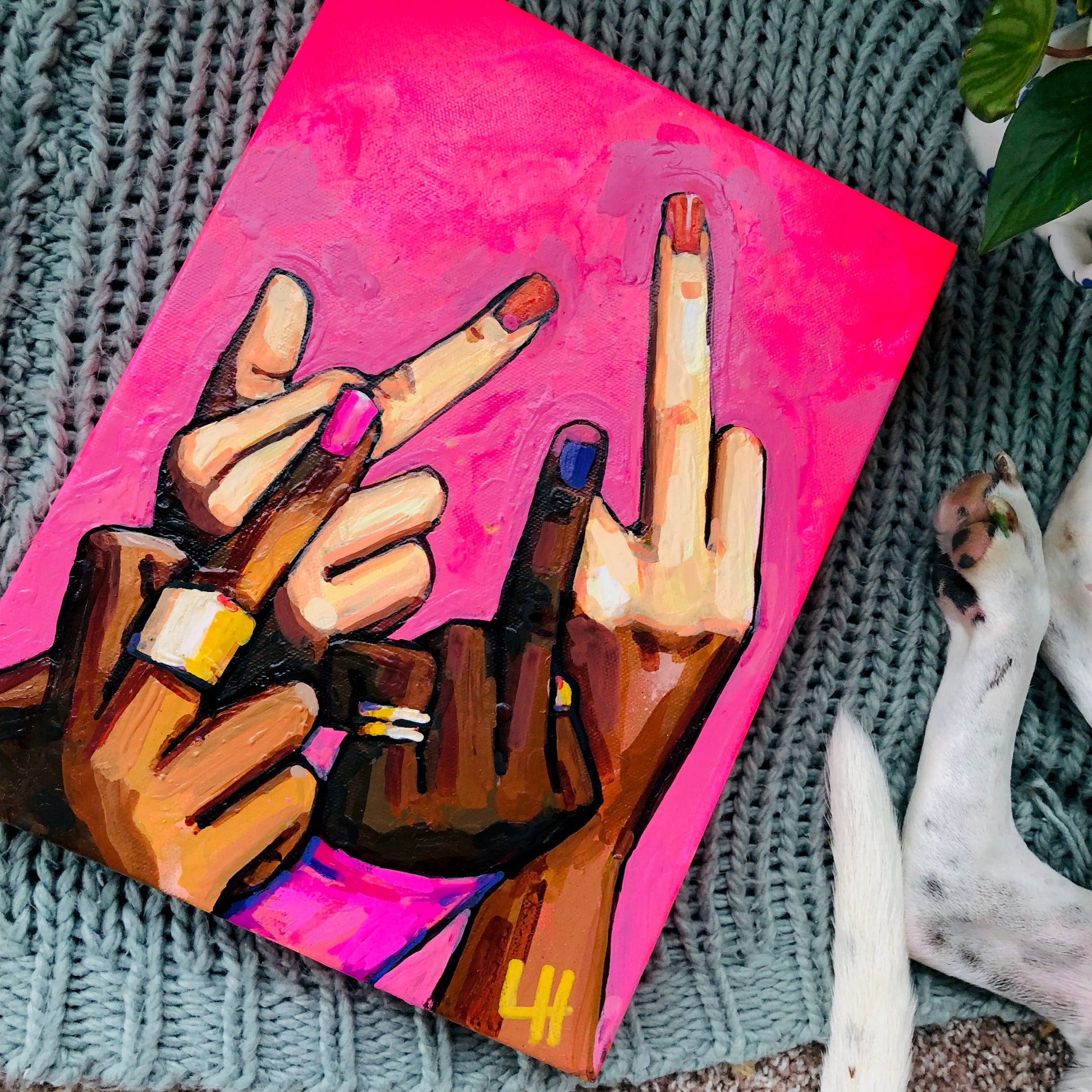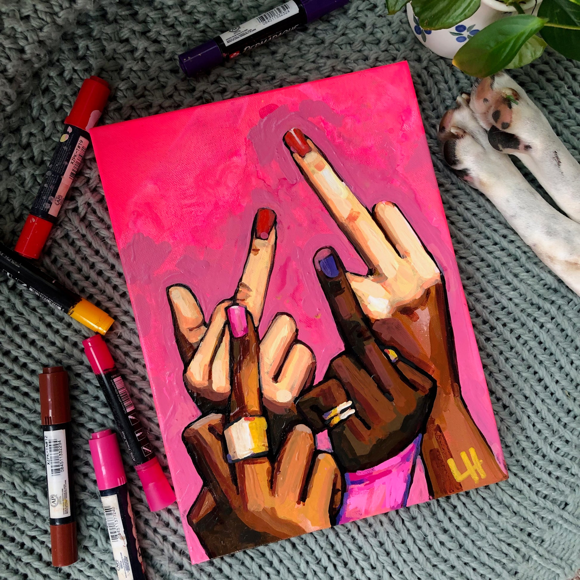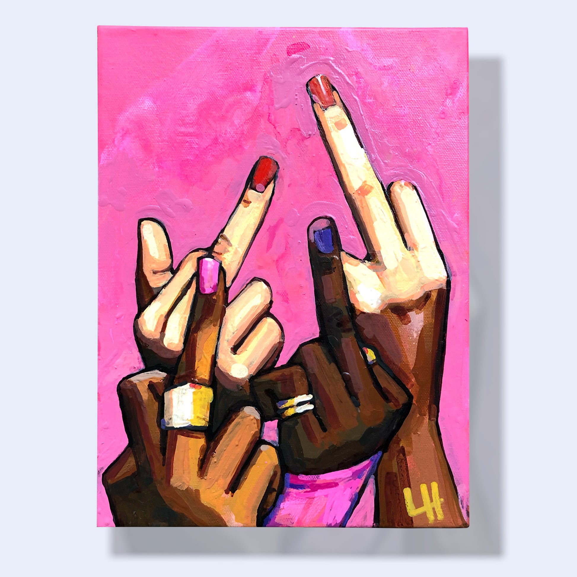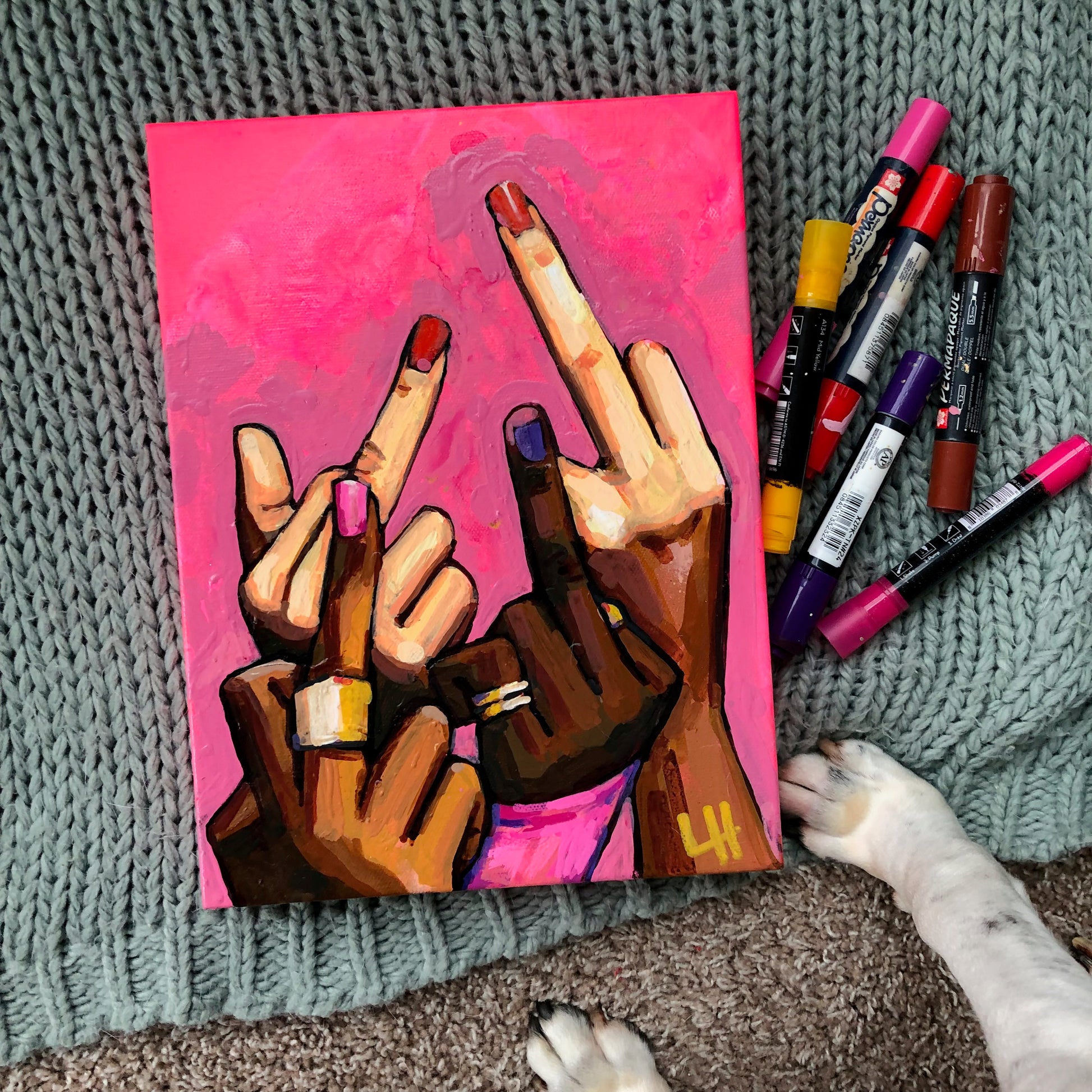 Painting middle fingers up in my art is an act of defiance, of reclaiming power from a patriarchal society and the oppressive structures it puts up. As a feminist, painting the middle finger is an act of protest and a proclamation of my autonomy over my body.