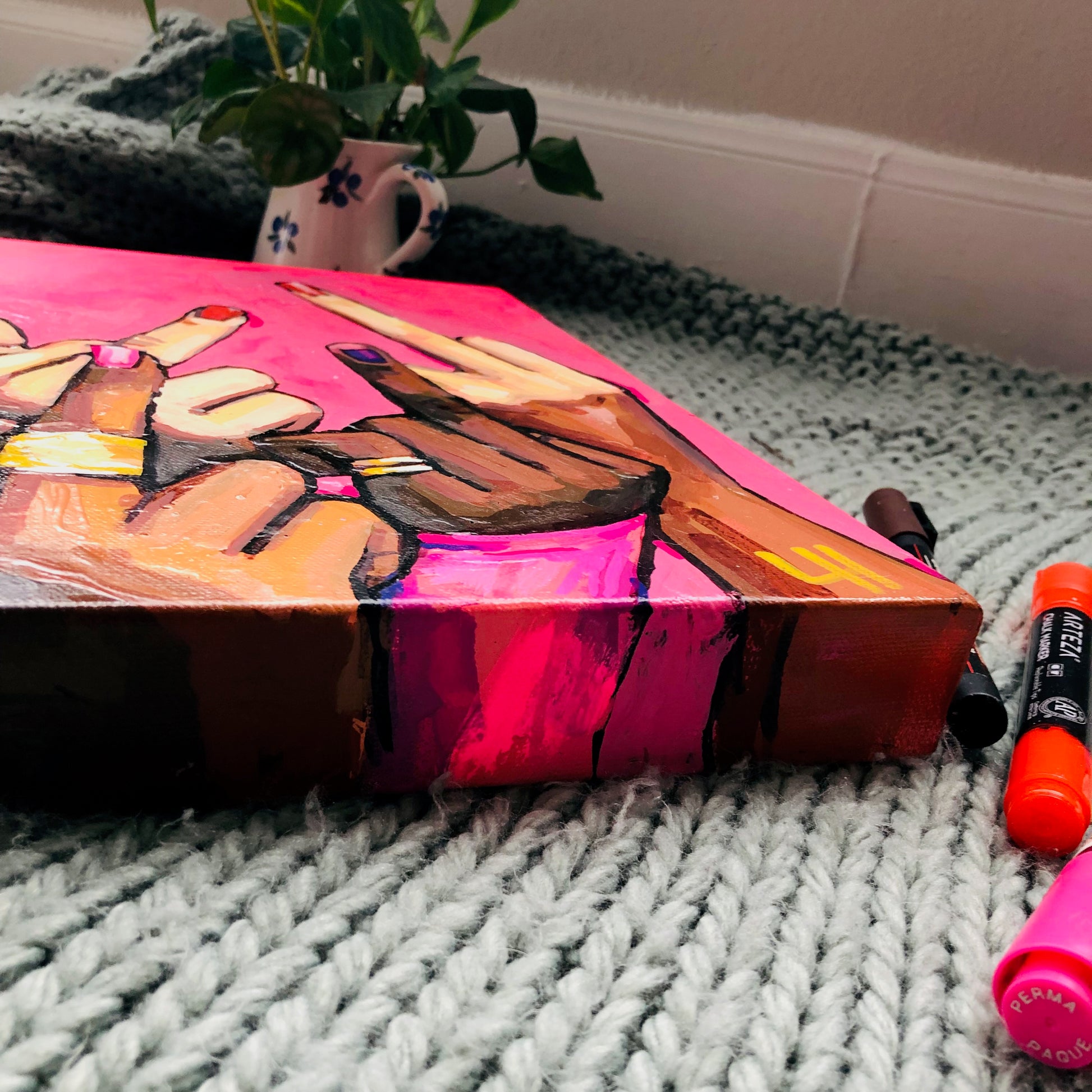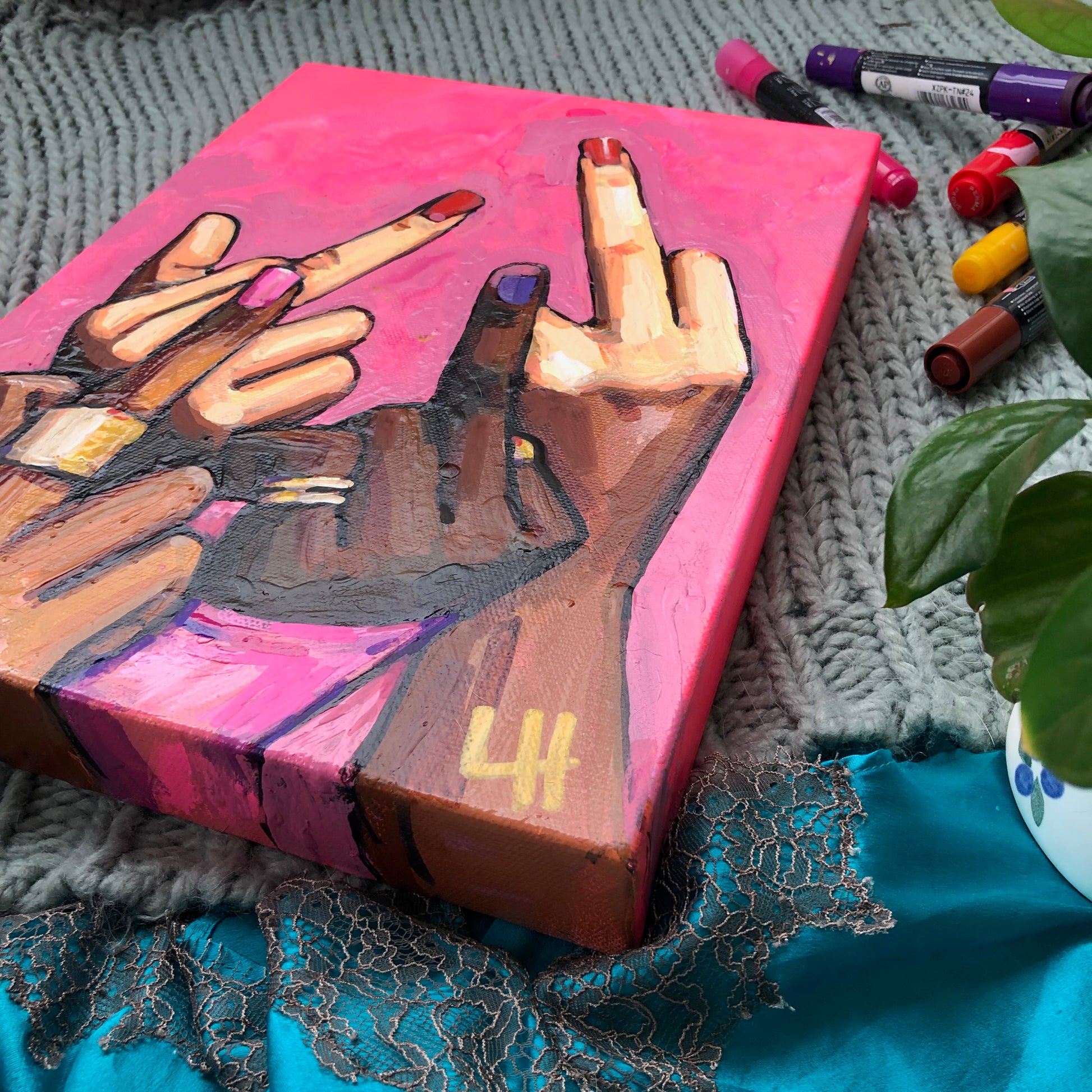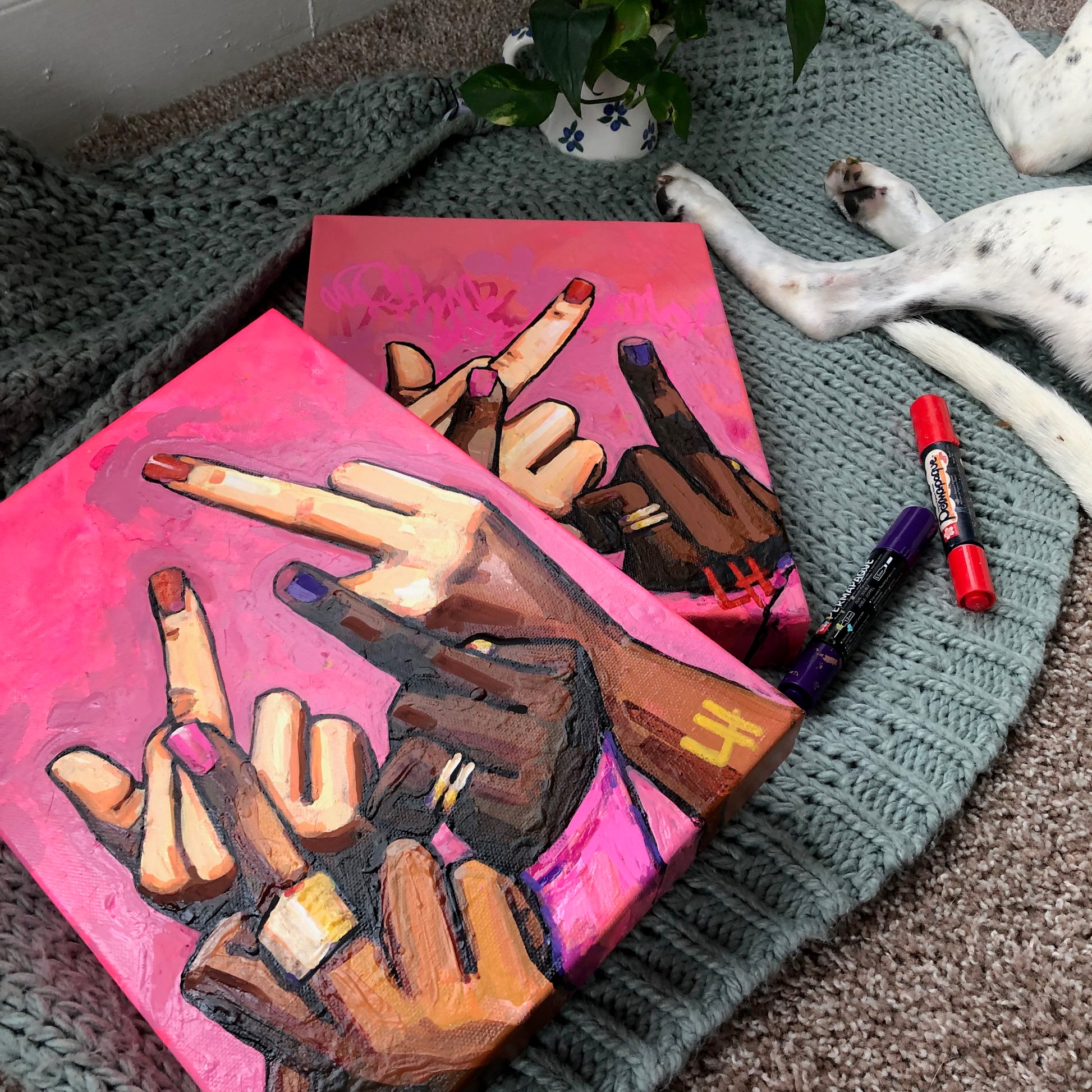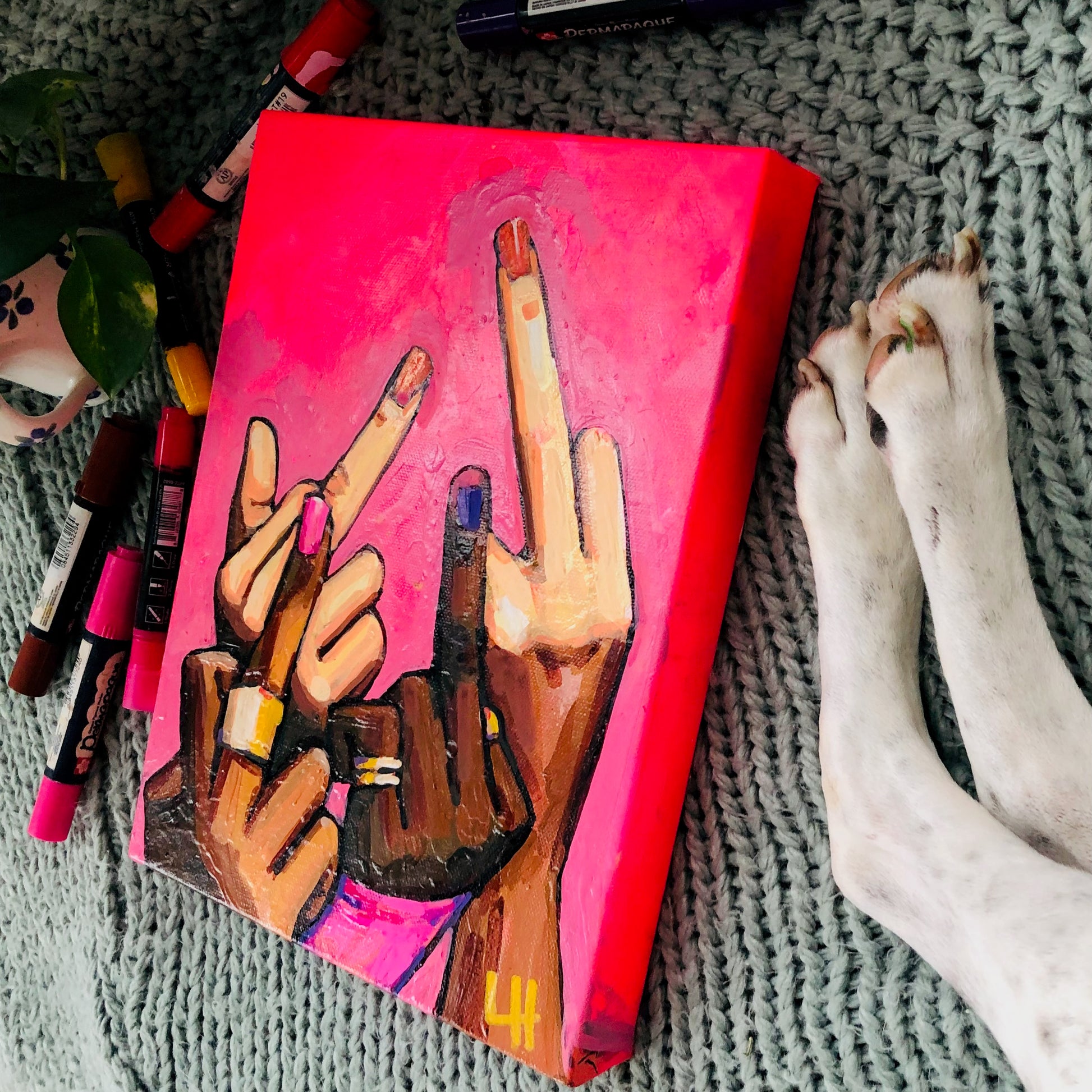 Painting middle fingers up in my art is an act of defiance, of reclaiming power from a patriarchal society and the oppressive structures it puts up. As a feminist, painting the middle finger is an act of protest and a proclamation of my autonomy over my body.