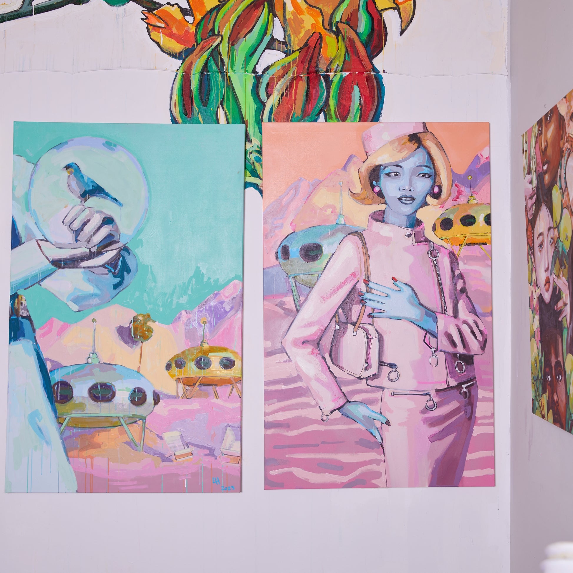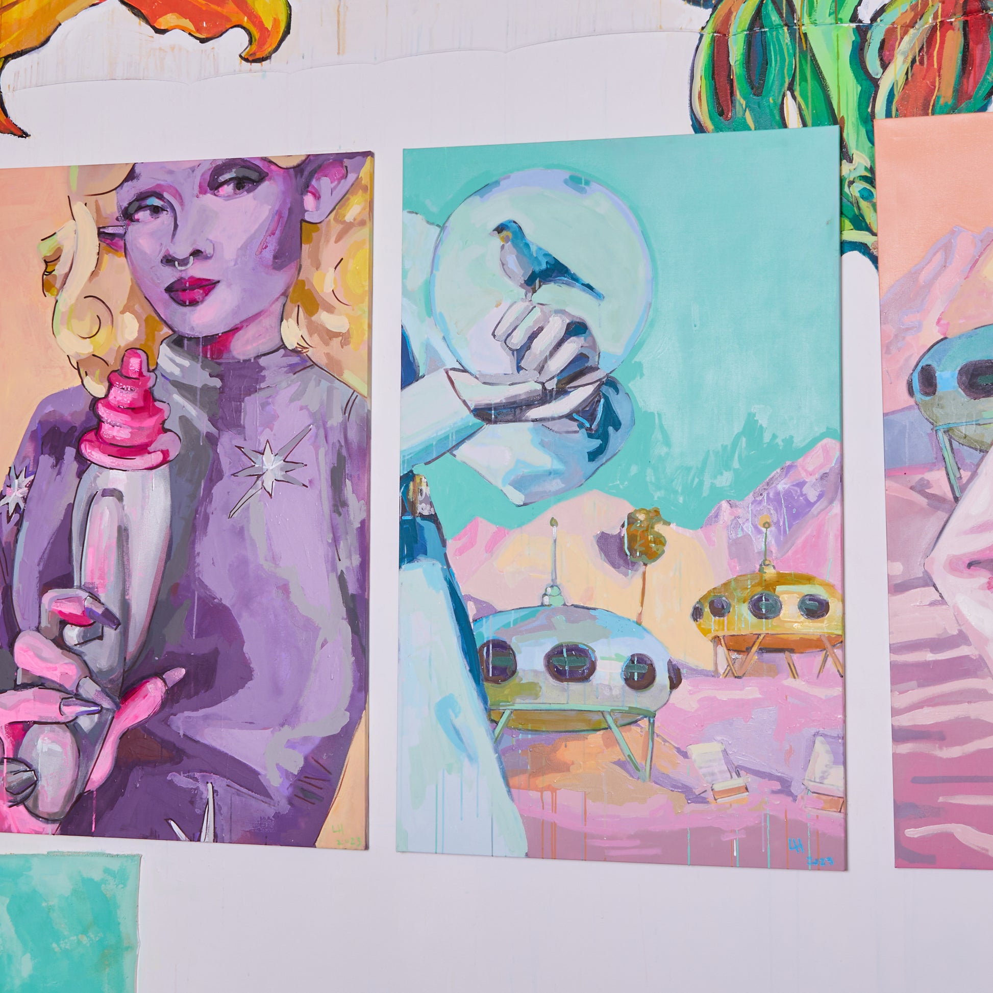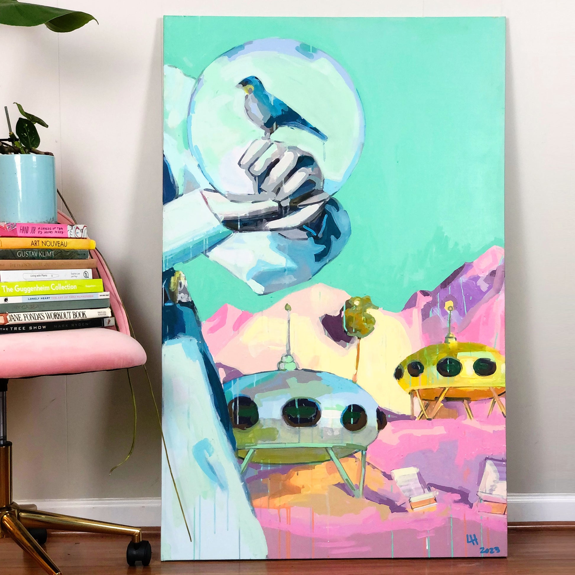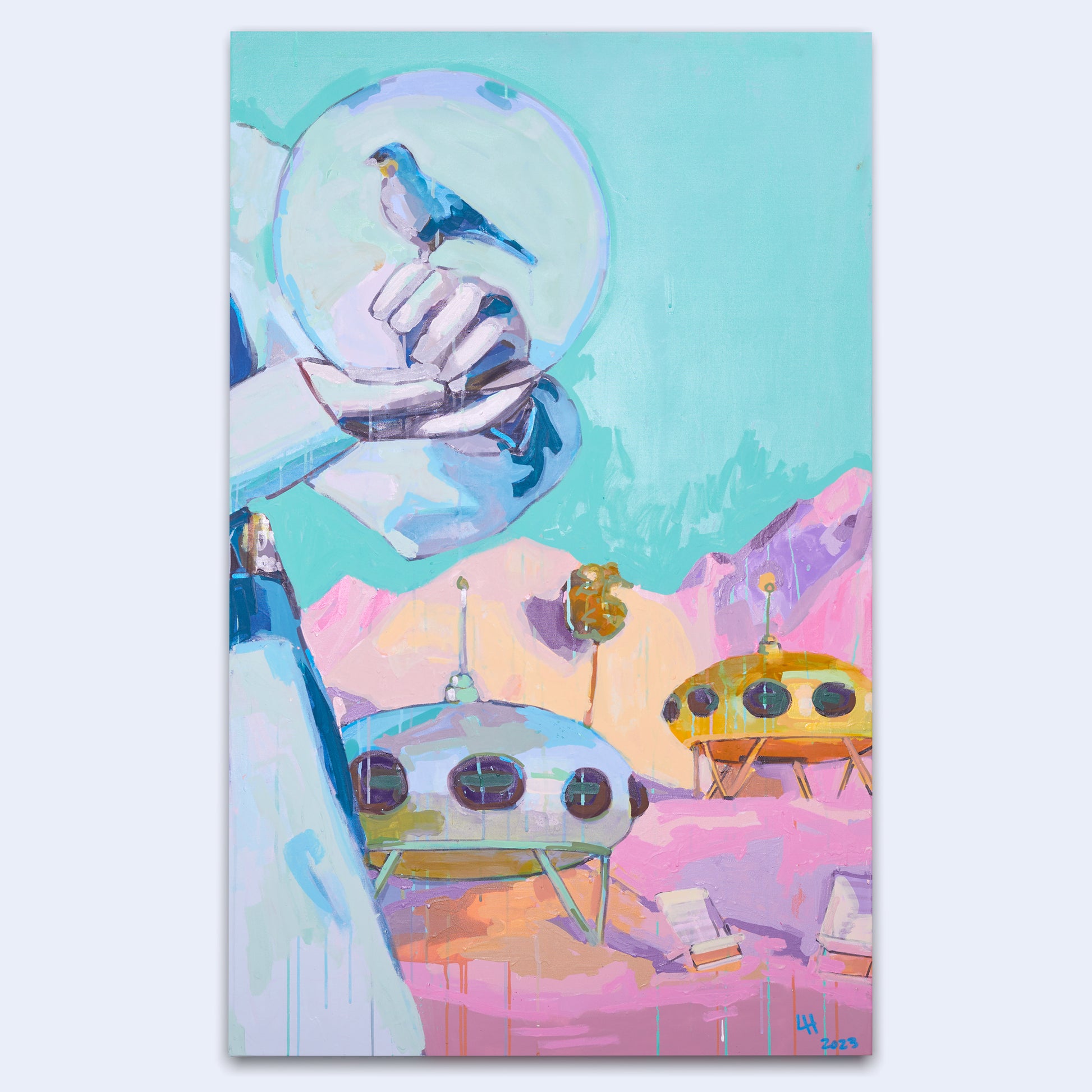 Liz Haywood's feminist futurescapes explore humanity's journey into space, questioning what we will take and leave behind. This artwork features drips, splatters, and rich textures built up through layers of latex and spray paint. With its playful mix of pastels, it brings a refreshing, bold look to a traditionally masculine theme.