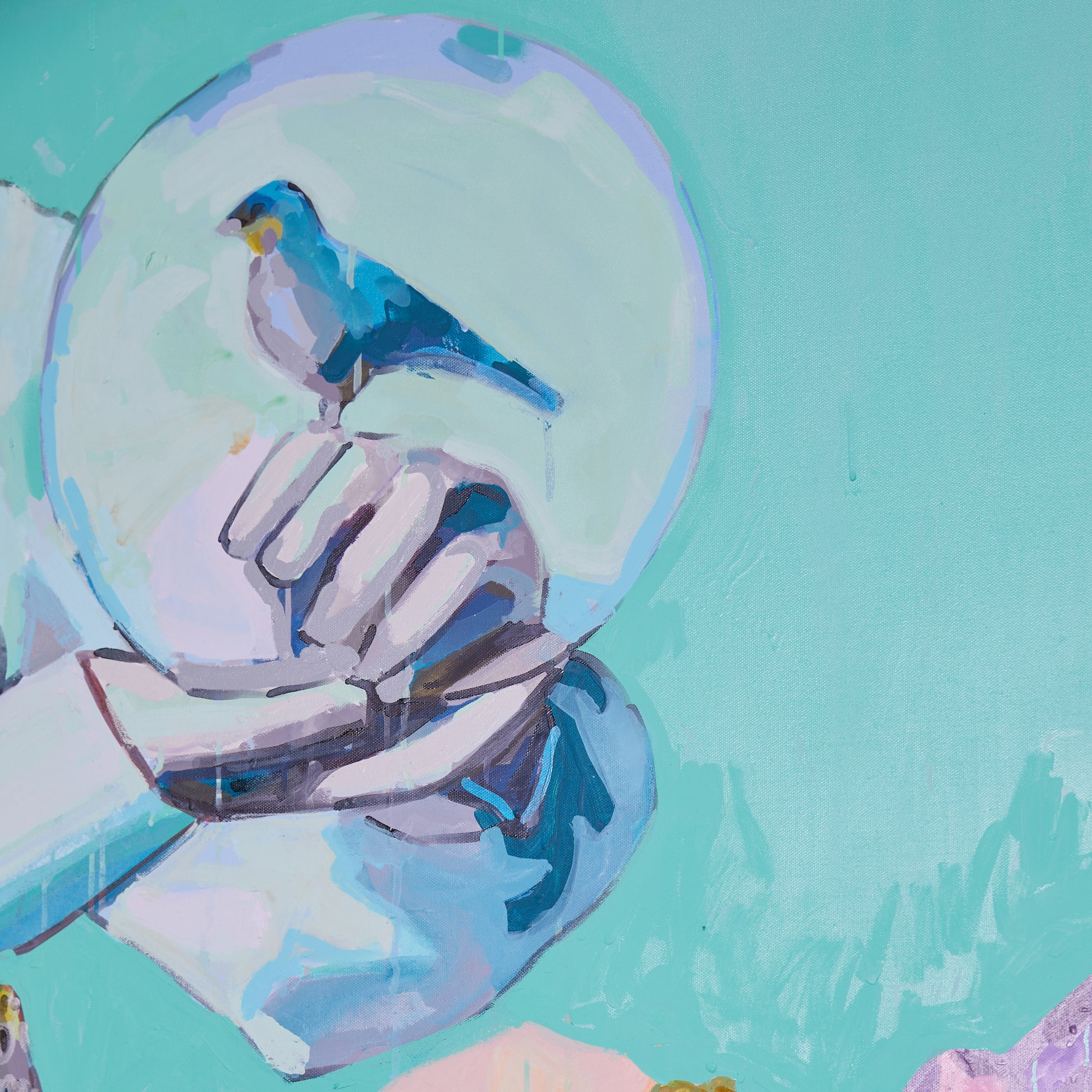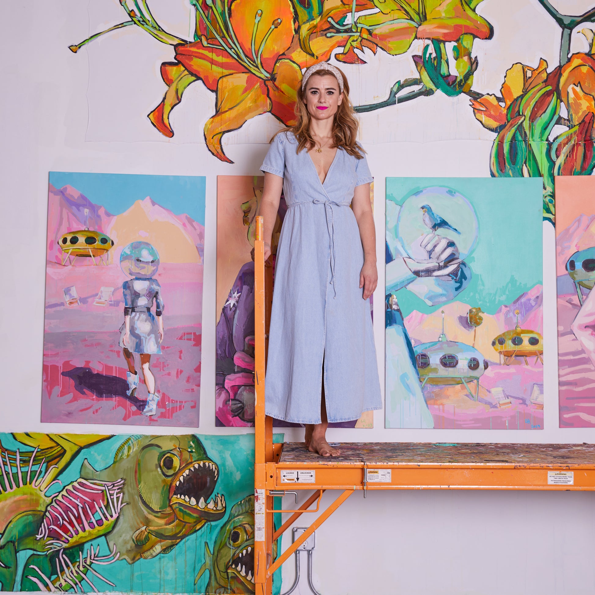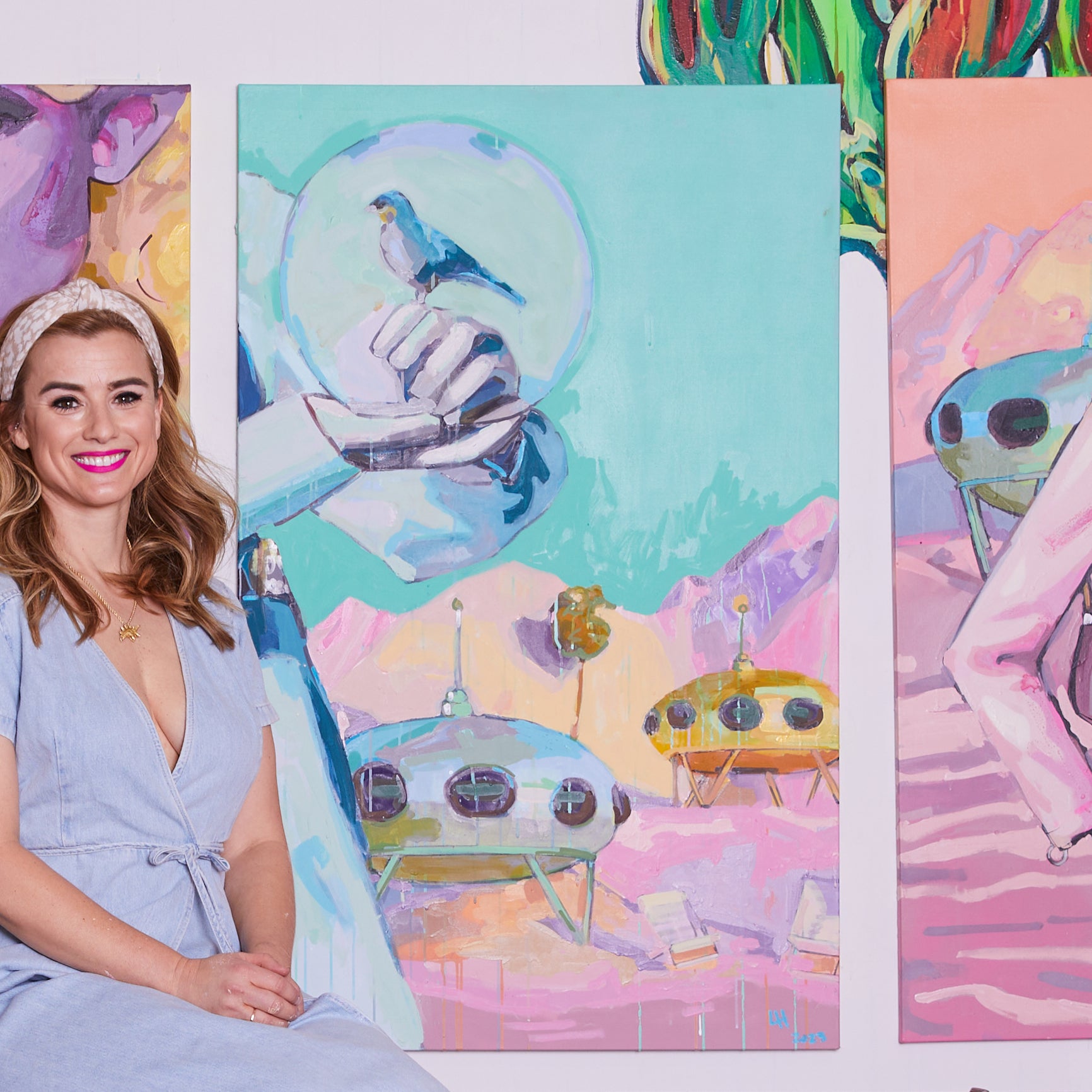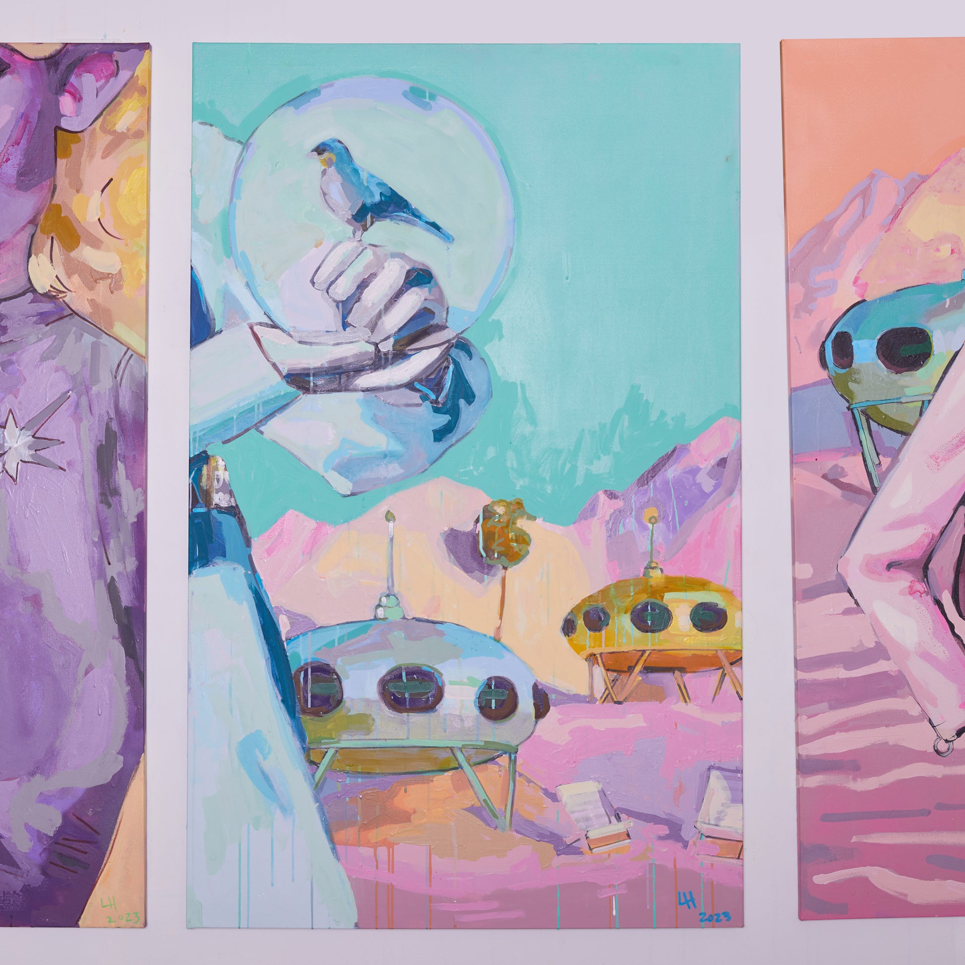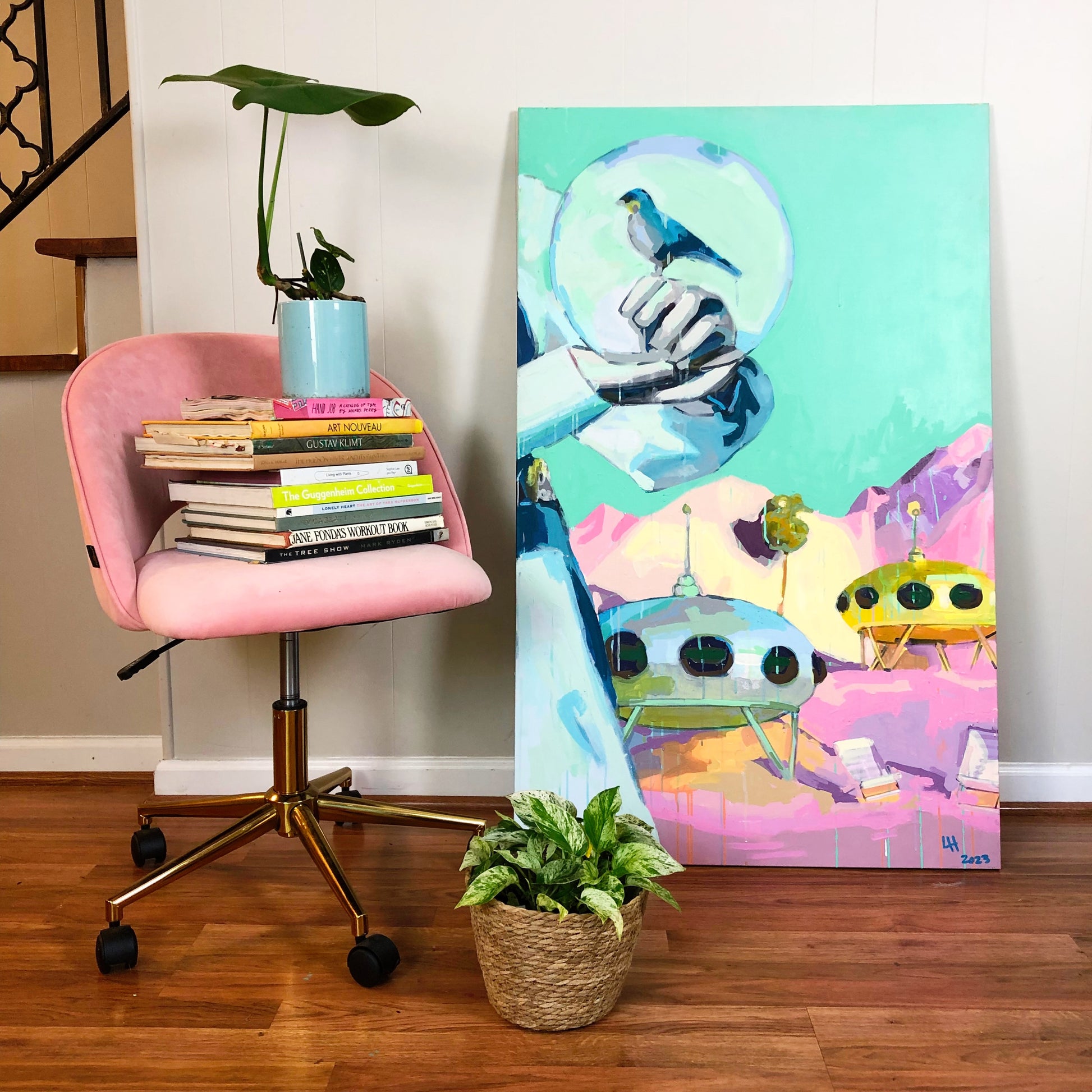 Liz Haywood's feminist futurescapes explore humanity's journey into space, questioning what we will take and leave behind. This artwork features drips, splatters, and rich textures built up through layers of latex and spray paint. With its playful mix of pastels, it brings a refreshing, bold look to a traditionally masculine theme.