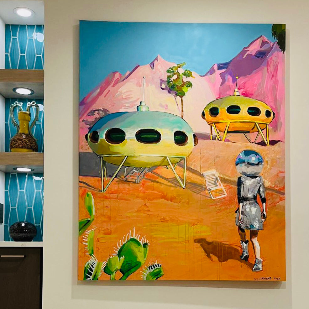 I often find myself wondering if we are alone in the universe. When we leave earth what will we bring with us and what will we leave behind? Through painting these feminist futurescapes I explore the vastness of the universe and wonder what our neighbors on other worlds will think of us. Space is the next frontier. My hope is that we learn from the mistakes of our past and venture out with open hearts and curious minds. Drips, splatters and rich texture in my art are created with layers of acrylic pen, latex and spray paint. With confident, free gestural strokes I build layers of texture. By using a palette of gentle pastels I bring an updated feel to a subject often seen through a masculine lens.