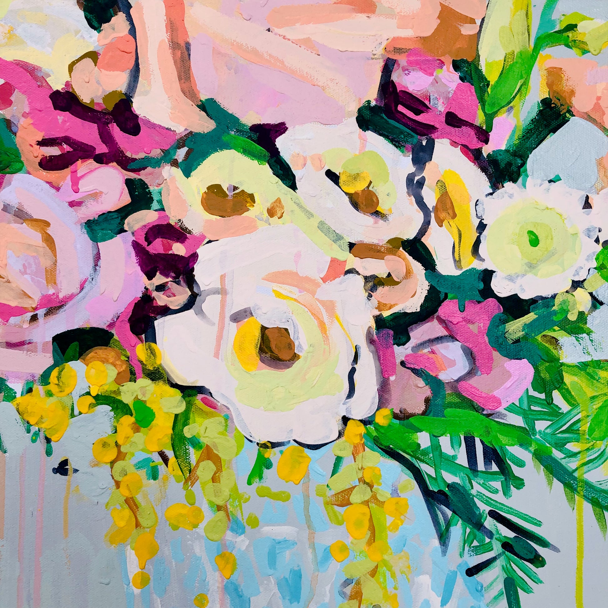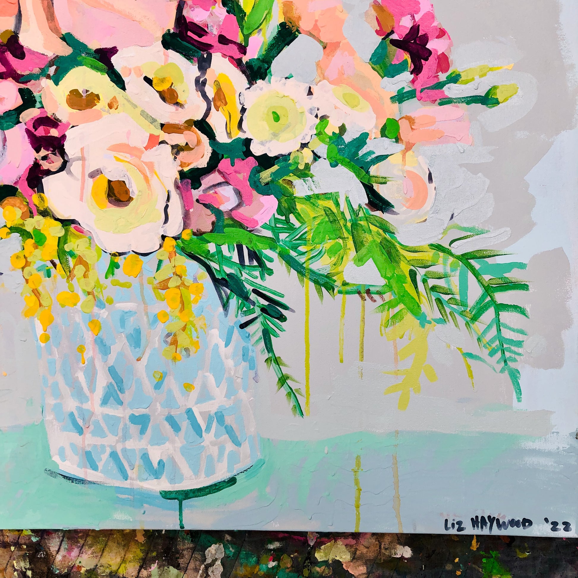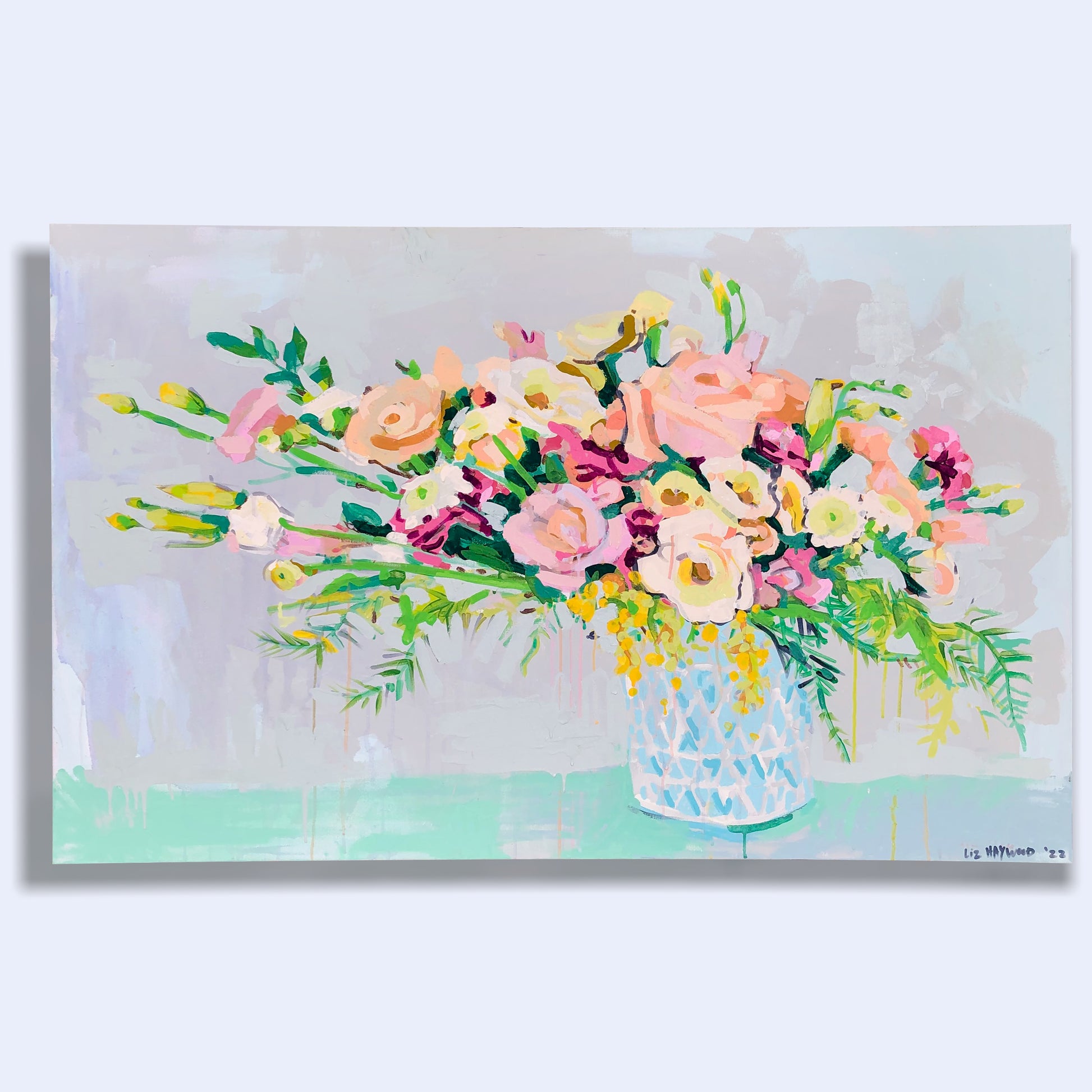 When you purchase Liz Haywood's artwork you are getting a piece of representational fine art on top of an abstract piece. Notice the subtle abstract painting under this vase of lush greenery and blooms. There are washes of dove gray, pale blueberry and aqua blended with hues of natural ceramic.