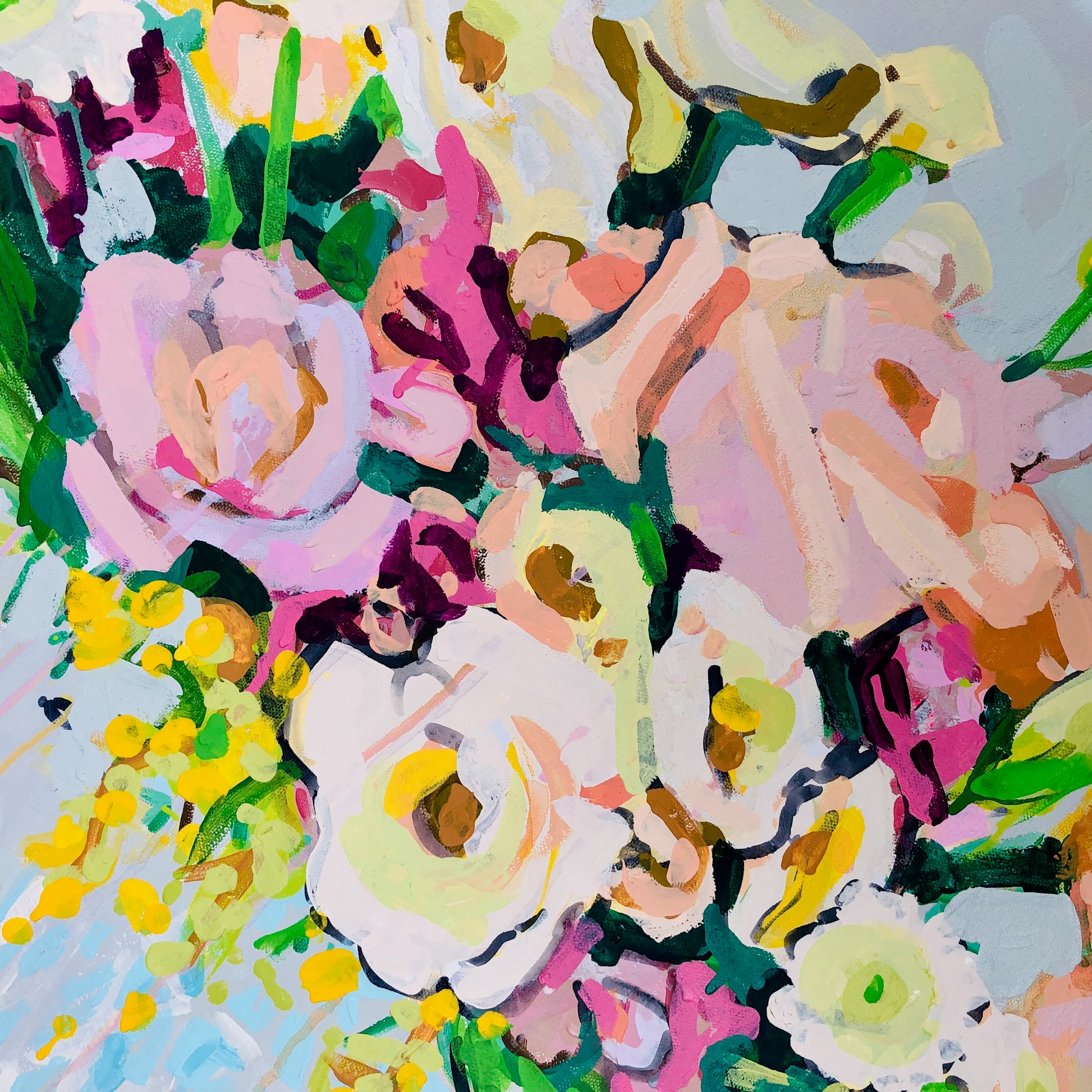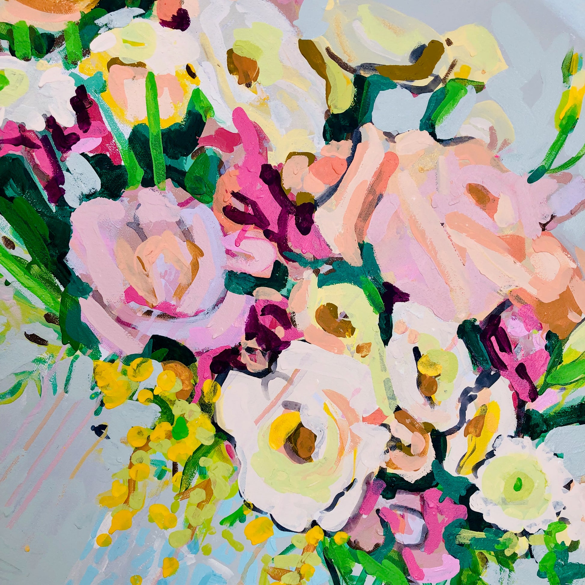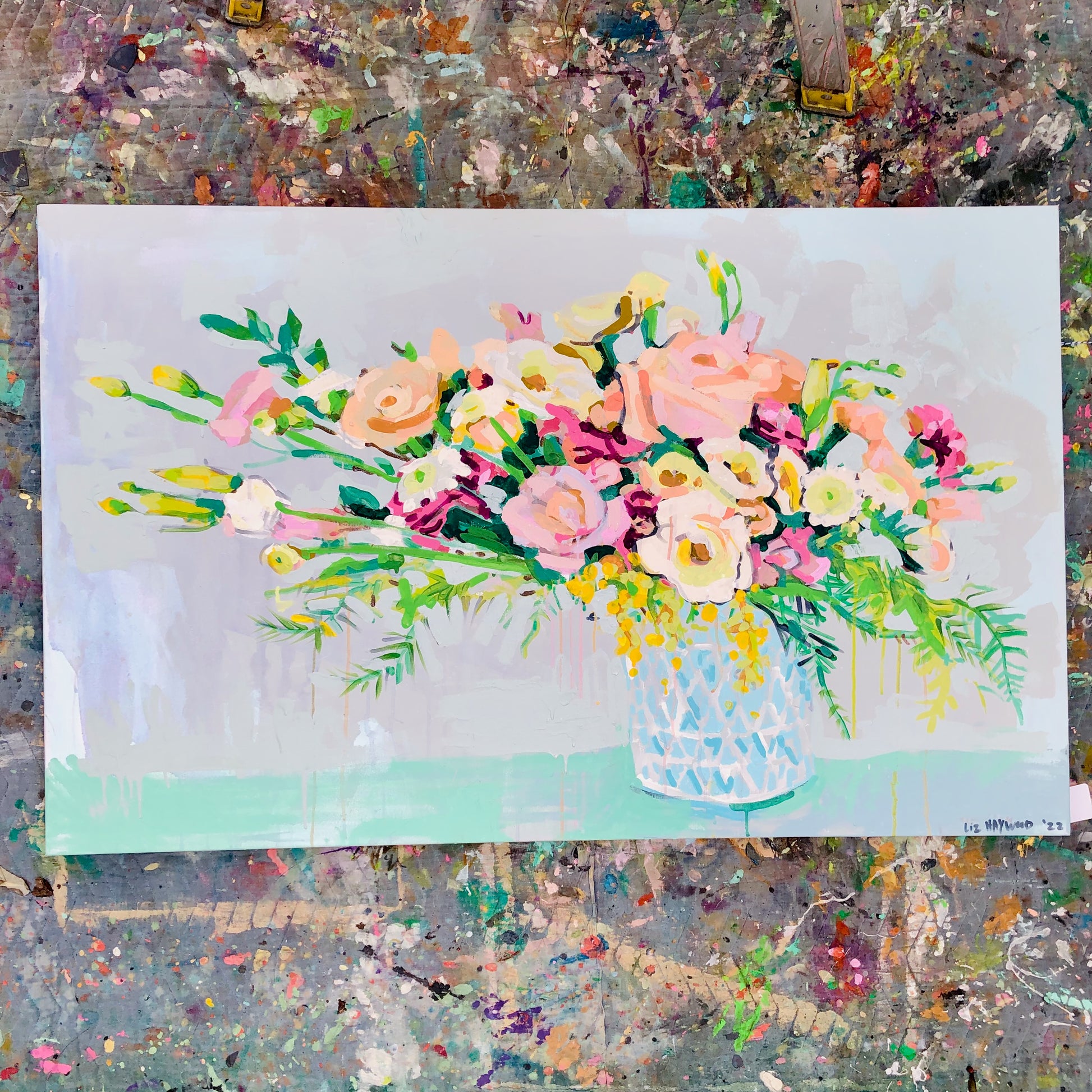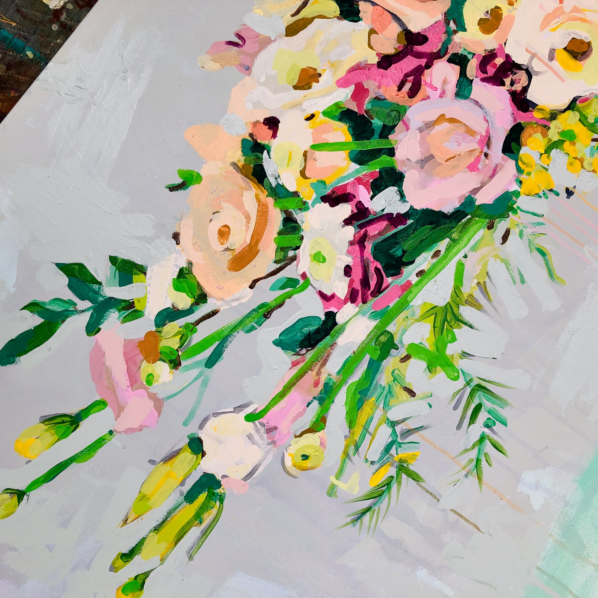 When you purchase Liz Haywood's artwork you are getting a piece of representational fine art on top of an abstract piece. Notice the subtle abstract painting under this vase of lush greenery and blooms. There are washes of dove gray, pale blueberry and aqua blended with hues of natural ceramic.