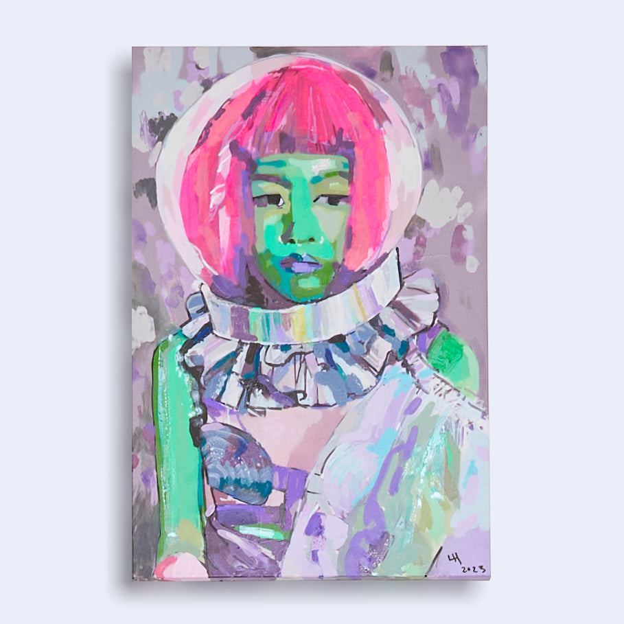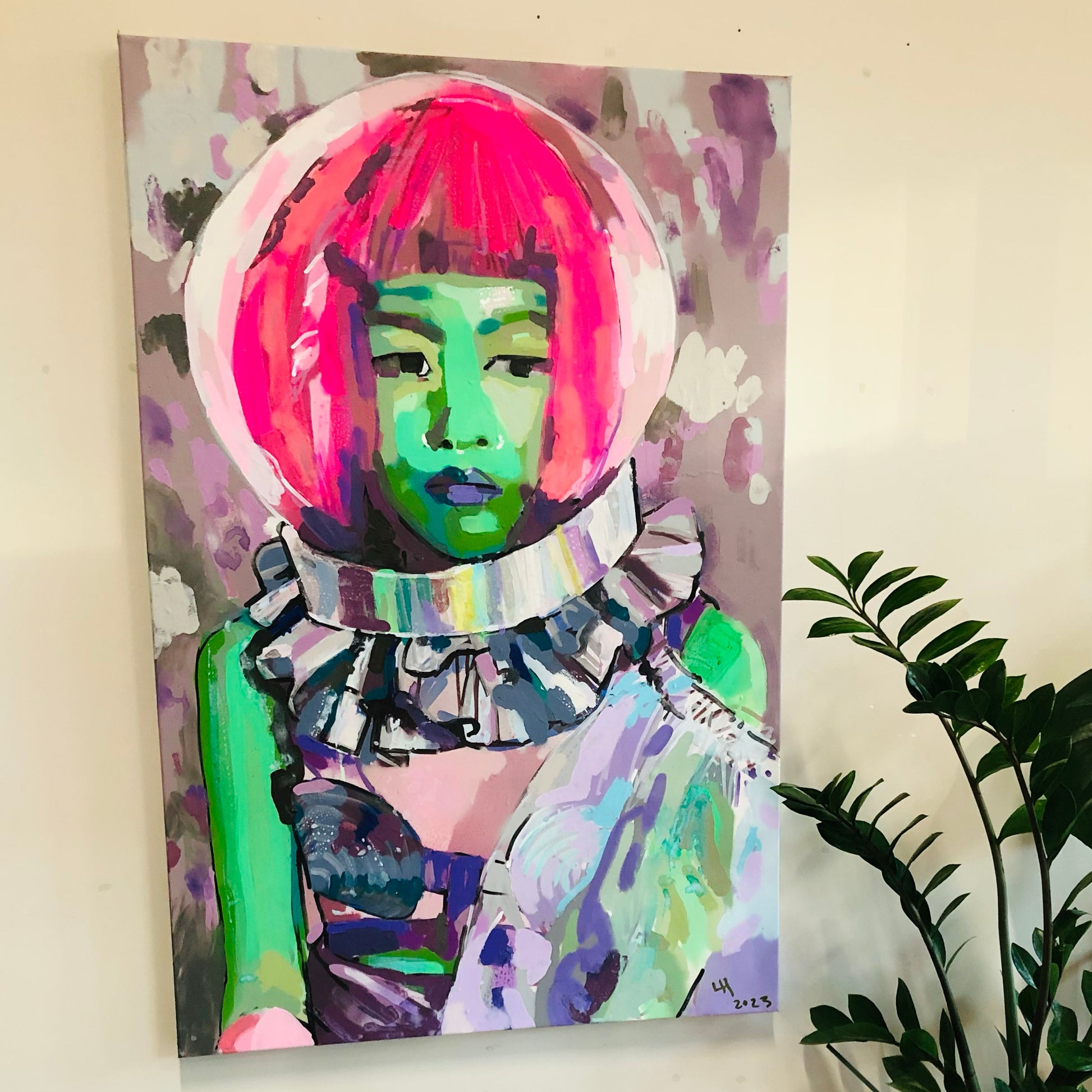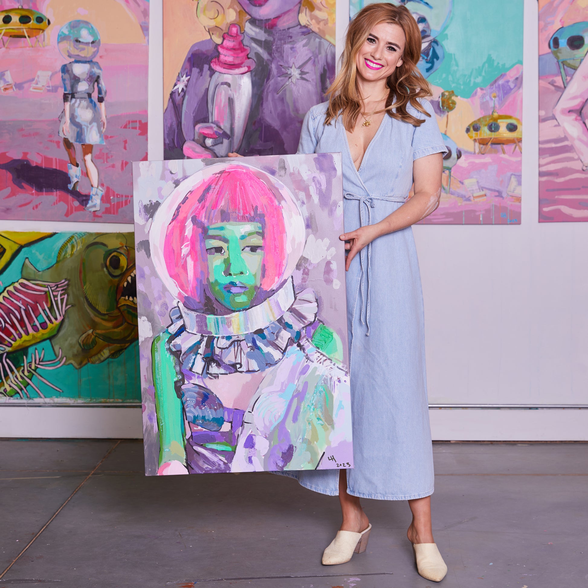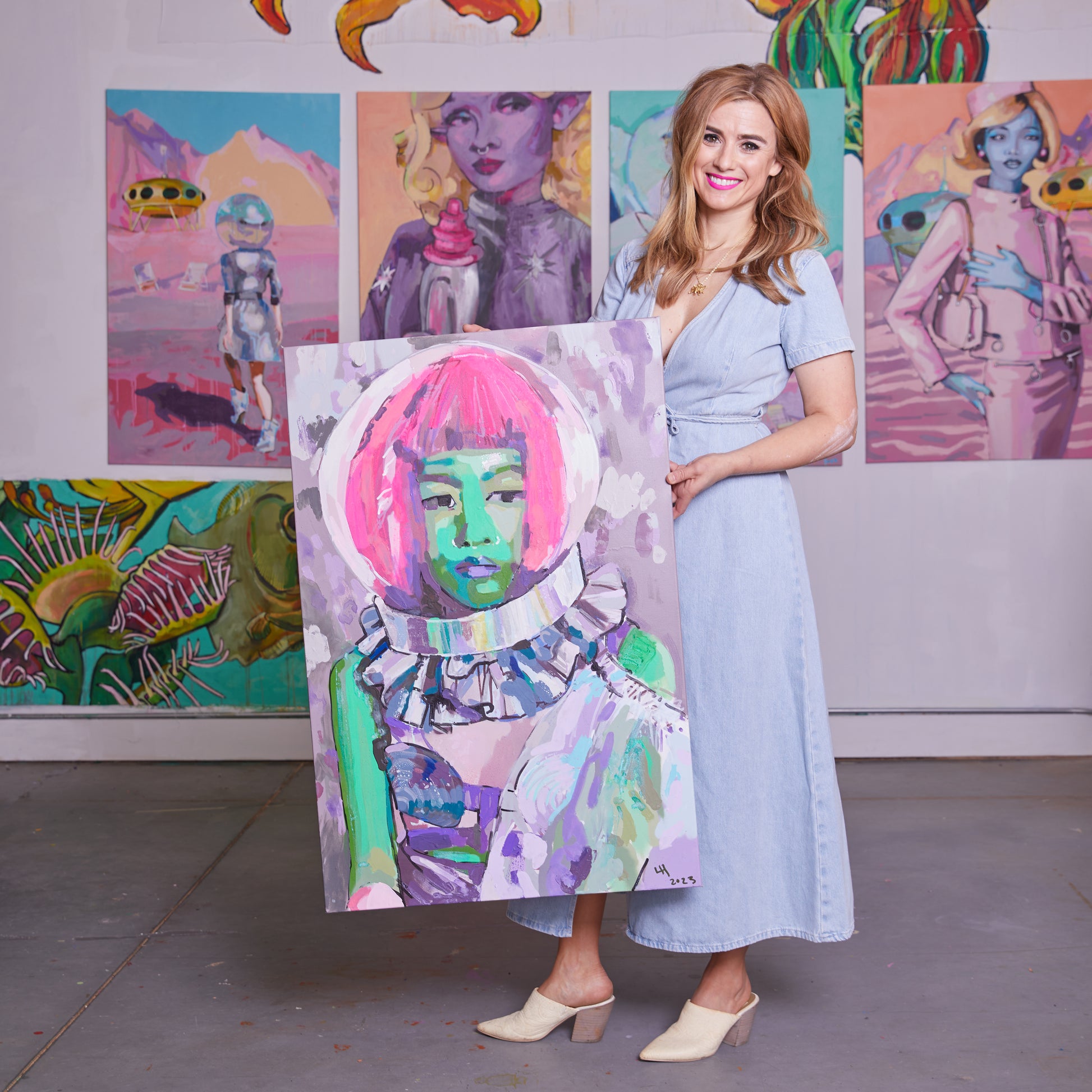 I often find myself wondering if we are alone in the universe. When we leave earth what will we bring with us and what will we leave behind? Through painting these feminist futurescapes I explore the vastness of the universe and wonder what our neighbors on other worlds will think of us. Space is the next frontier. My hope is that we learn from the mistakes of our past and venture out with open hearts and curious minds. Drips, splatters and rich texture in my art are created with layers of acrylic pen, latex and spray paint. With confident, free gestural strokes I build layers of texture. By using a palette of gentle pastels I bring an updated feel to a subject often seen through a masculine lens.