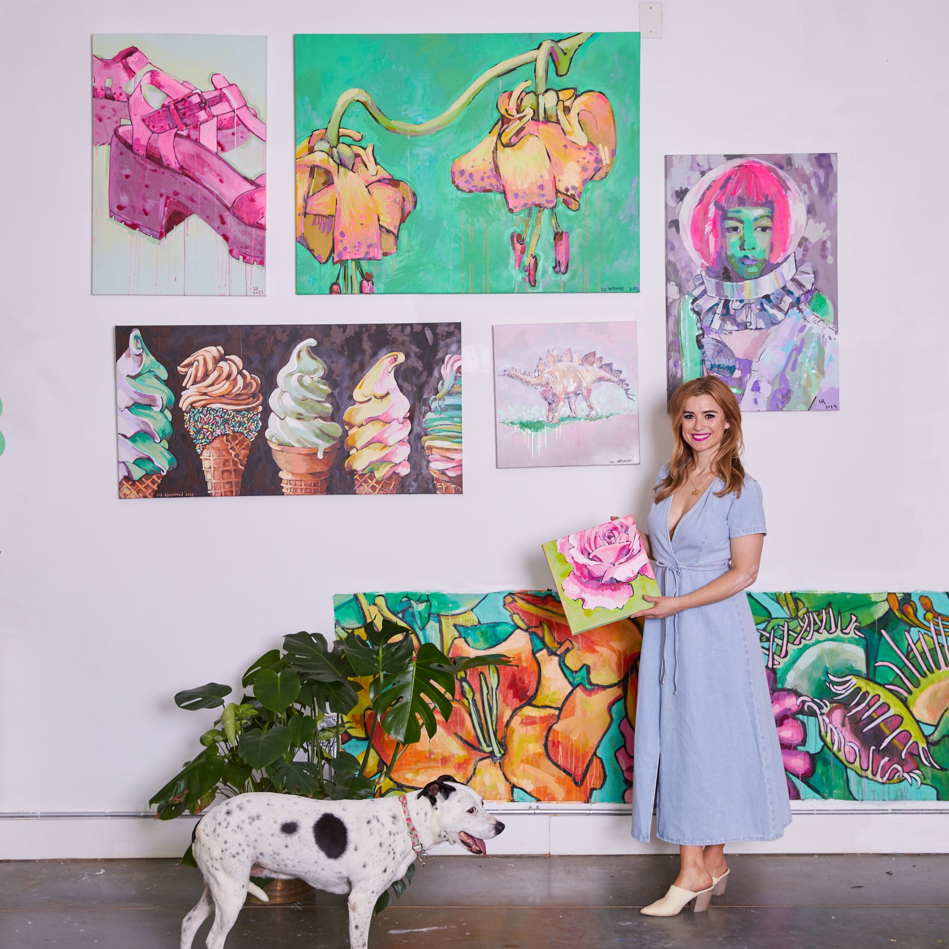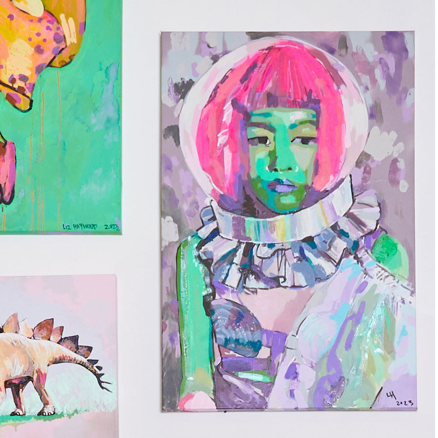 Do you need a little life and fun in your home or office? Vibrant colors permeate the art of Charlotte native Liz Haywood. Liz graduated from Appalachian State University and then attended the Portfolio Center in Atlanta. She completed her studies winning several student awards. Liz was attracted to the professional challenge of working in New York. She worked primarily as a graphic artist in Manhattan for seven years. After attaining the position as head of graphic design for the popular shoe brand, Dolce Vita, she focused on establishing herself as an independent artist. Returning to the south, she developed a steady demand for her art through social media and local showings. In Atlanta, she painted several murals in public spaces to voice her social concerns. After relocating to Charlotte, Liz created a body of work for festivals and arts shows, including Bethesda Art Row and The Festival in The Park. She was awarded an Honorable Mention by SouthEnd Arts and the Brooklyn Collective in 2021. That year Liz was also accepted into a mural residency program by Brand the Moth, where she completed her capstone mural at Lenny Boy Brewing Company. Liz’s work is now being displayed nationwide after being juried into the ArtPop class of 2022.