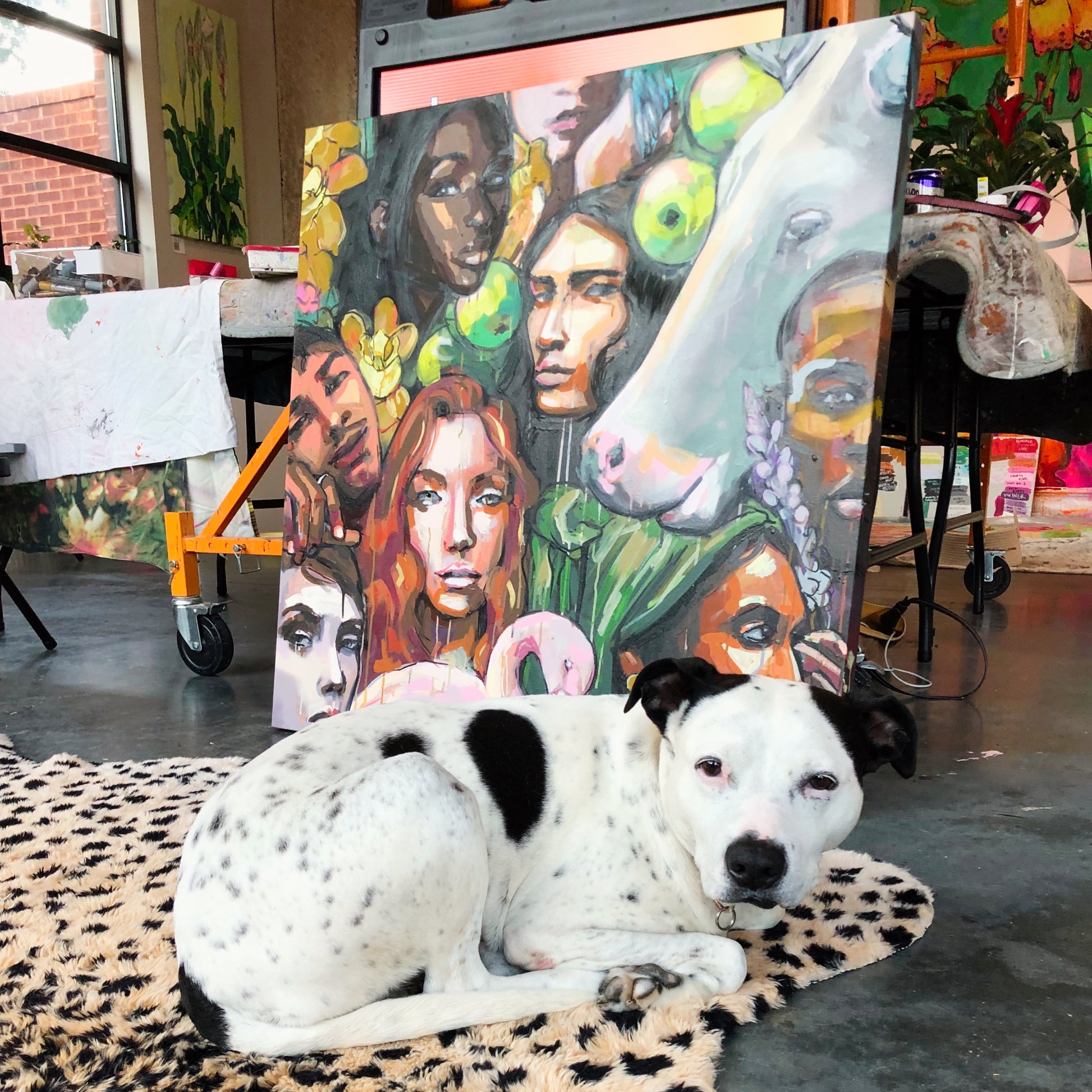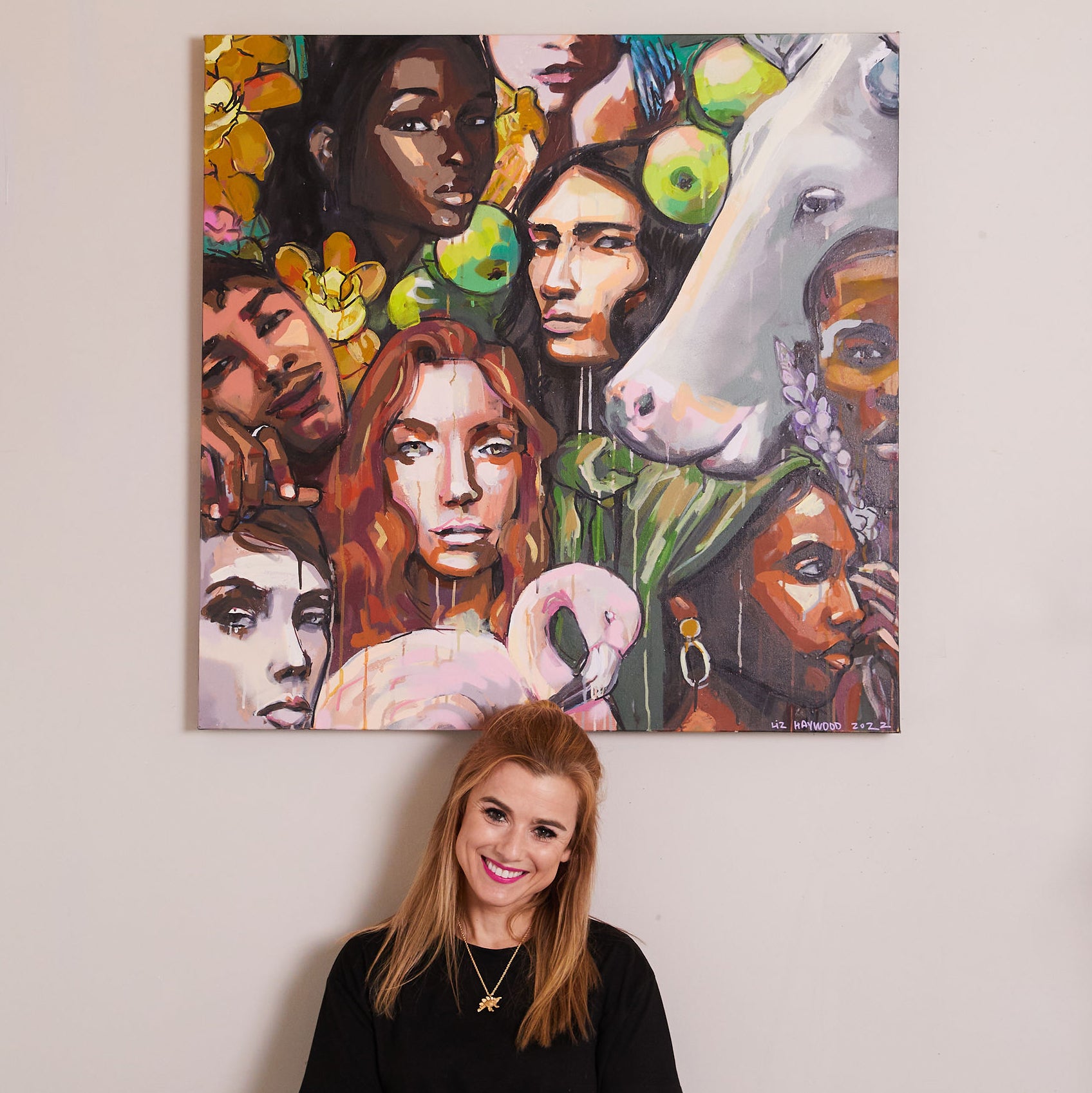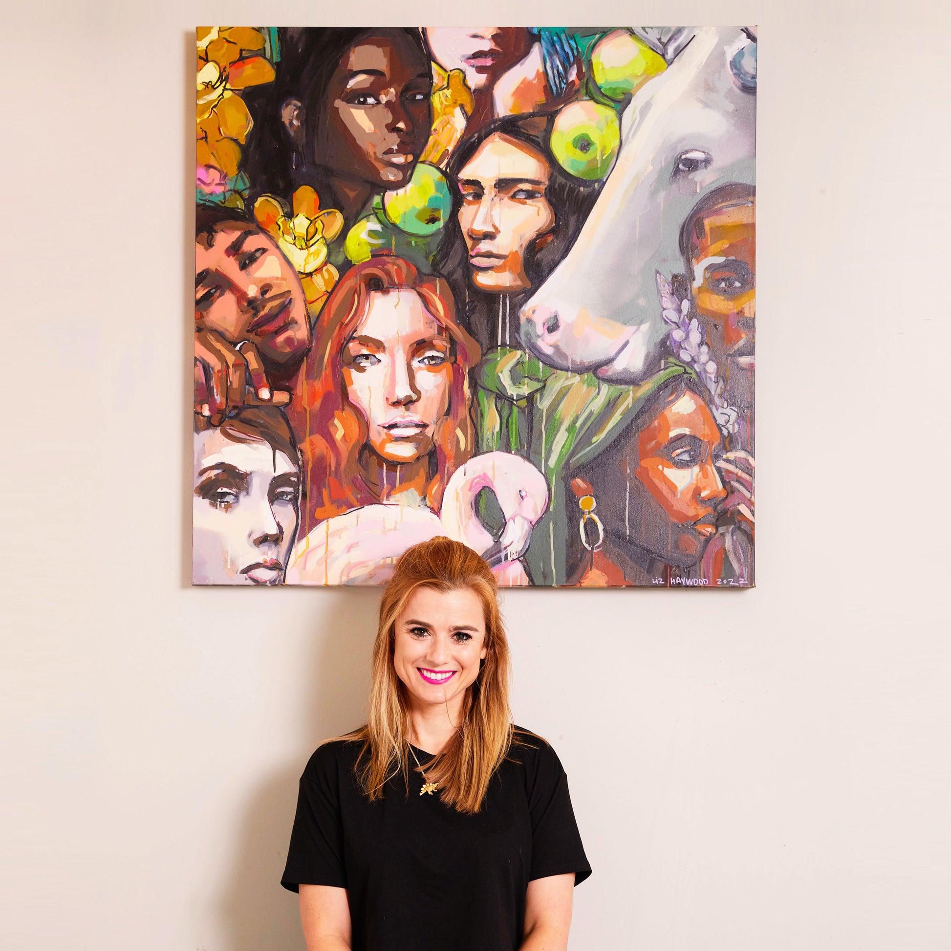 This striking 36” x 36” canvas painting by Liz Haywood captures an intimate blend of human faces and vibrant flora, intertwined with surreal elements like the presence of a majestic white cow. Crafted using spray paint, acrylic pen, latex paint, and gouache, this artwork offers a rich depth of texture and color, bringing each face and detail to life. The harmonious mix of skin tones and natural elements makes this piece an exploration of beauty, diversity, and connection.
