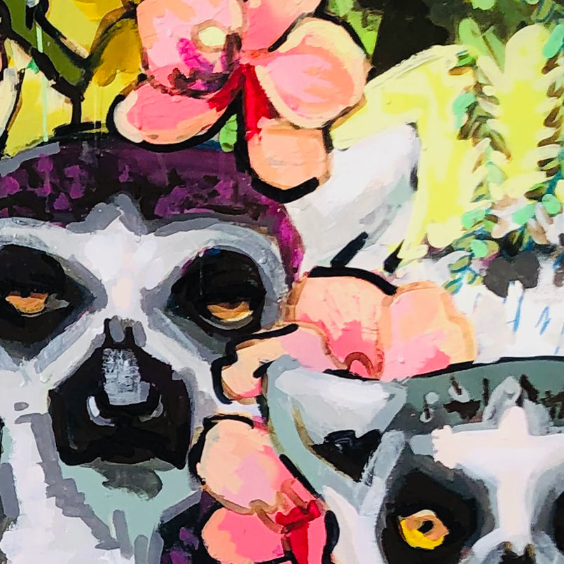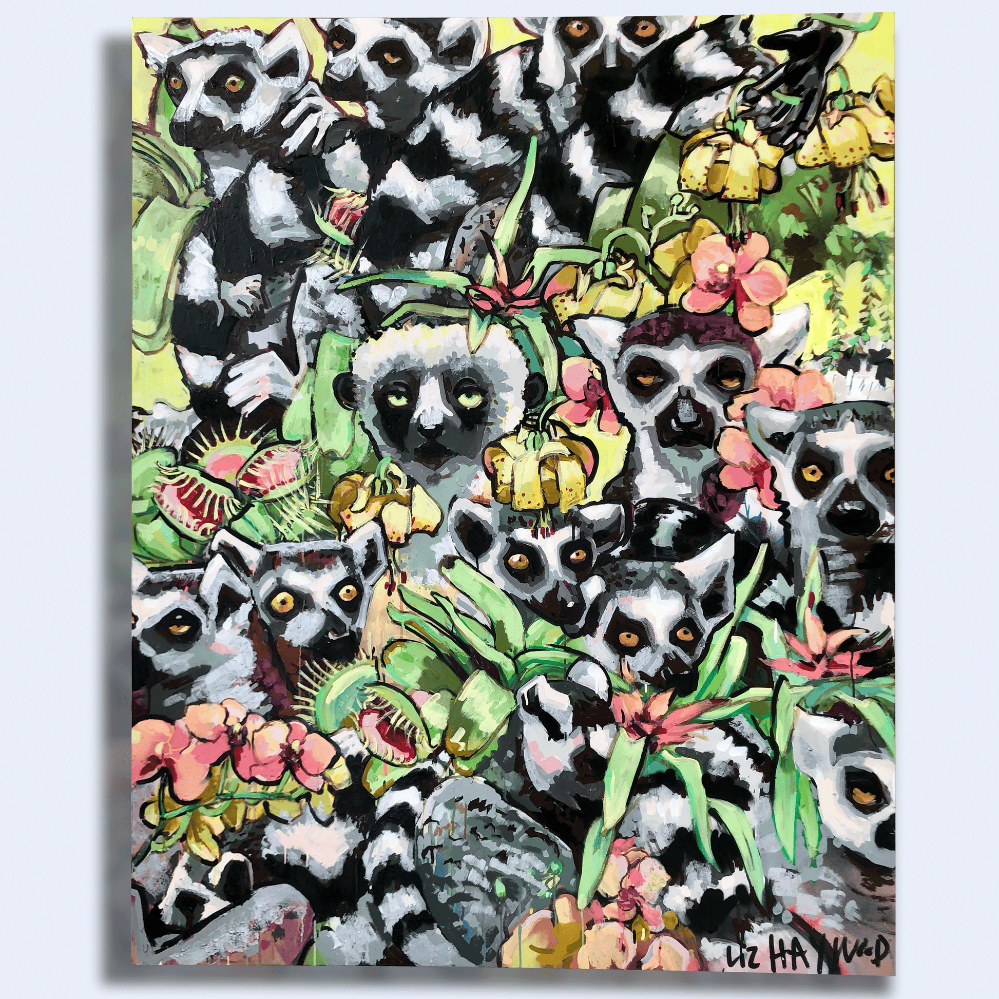 Tropical flowers and venus fly trap plants climb up a mossy tree bark. A whole gang of best lemur buds also hang onto the tree trunk. The animals are snuggled together in their jungle home.