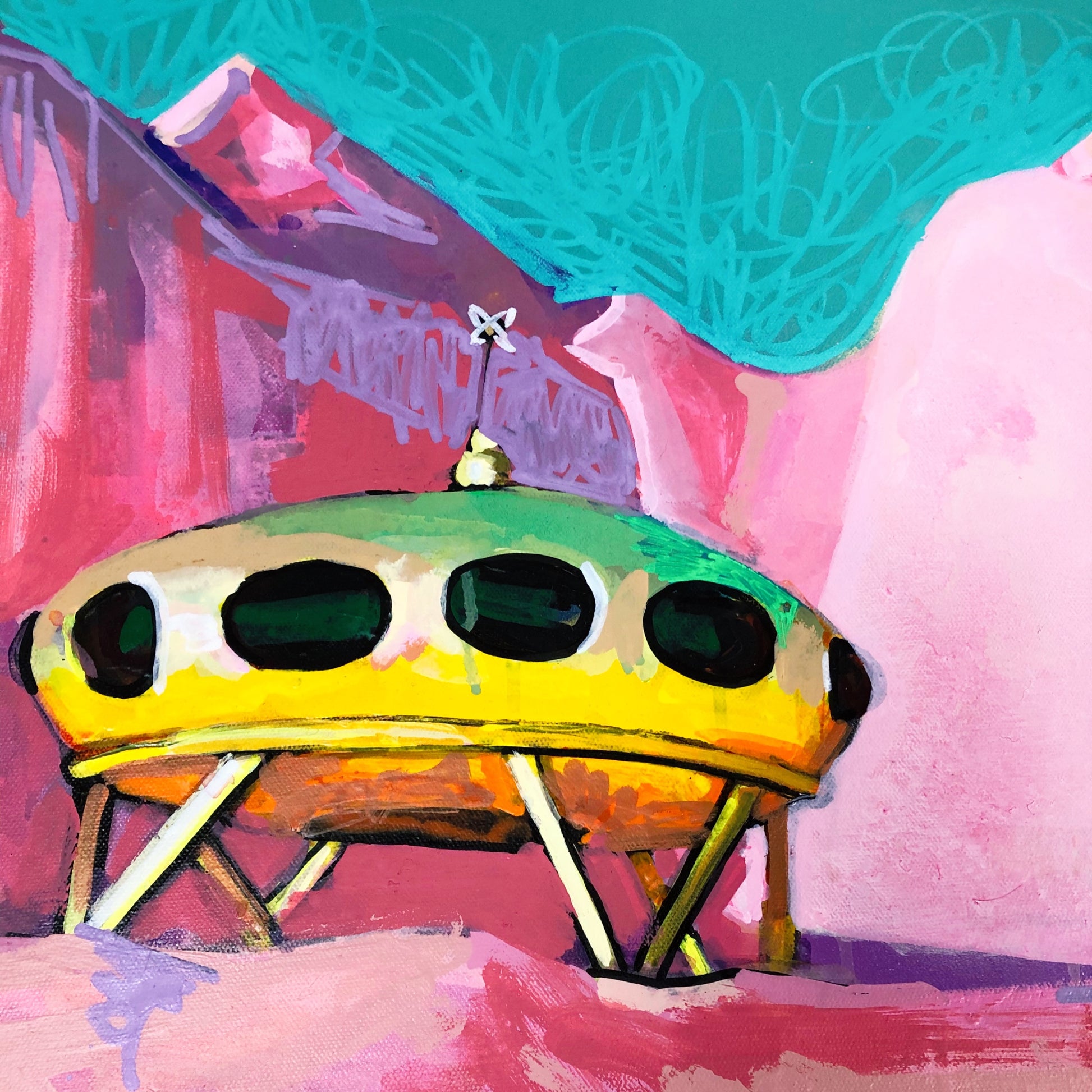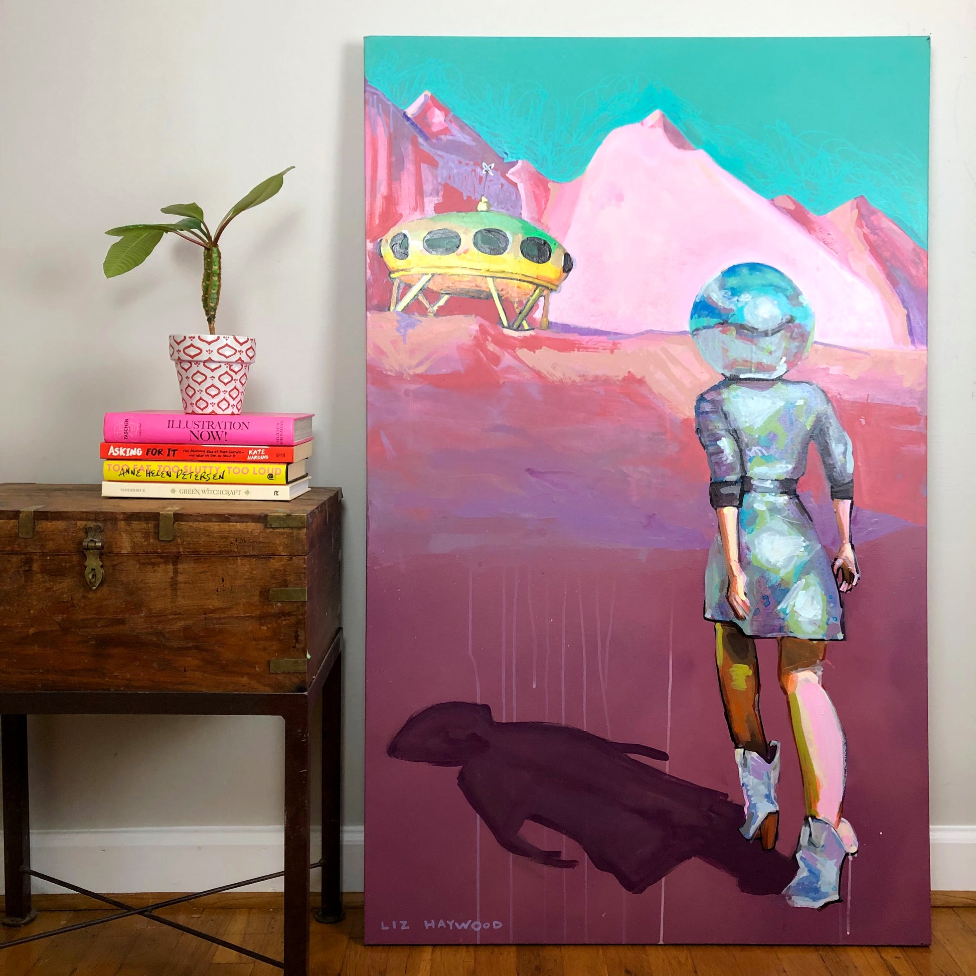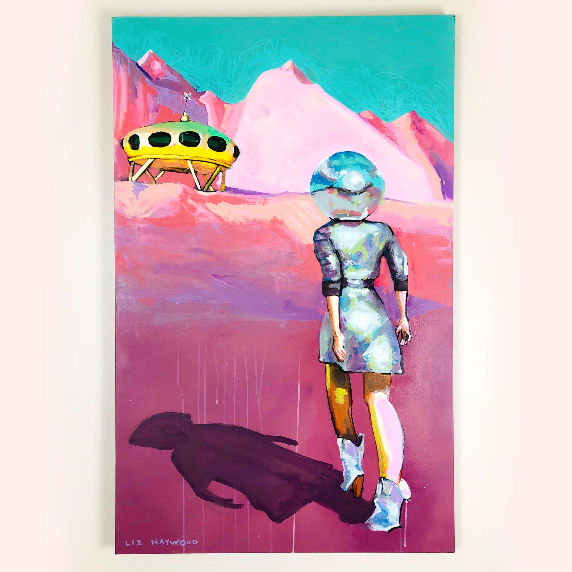 Long Walk Home is a captivating 30” x 48” canvas painting by Liz Haywood, featured in the June 2024 issue of O.Henry Magazine and exhibited at GreenHill Center for NC Art's LEAP: Artists Explore Outer Space in Greensboro, NC. This stunning piece, part of Liz’s retro-futuristic collection, takes you on a journey to an imagined world, where a lone figure in a shimmering space suit walks toward a mysterious, dome-like structure in the distance. The vibrant pink and teal color palette, coupled with the dreamlike mountains in the background, creates a surreal yet captivating scene.