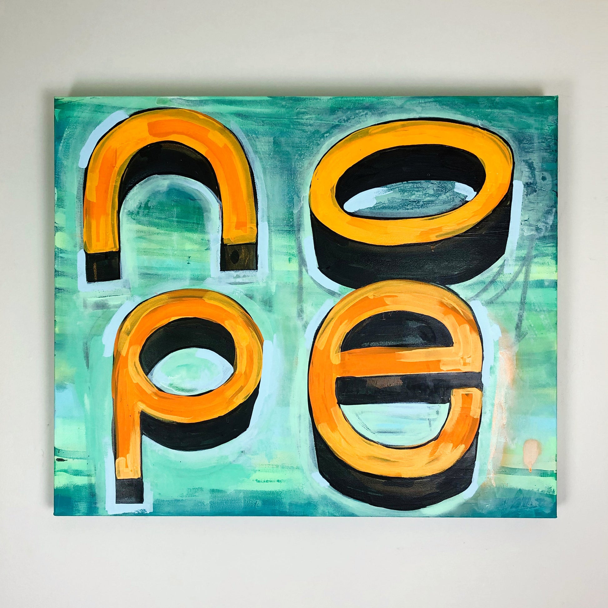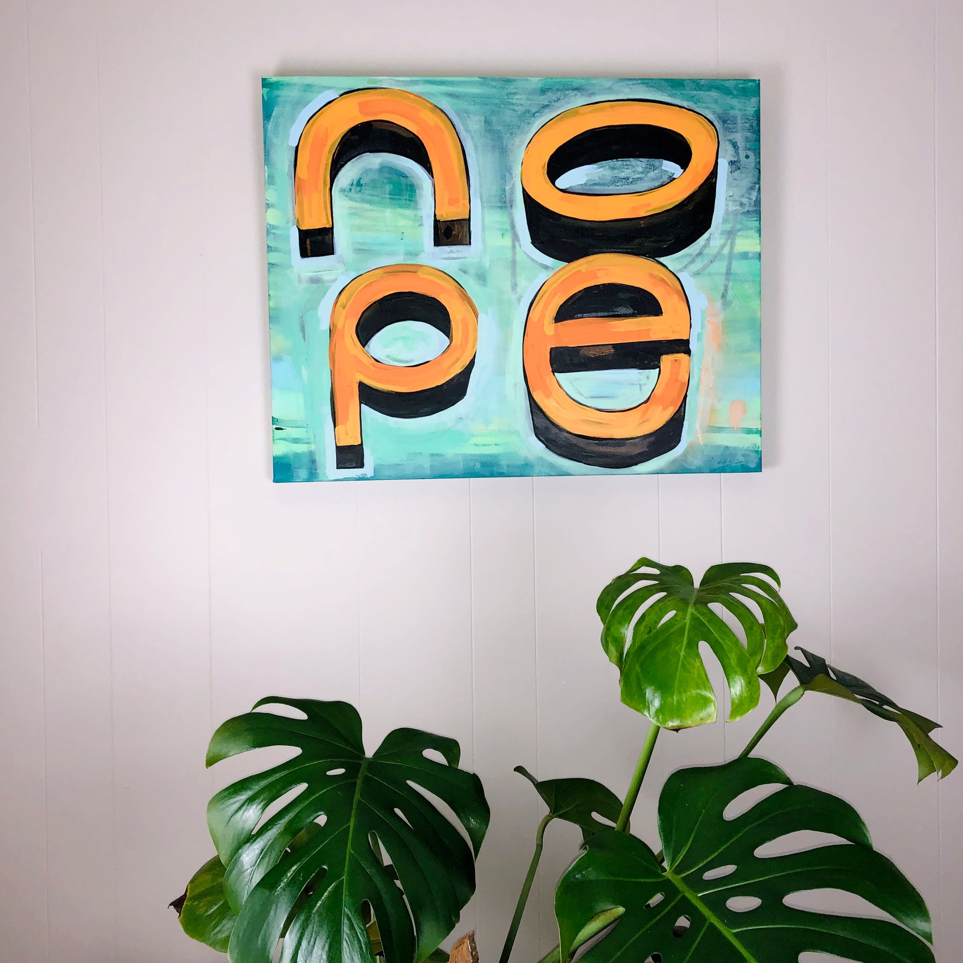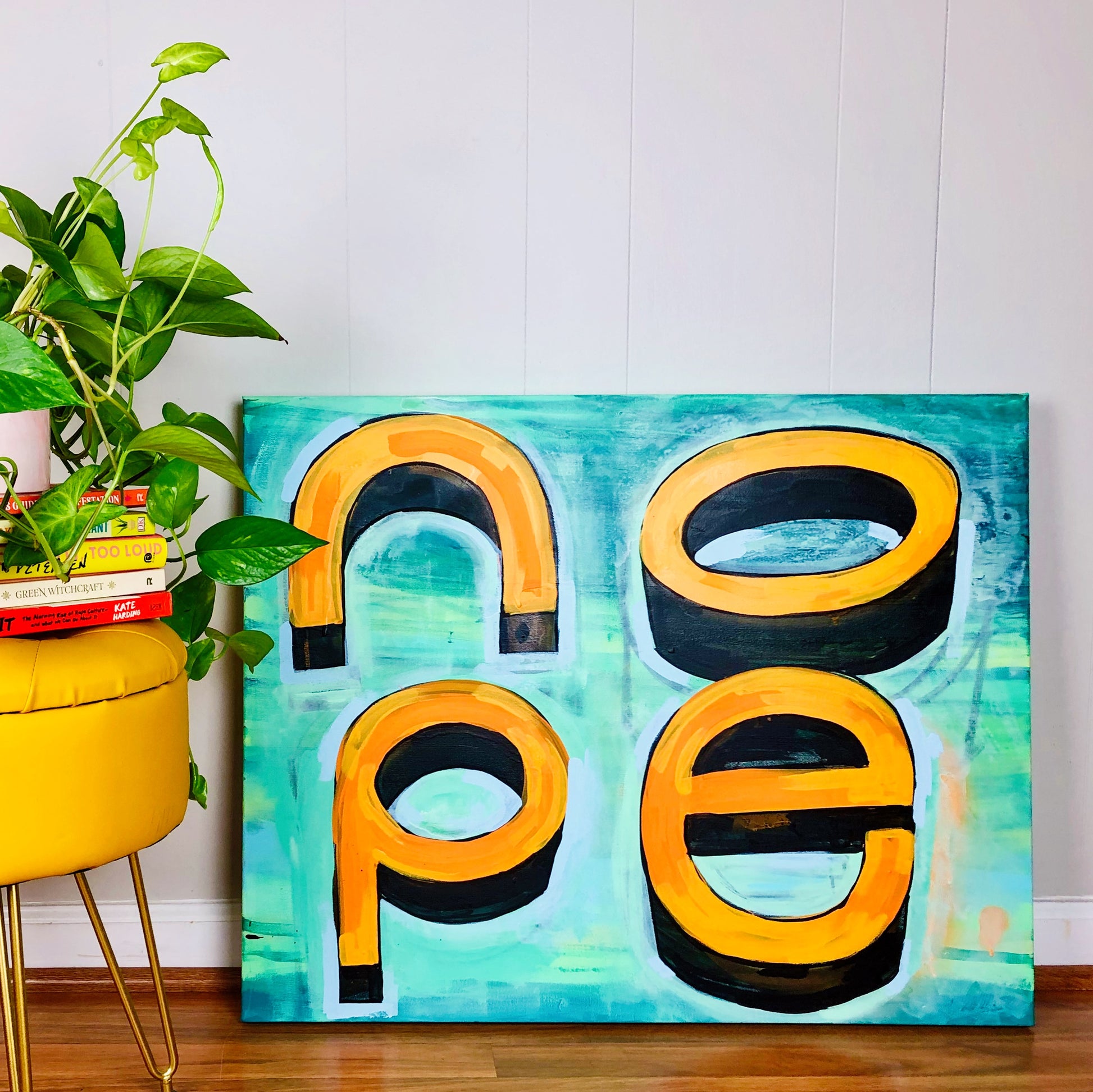 This bold 30” x 24” canvas by Liz Haywood makes an unmistakable statement with its striking use of orange and black letters set against a rich teal background. Created using latex paint, spray paint, and acrylic pen, NOPE channels the frustration and defiance against the Trump administration, with orange representing the former president’s association. The letters are outlined in black, offering a striking depth and dimensionality to the simple yet powerful word.