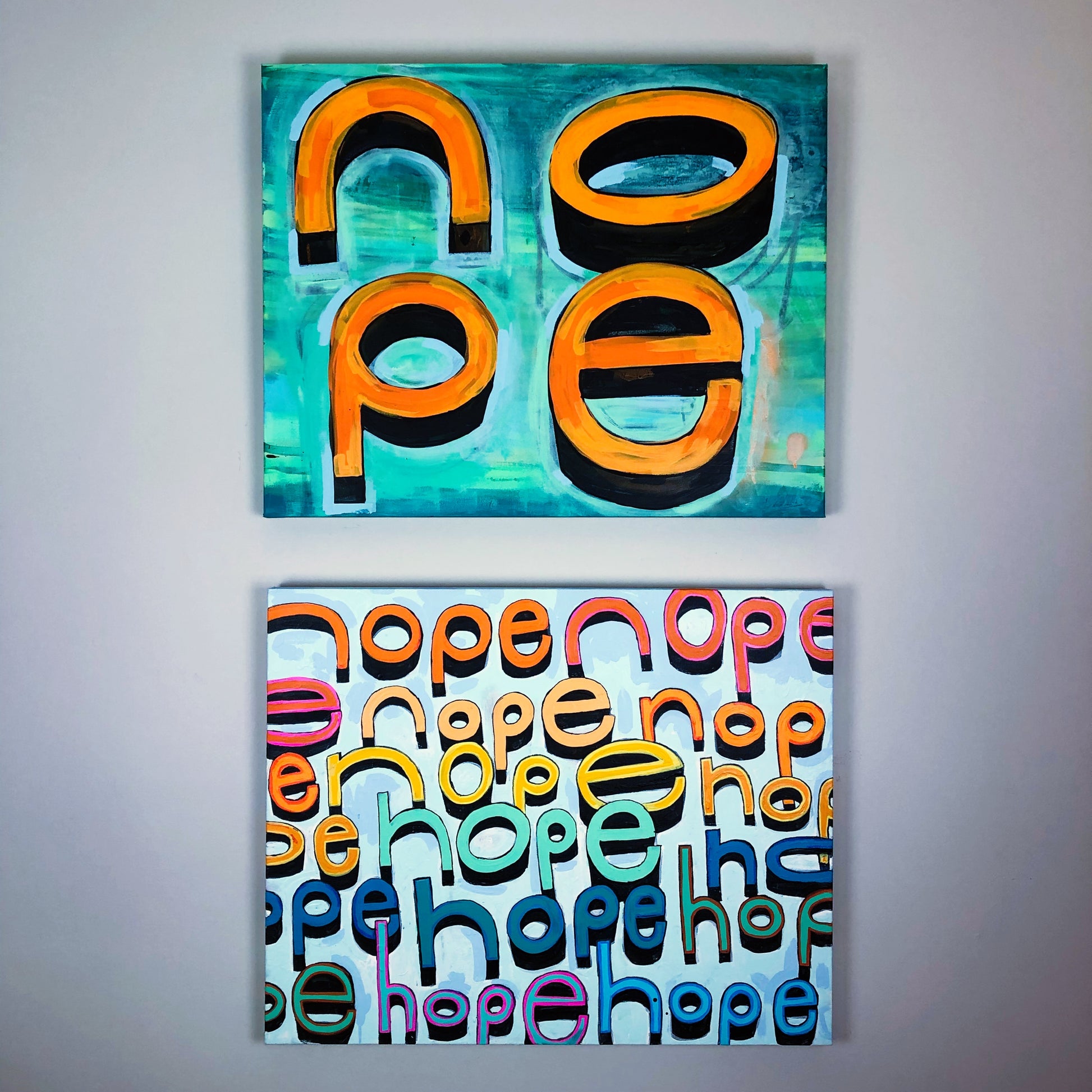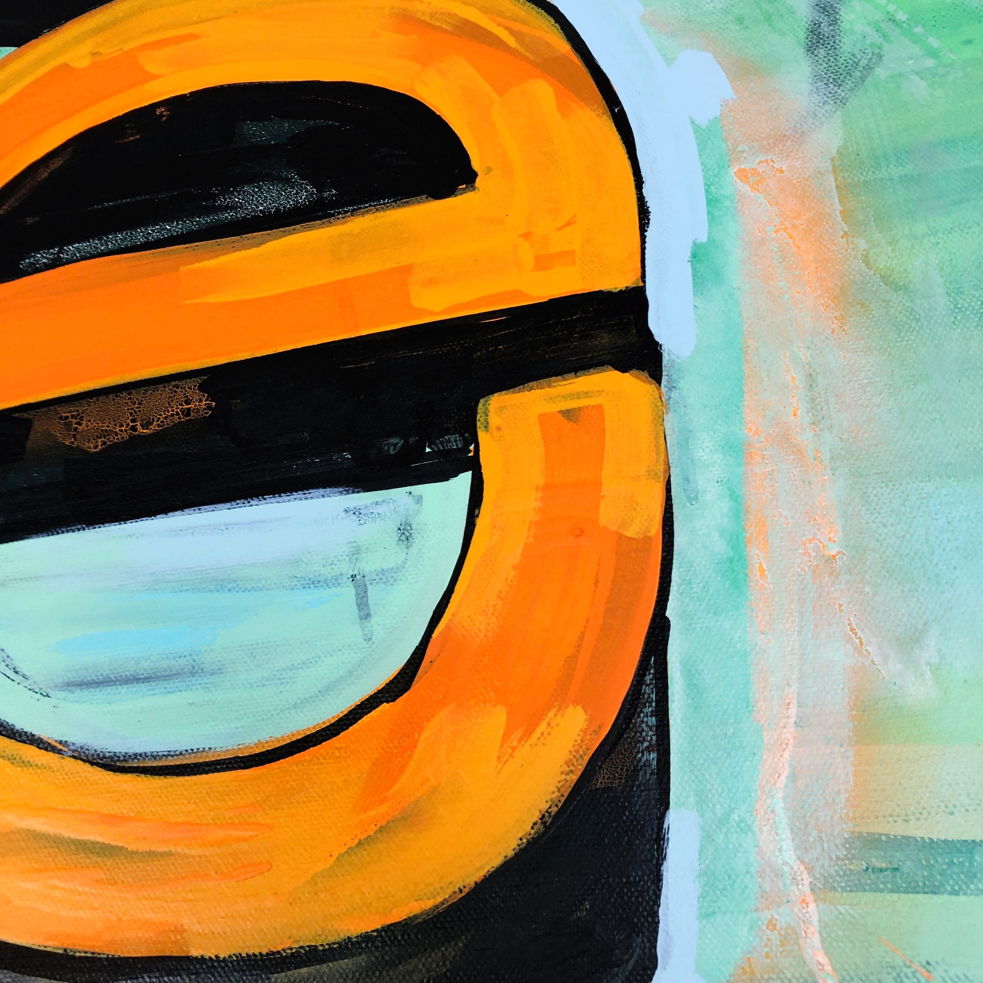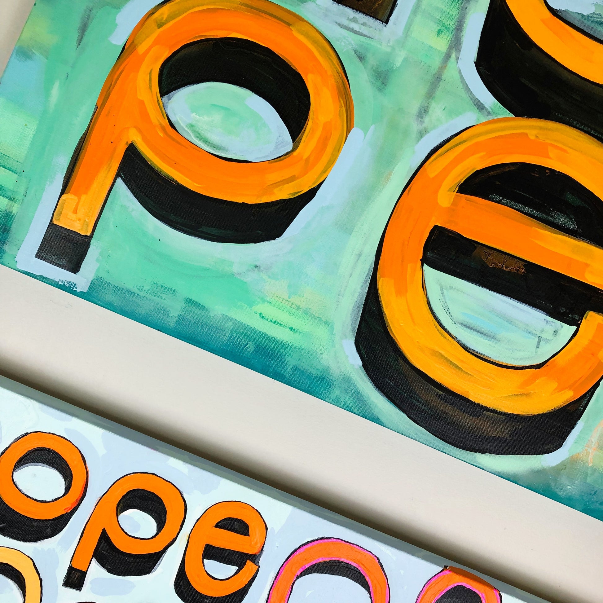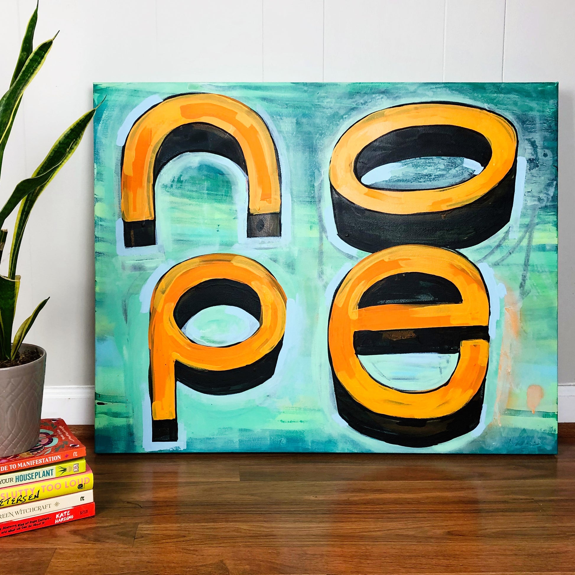 This bold 30” x 24” canvas by Liz Haywood makes an unmistakable statement with its striking use of orange and black letters set against a rich teal background. Created using latex paint, spray paint, and acrylic pen, NOPE channels the frustration and defiance against the Trump administration, with orange representing the former president’s association. The letters are outlined in black, offering a striking depth and dimensionality to the simple yet powerful word.