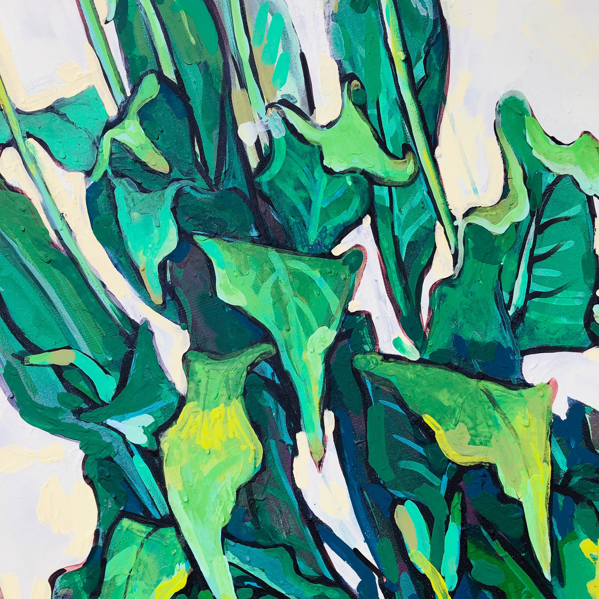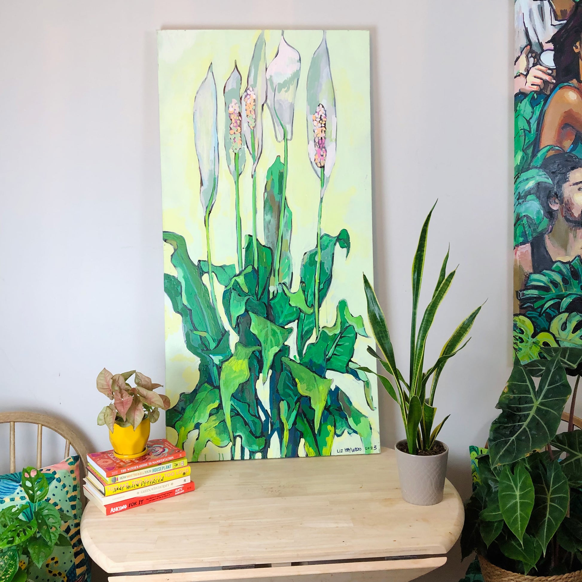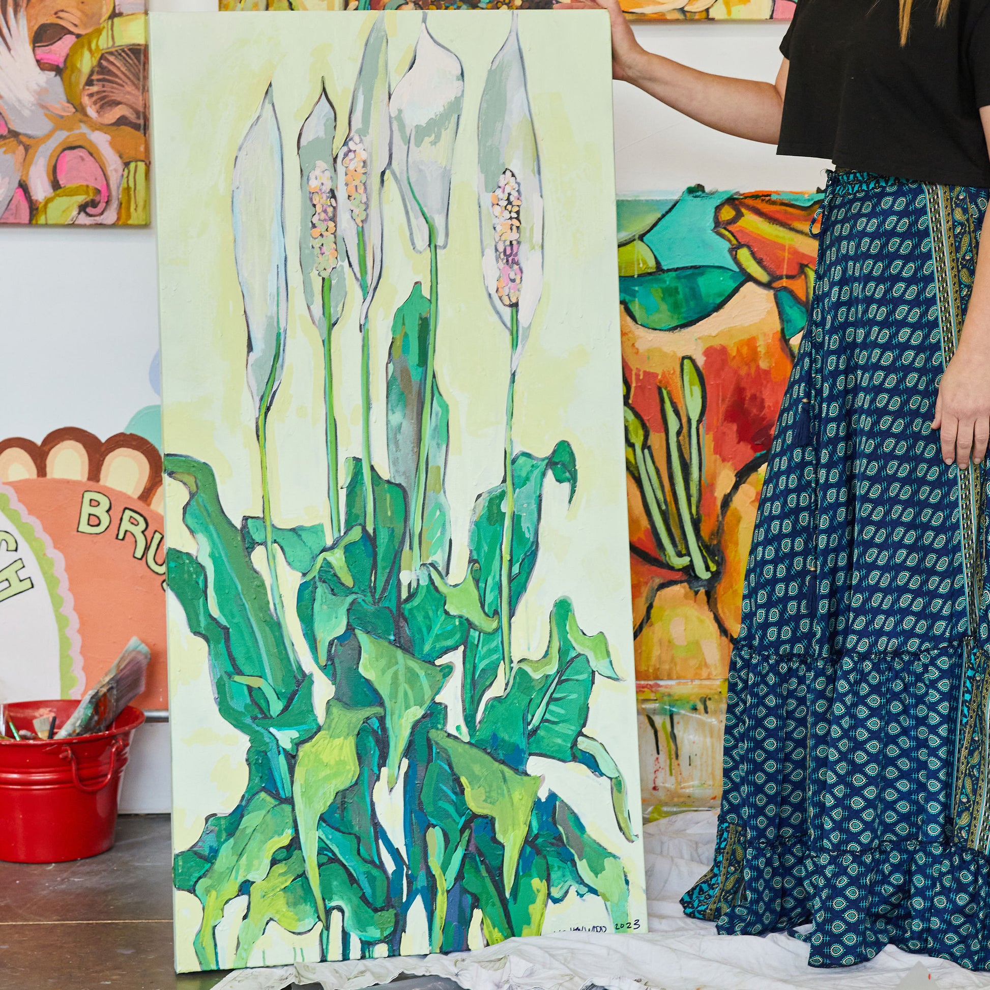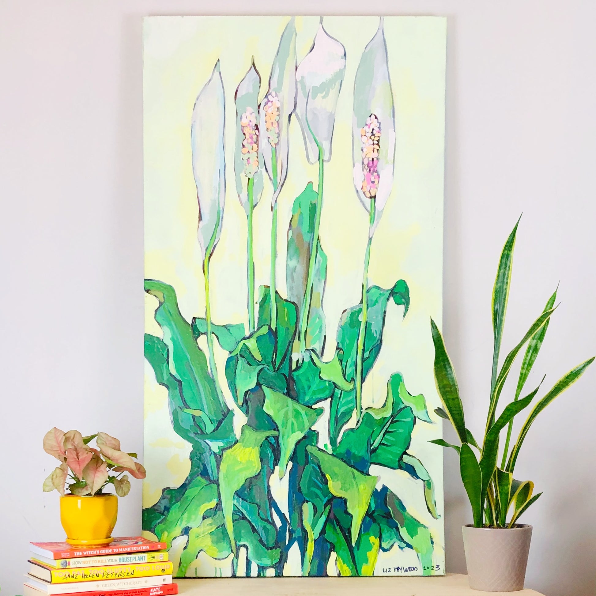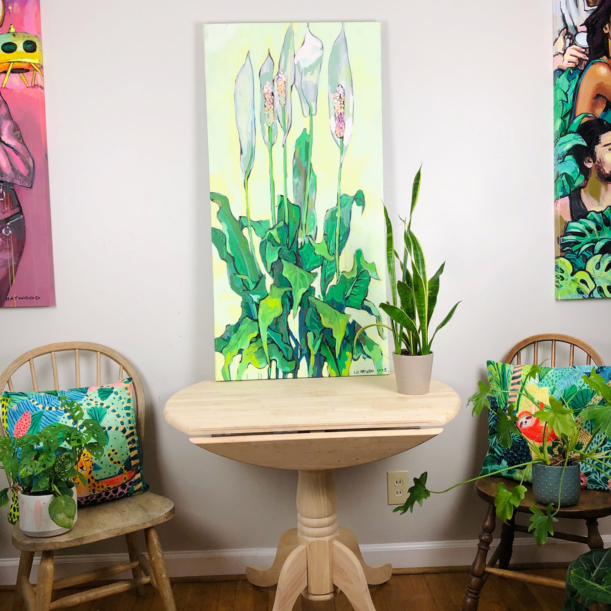 Brighten your space with this stunning botanical painting featuring vibrant peace lilies, capturing the essence of nature's calm beauty. Created by North Carolina artist Liz Haywood, this original piece radiates fresh greens and soft whites, enhanced with Haywood's signature textures and layered brushstrokes. The composition of tall, elegant leaves and delicate blooms will transport you to a serene, peaceful environment, making it perfect for any home or office setting.