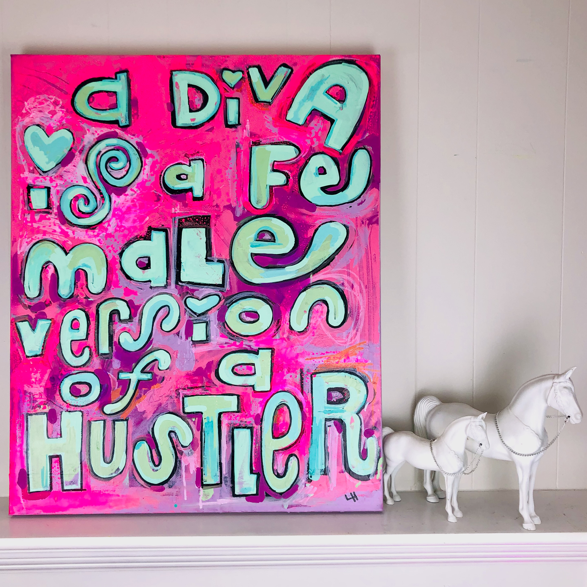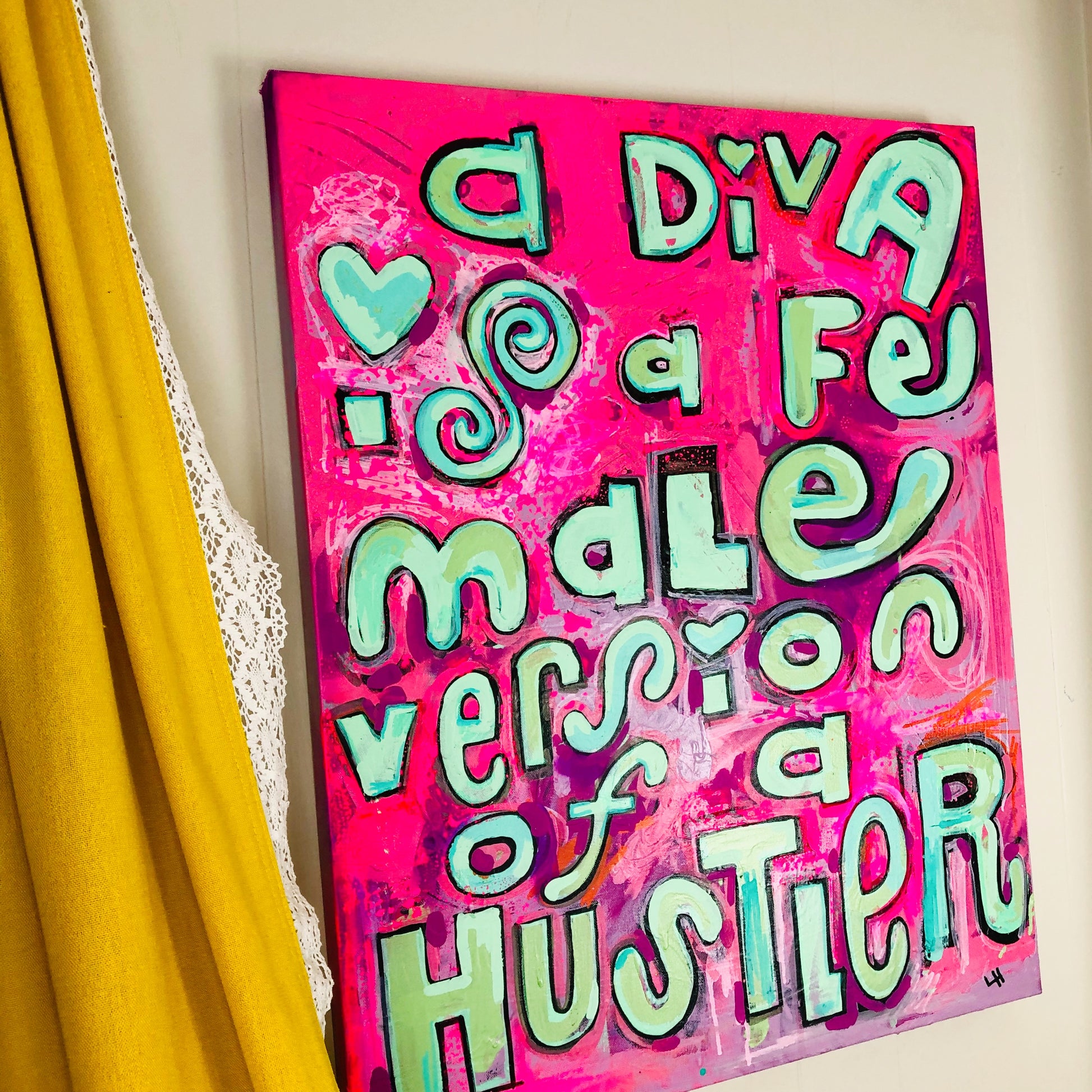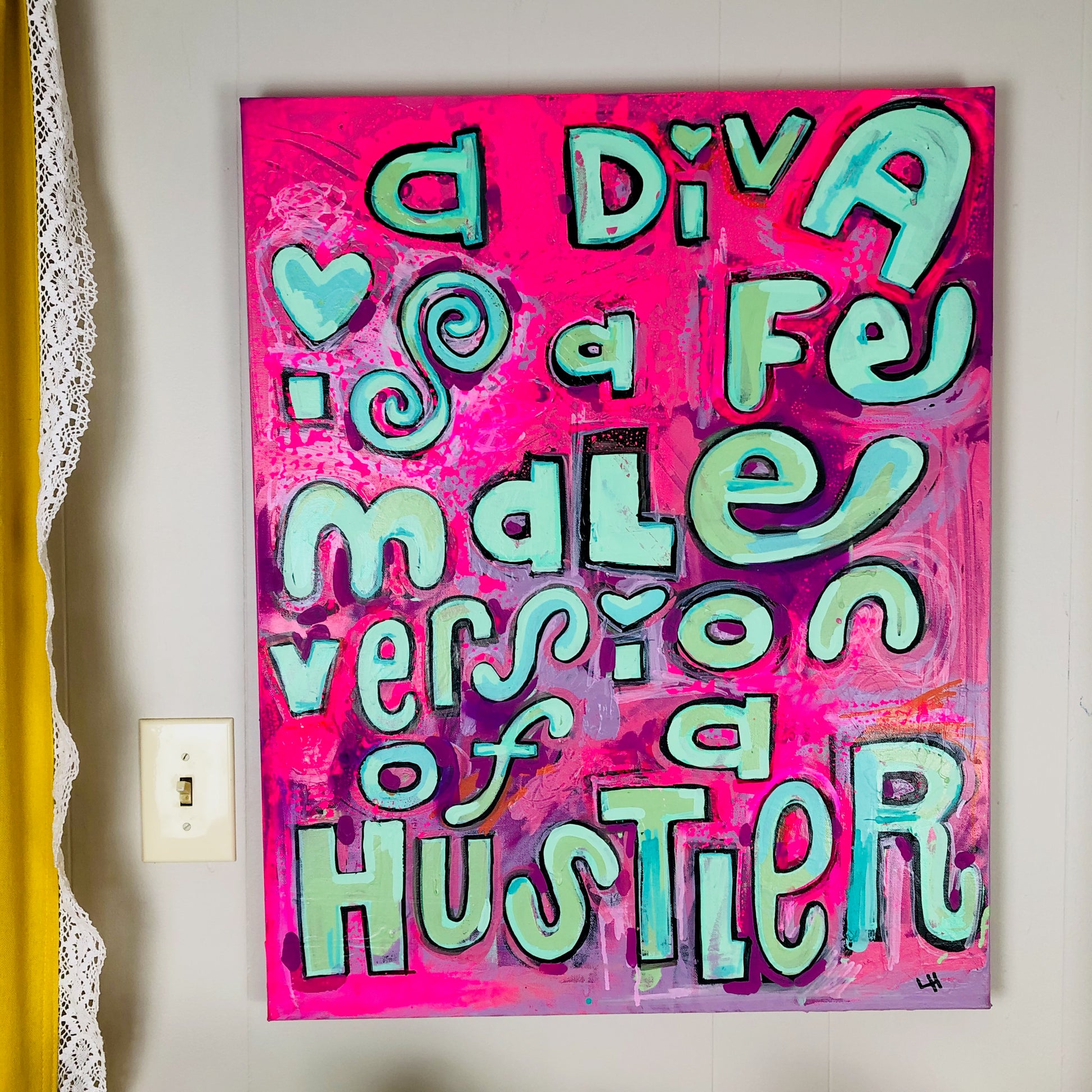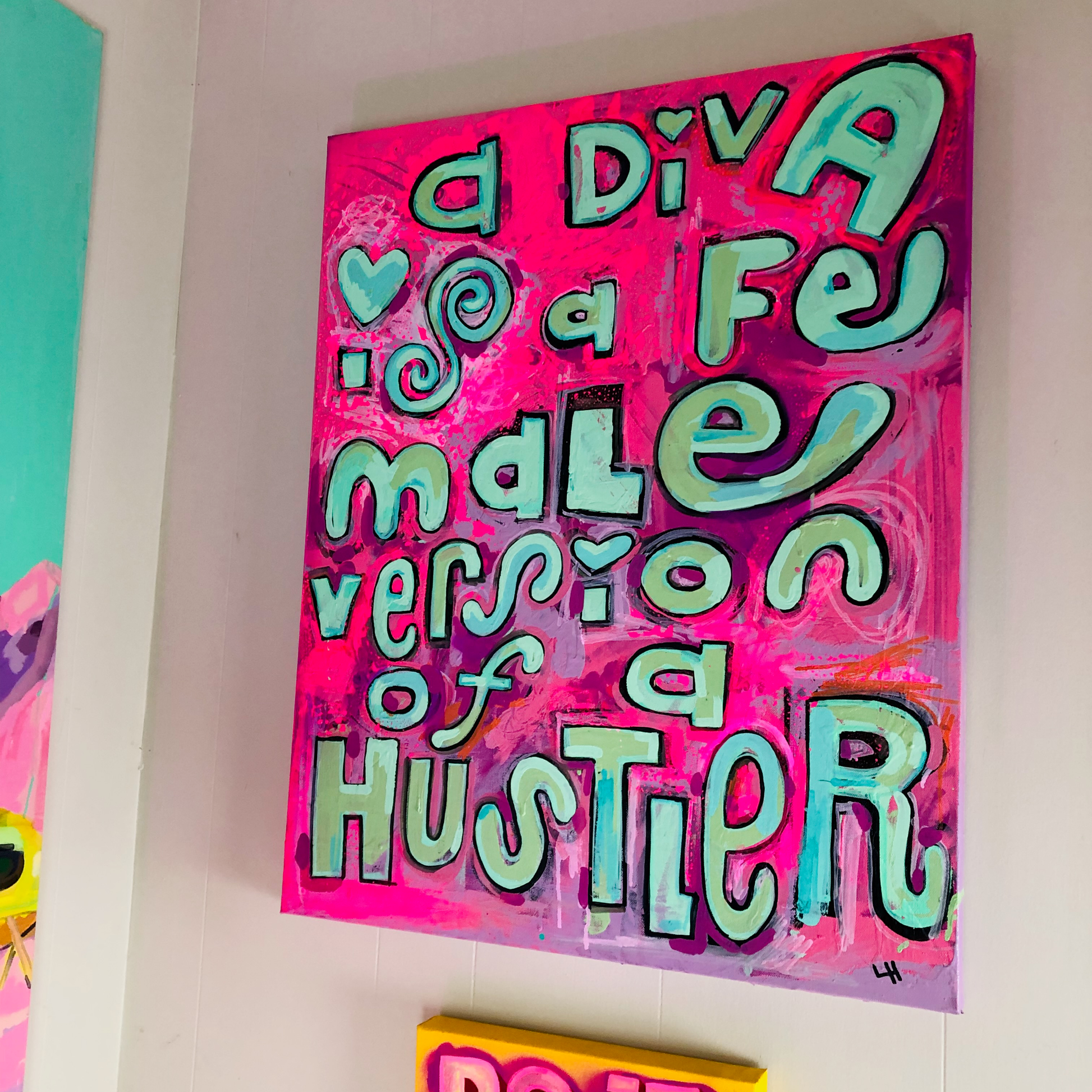Loud, proud, and dripping with Beyoncé-level confidence, DIVA takes its cue from the iconic lyric: “A diva is a female version of a hustler.” Painted in a riot of hot pinks, teals, and layered textures, the hand-lettered message pops like street art with a retro twist.