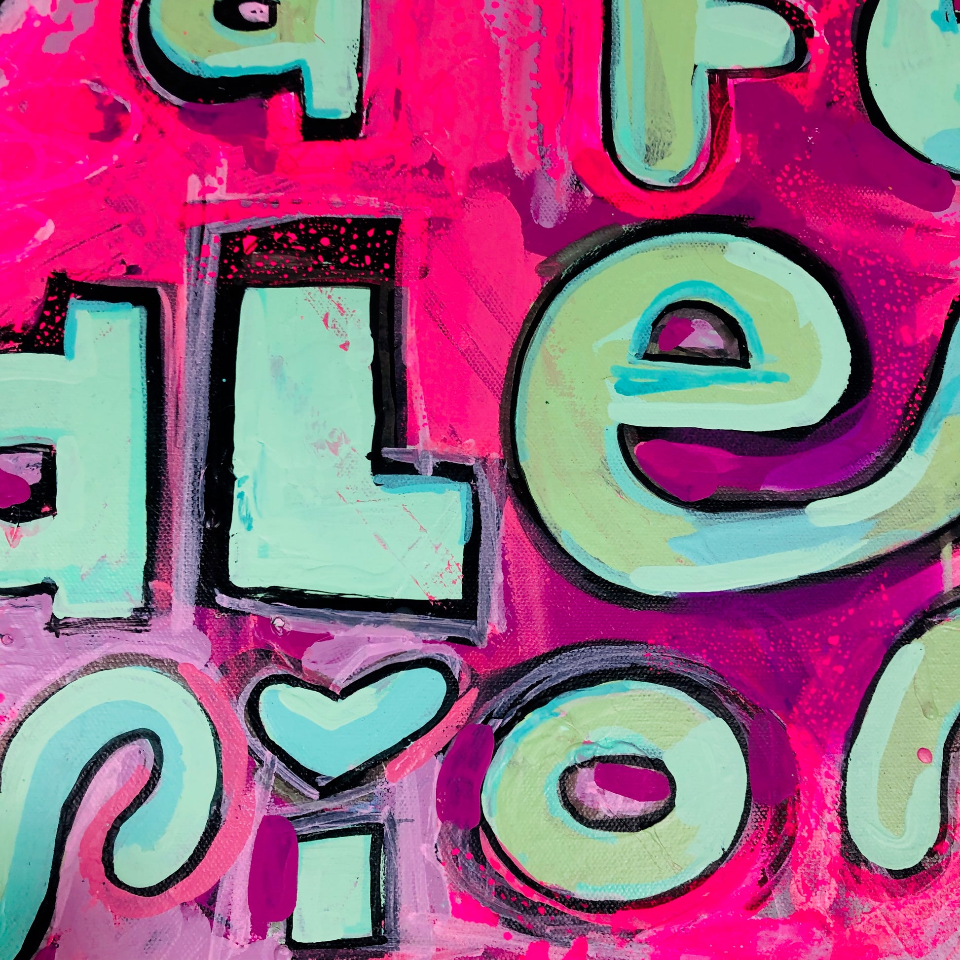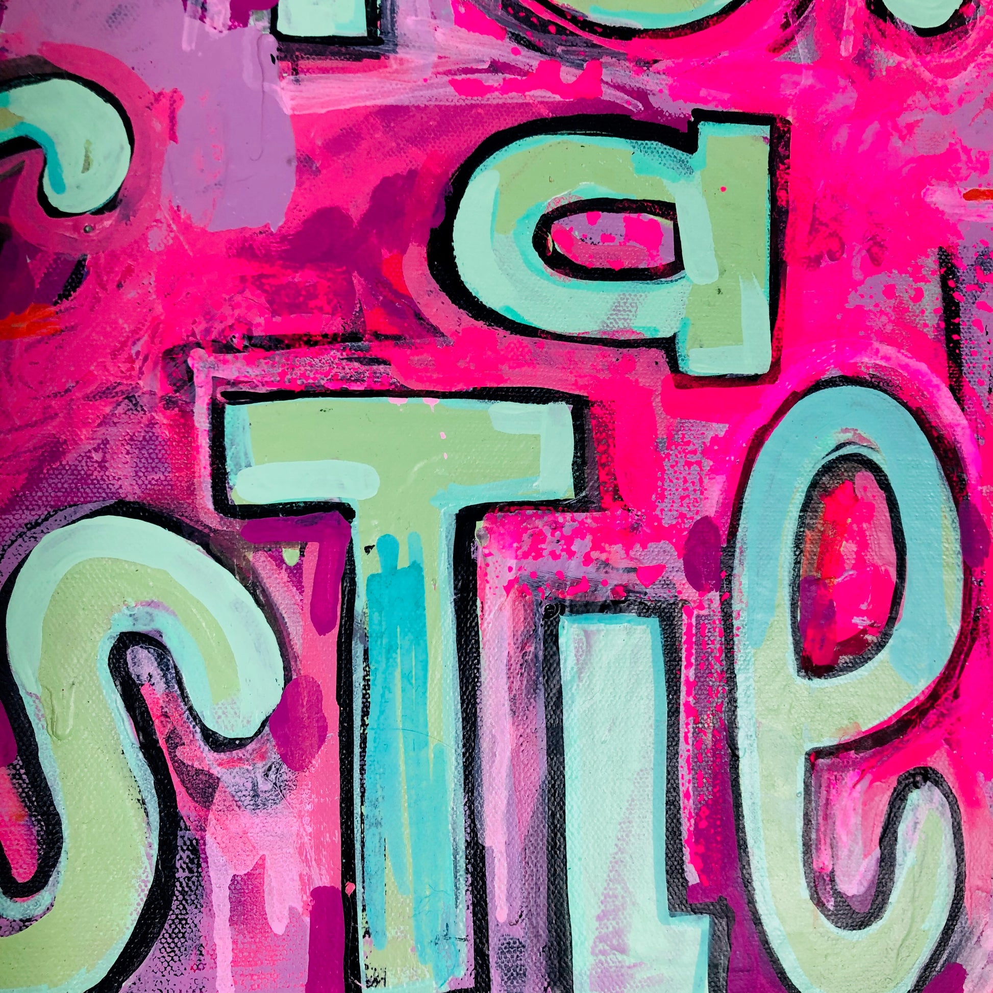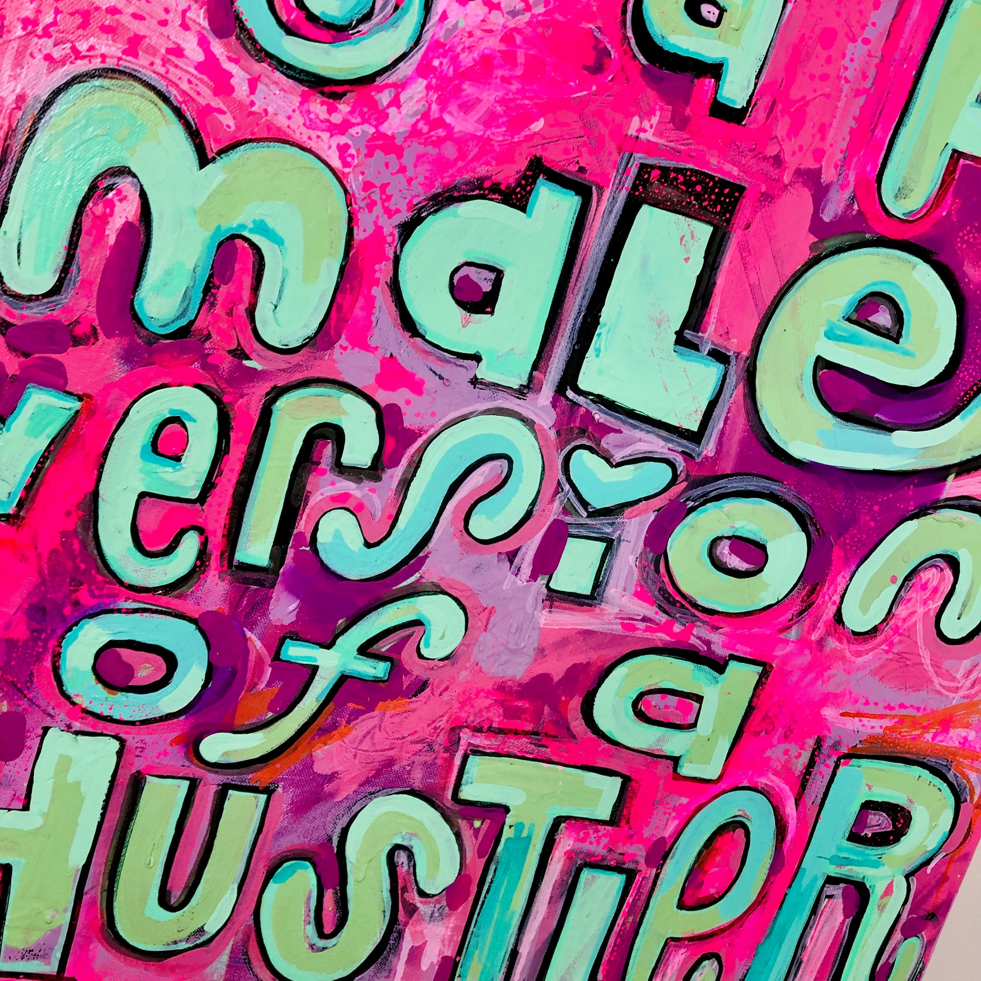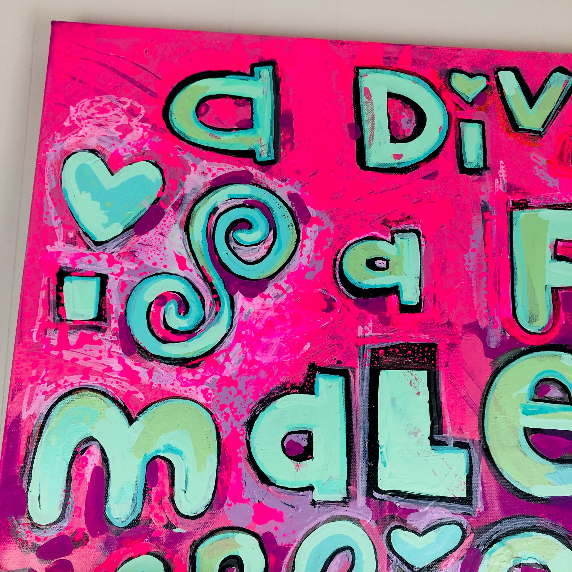 Loud, proud, and dripping with Beyoncé-level confidence, DIVA takes its cue from the iconic lyric: “A diva is a female version of a hustler.” Painted in a riot of hot pinks, teals, and layered textures, the hand-lettered message pops like street art with a retro twist.