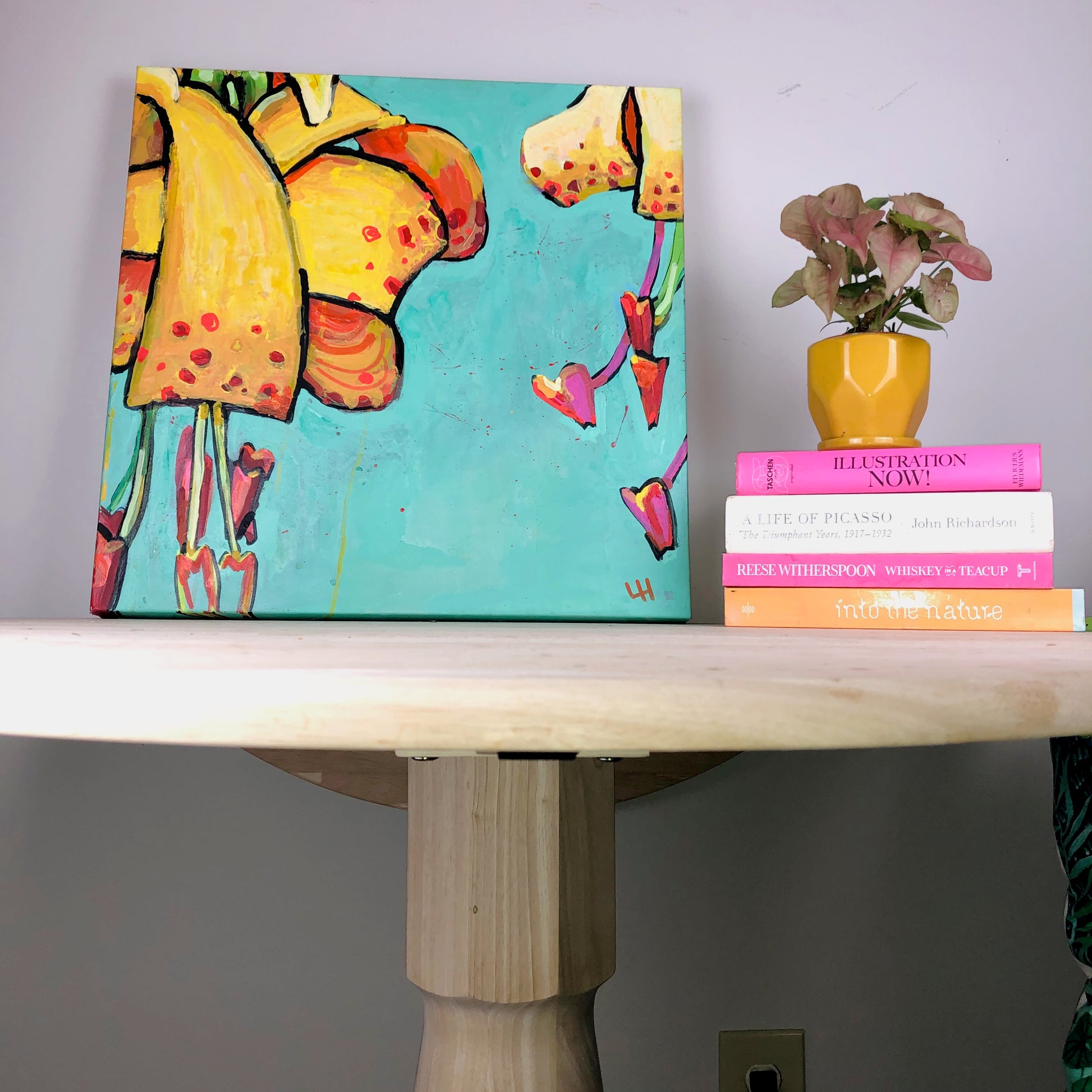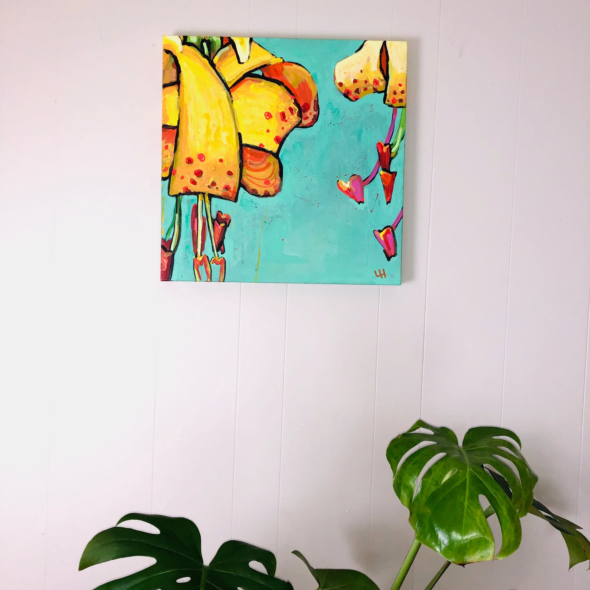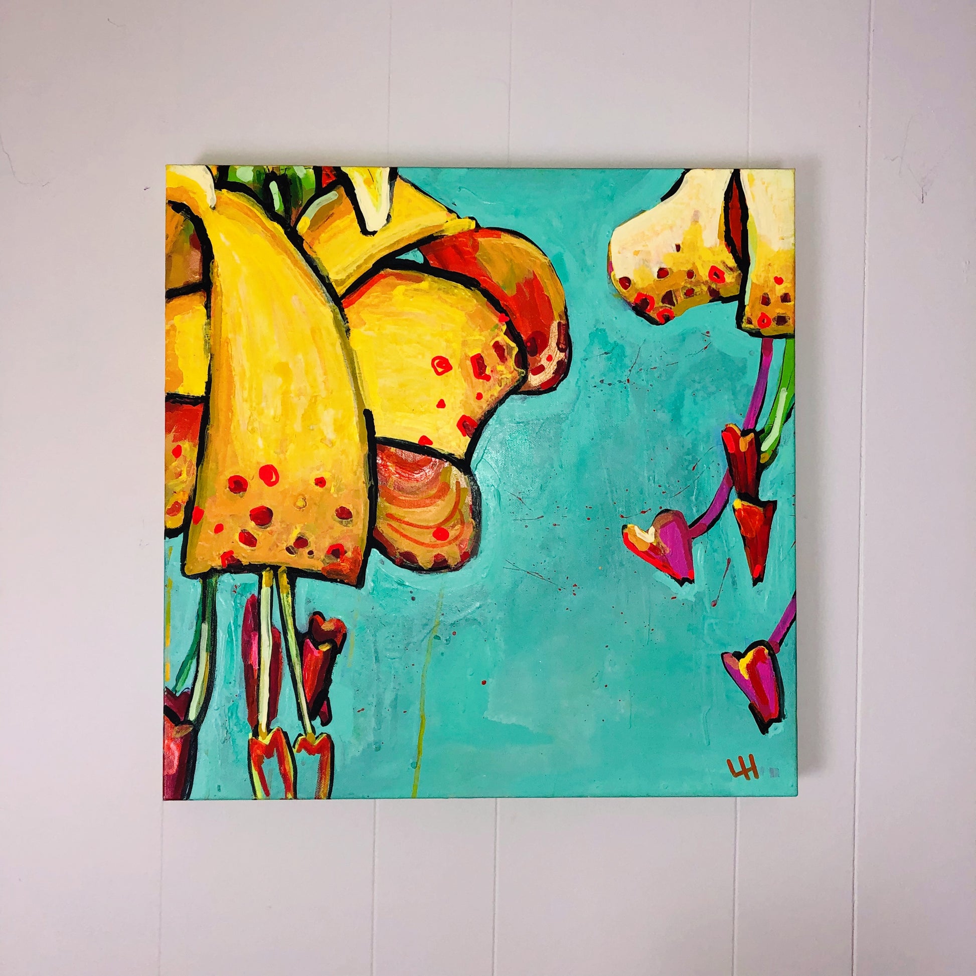 Polka Dot Flowers is a vibrant 20” x 20” canvas painting by Liz Haywood that brings a playful burst of color to any room. Featuring large, bold flowers adorned with charming polka dots, this piece combines vibrant yellows and oranges against a soft, turquoise background. The joyful composition and energetic color palette make this artwork a lively and uplifting addition to your home or office.