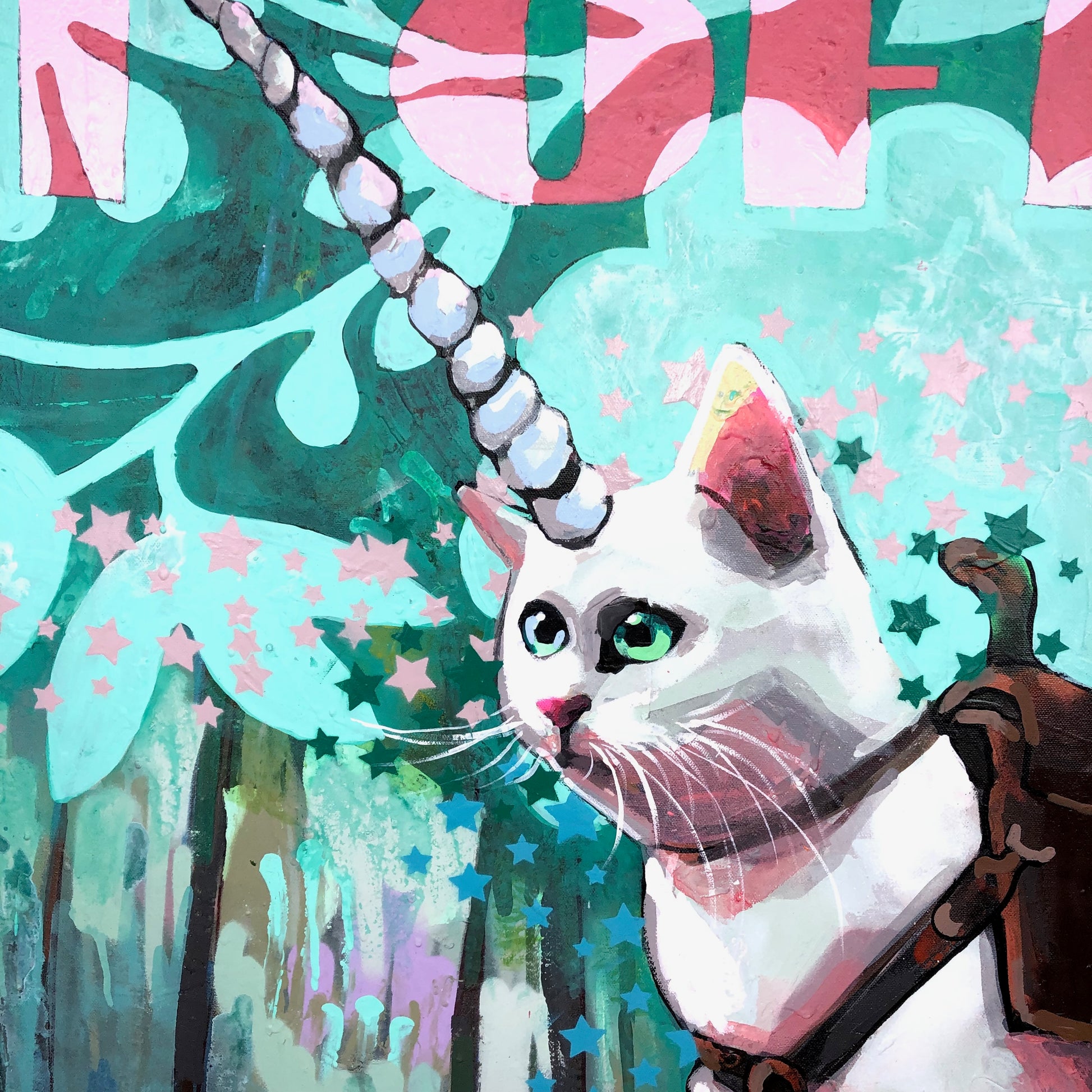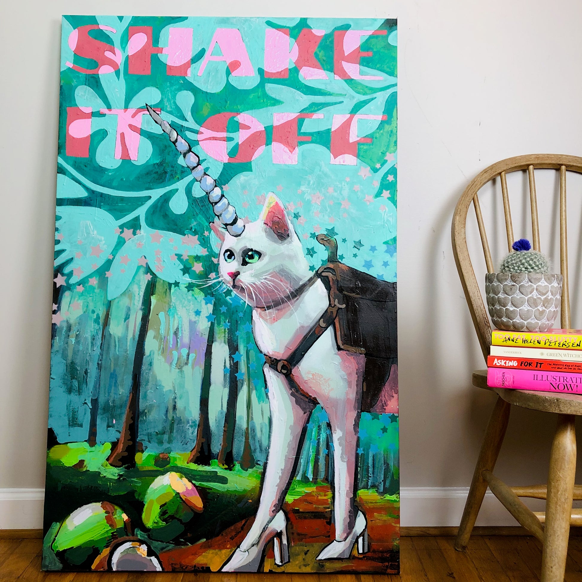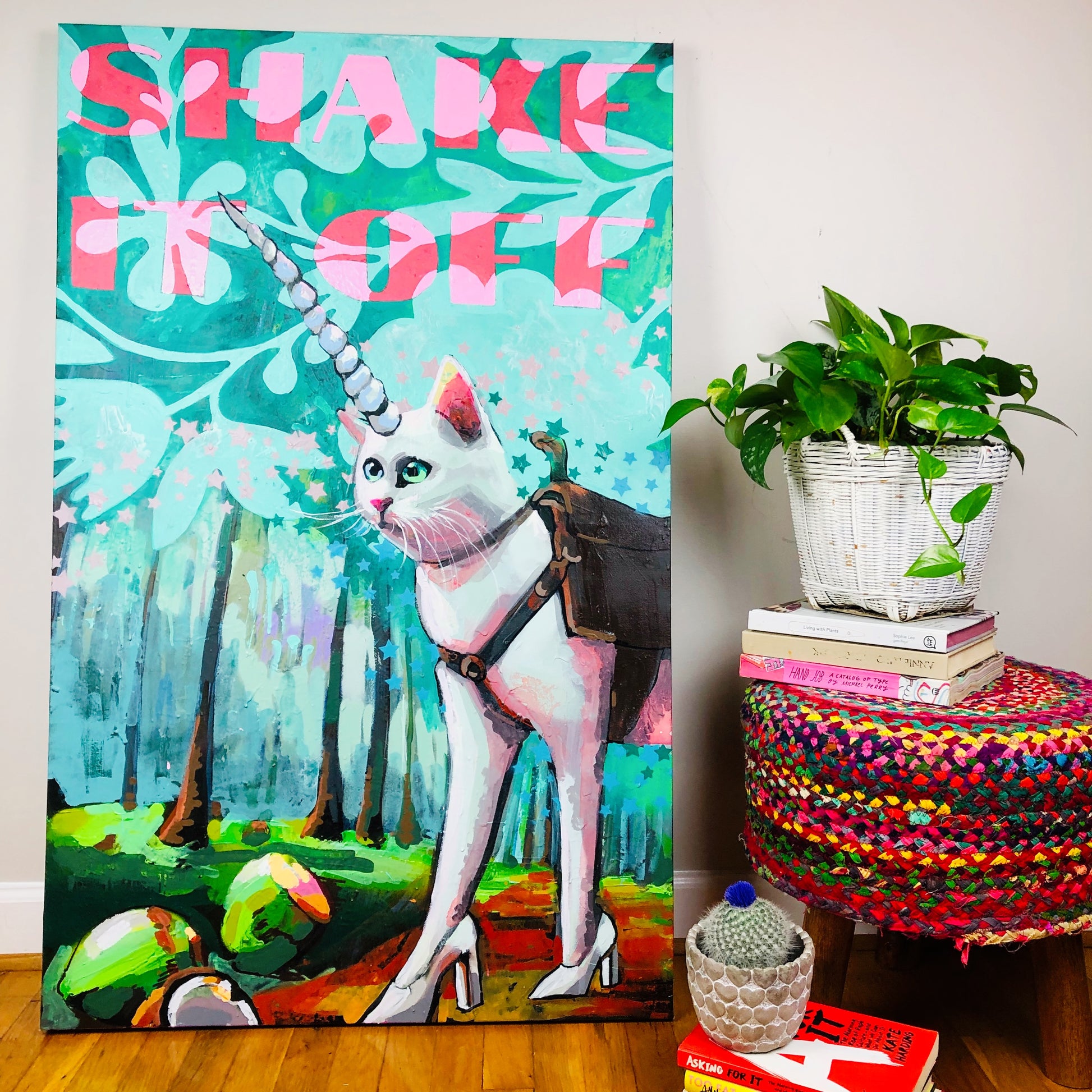 This bold, whimsical piece is more than just a cat in heels—it's a feminist anthem in paint. Featuring a white cat (symbolizing feminism and the suffragette spirit) rocking her natural fur but slaying in white pumps as she strides through the coconut forest, this artwork channels the energy of resilience and hope after heartbreak. The unicorn horn? Pure magic. The lush coconut forest backdrop? A nod to Kamala Harris and the promise of progress. And the Shake It Off lyrics? A powerful reminder to keep moving forward, even when history doesn’t bend the way it should. Thanks for the inspo on that, Taylor.