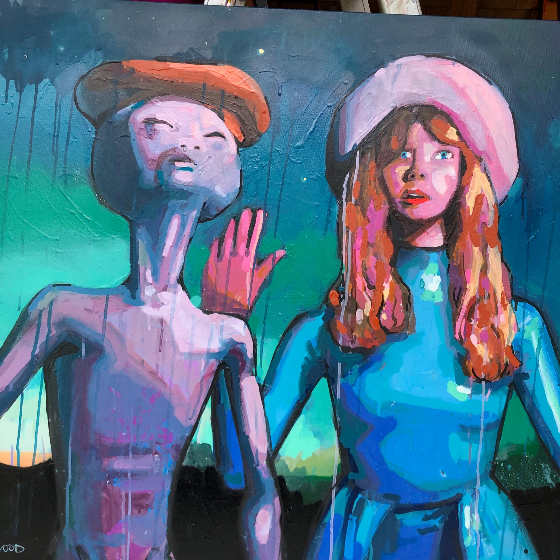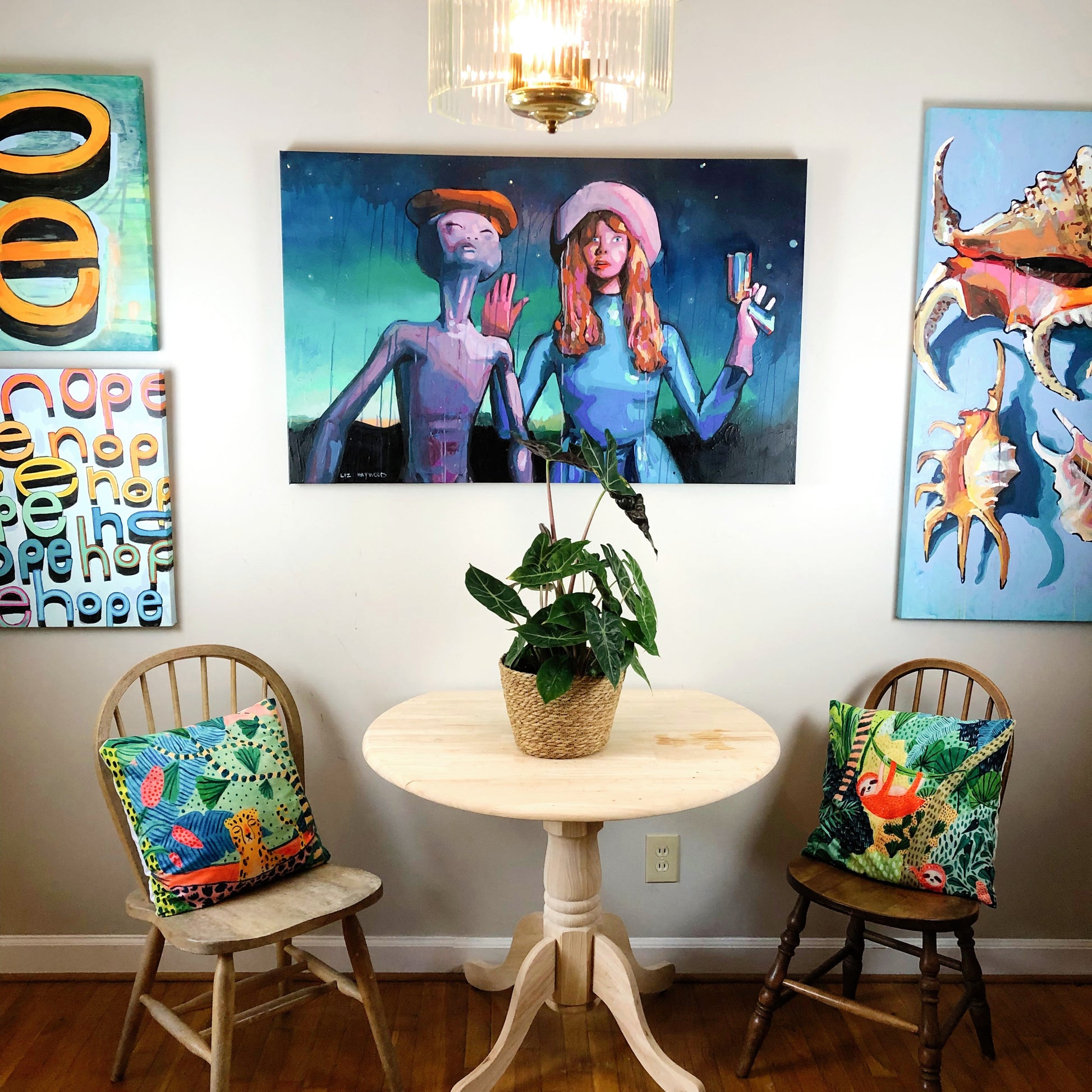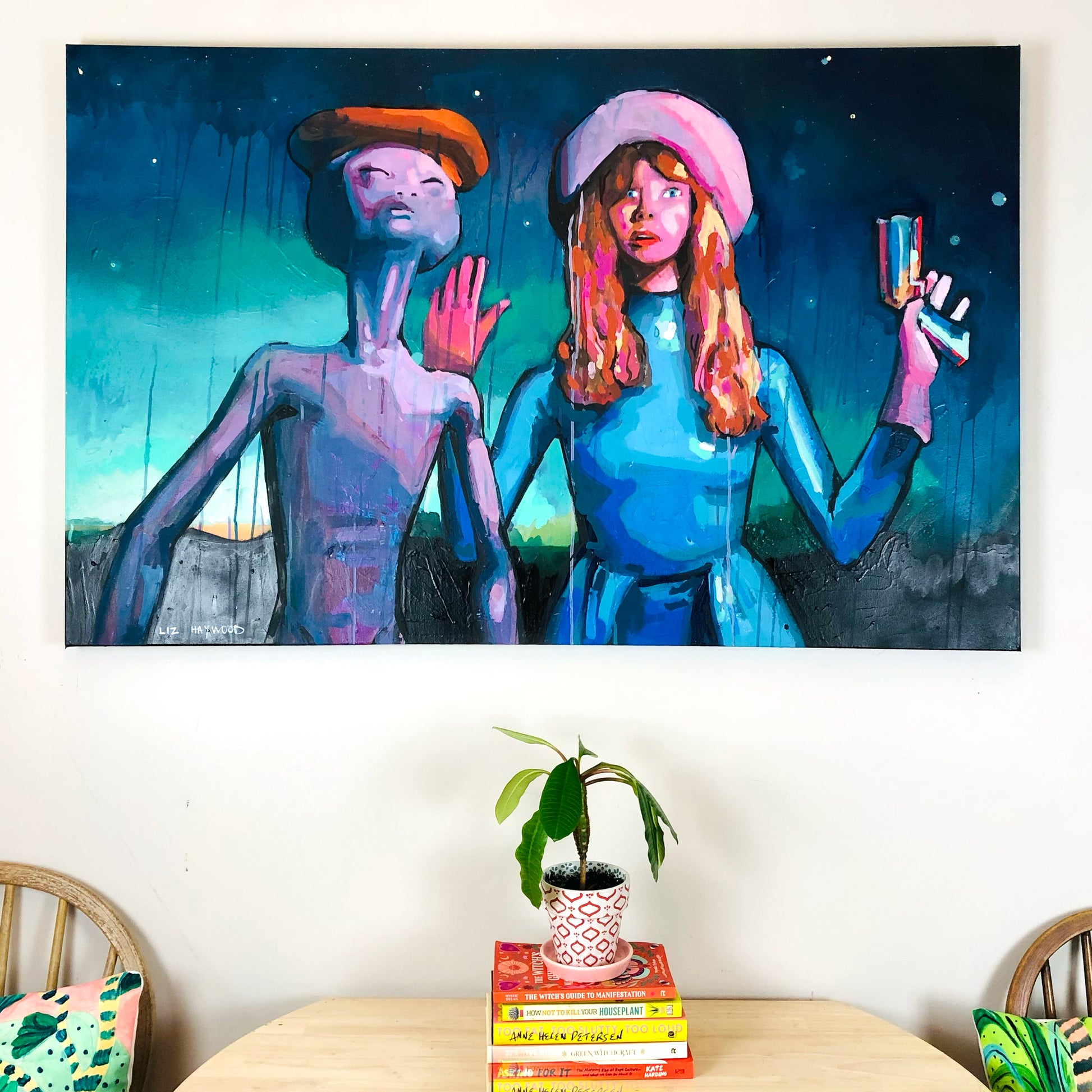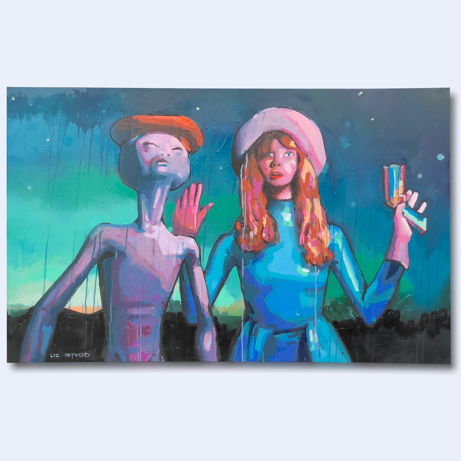 Stick 'em Up is a playful, retro-futuristic painting that reimagines first contact with humor and vibrant style. The piece showcases an alien and a woman in a quirky moment, layered with rich textures created from spray paint, acrylic pen, and latex paint. The stunning blues and purples pop against the bold narrative, bringing both depth and joy. Perfect for collectors of modern, fun wall art, this unique painting will brighten any space and bring a smile every time you see it, whether for its playful scene or vibrant colors.