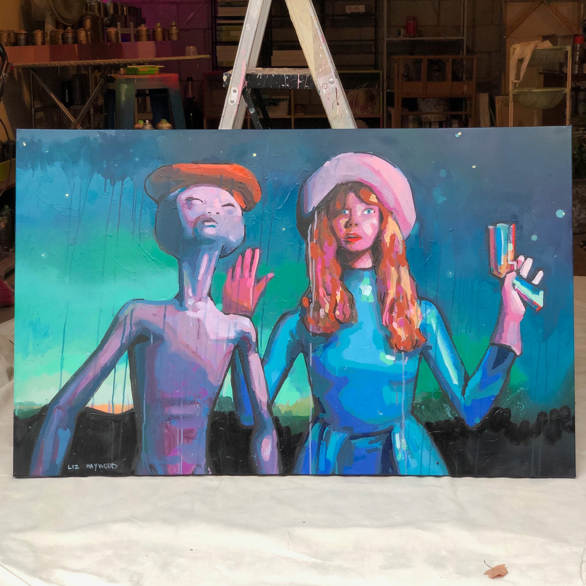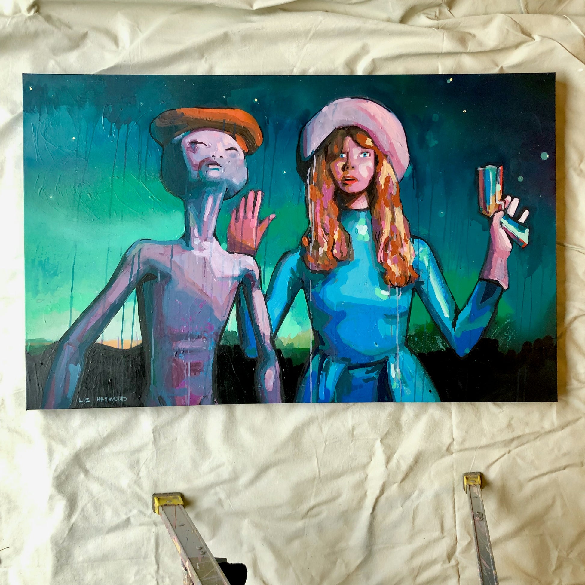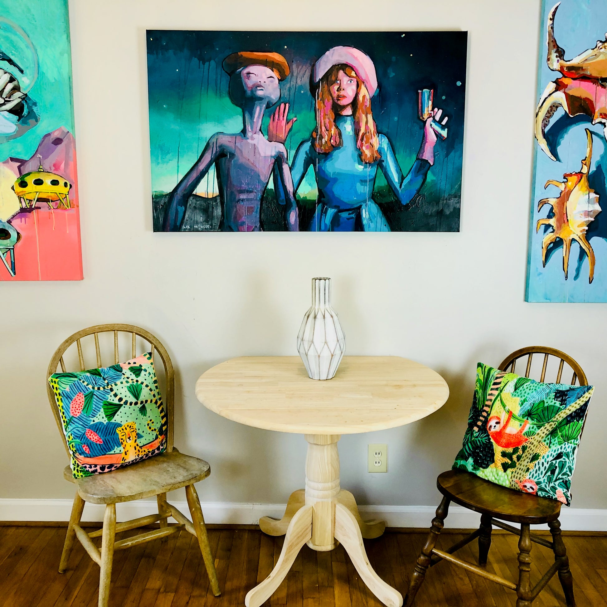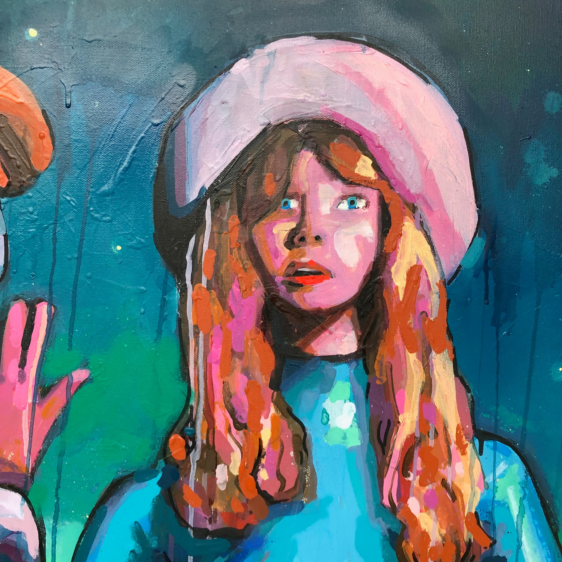 Stick 'em Up is a playful, retro-futuristic painting that reimagines first contact with humor and vibrant style. The piece showcases an alien and a woman in a quirky moment, layered with rich textures created from spray paint, acrylic pen, and latex paint. The stunning blues and purples pop against the bold narrative, bringing both depth and joy. Perfect for collectors of modern, fun wall art, this unique painting will brighten any space and bring a smile every time you see it, whether for its playful scene or vibrant colors.