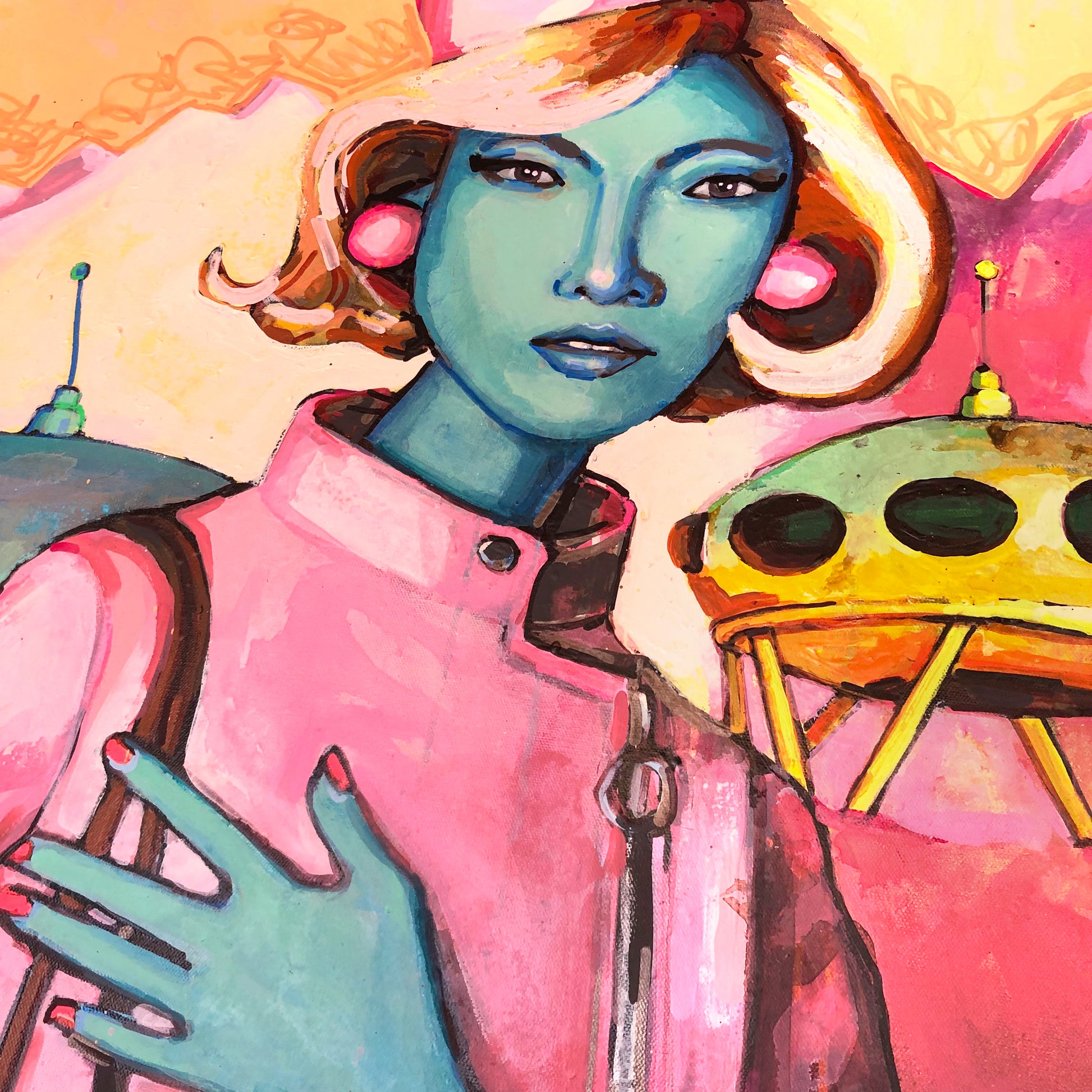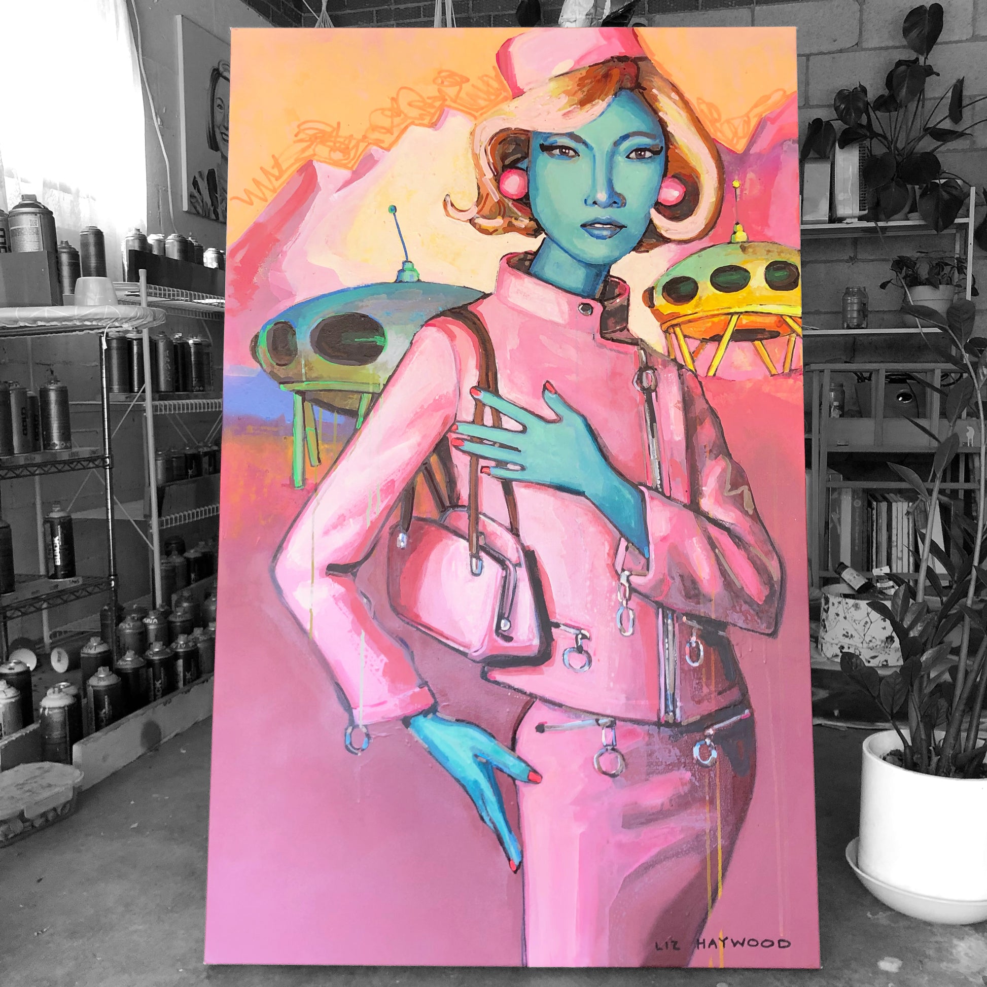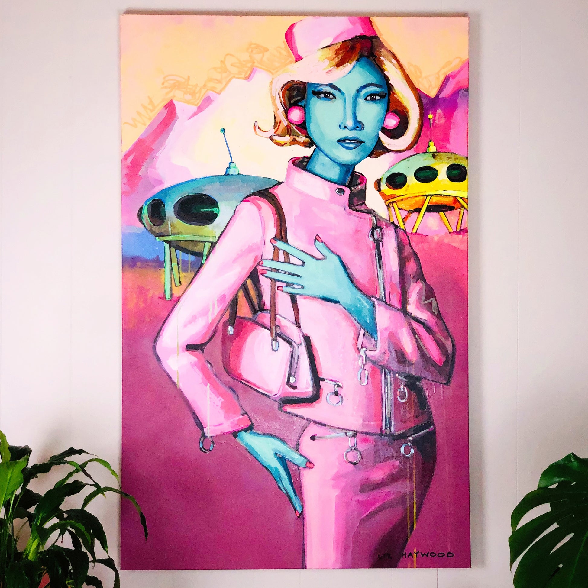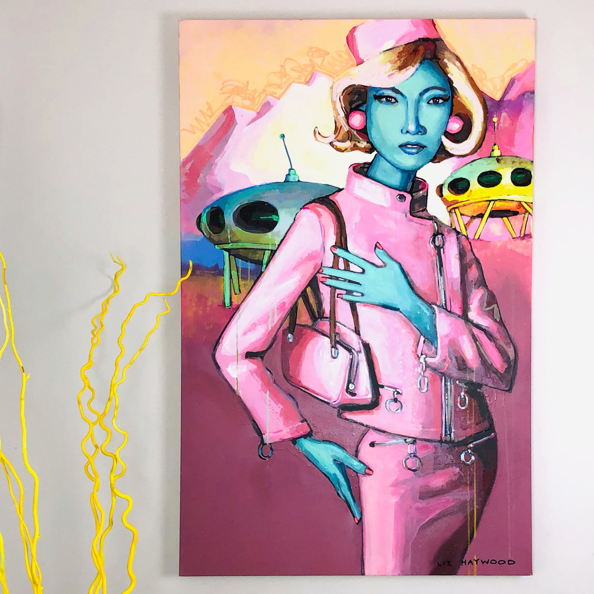 Step into a vibrant, retro-futuristic world with Sky Miles, an electrifying canvas art piece from Liz Haywood’s Alien Worlds series. Featuring a poised, blue-skinned space traveler decked out in a striking pink space suit, this artwork perfectly blends bold, eye-catching colors with a playful, futuristic aesthetic. The intriguing background includes whimsical spacecrafts, giving the scene a unique retro sci-fi vibe that invites the viewer to imagine new worlds and possibilities.