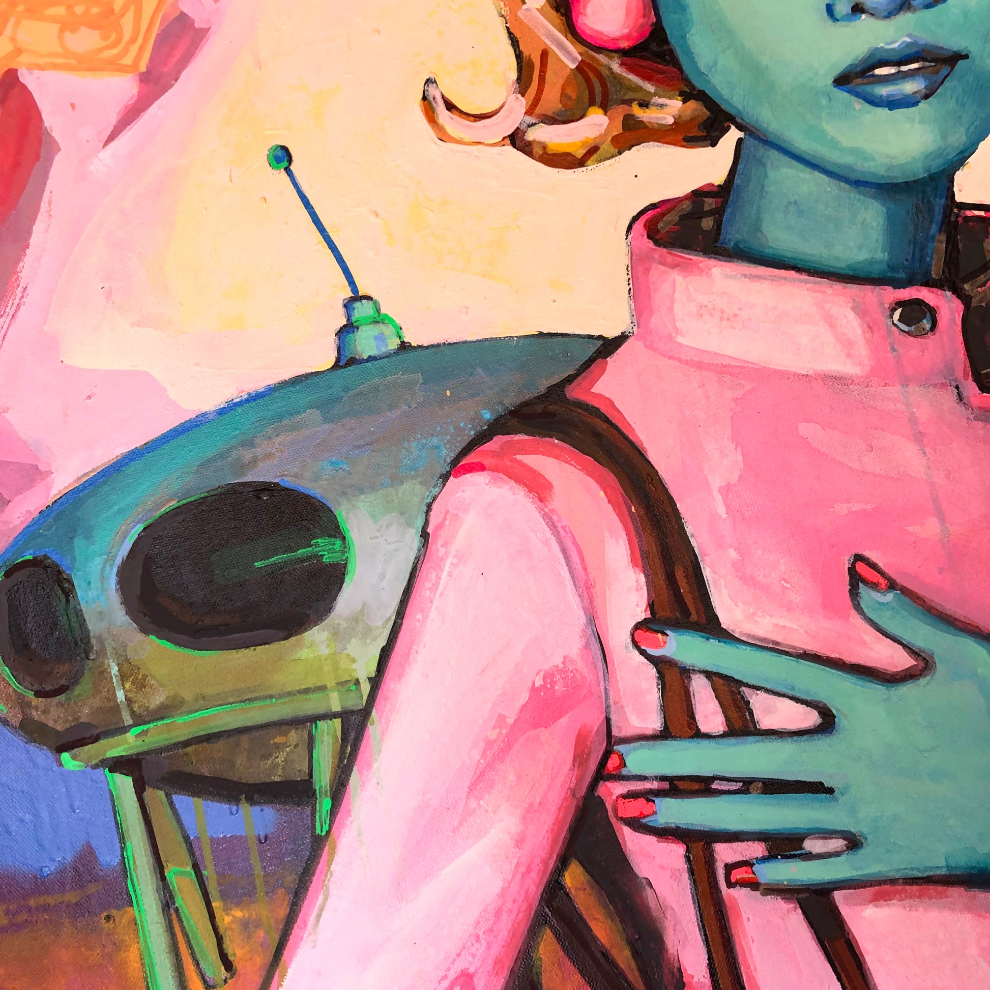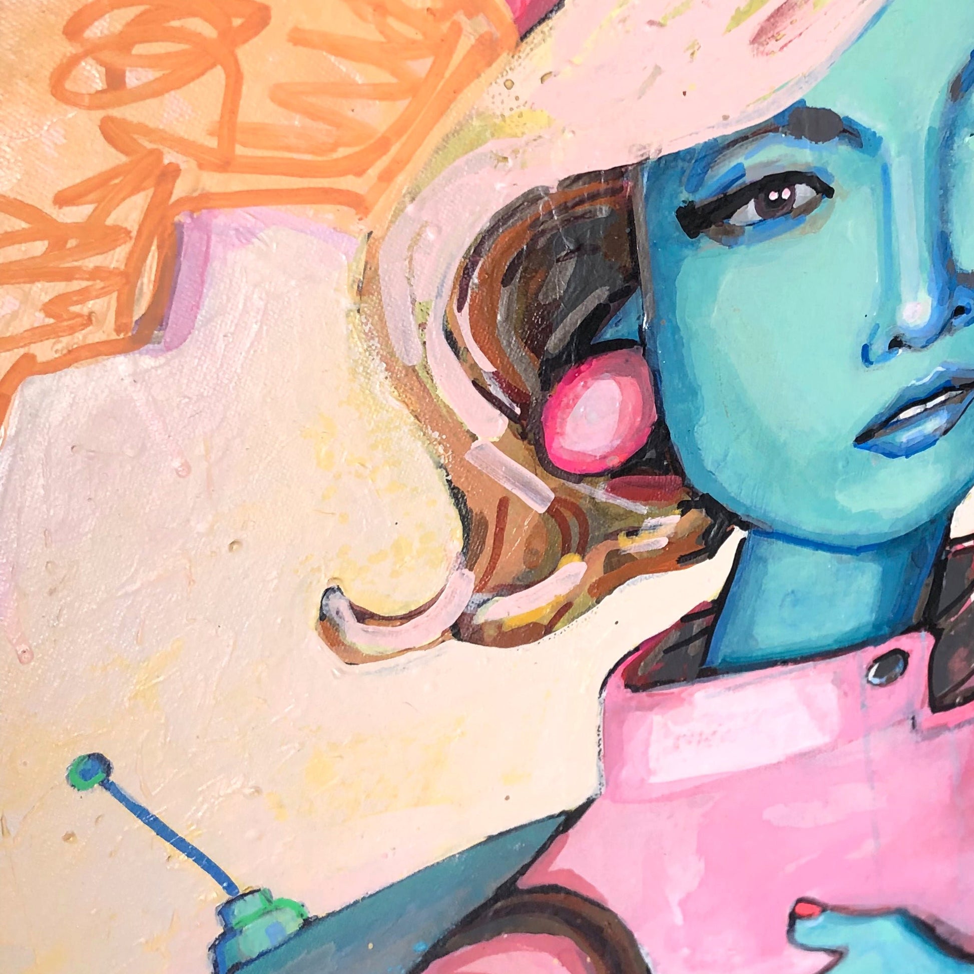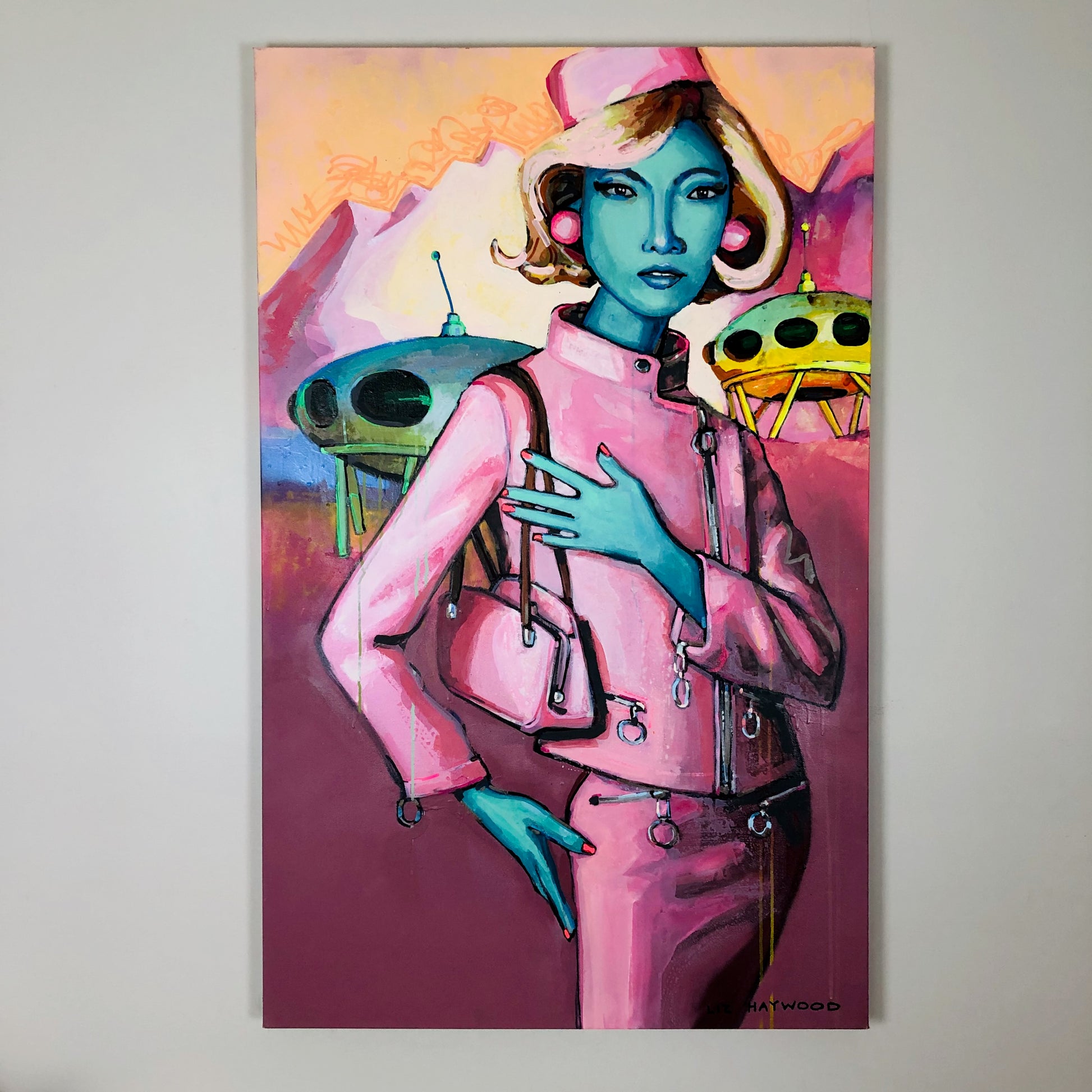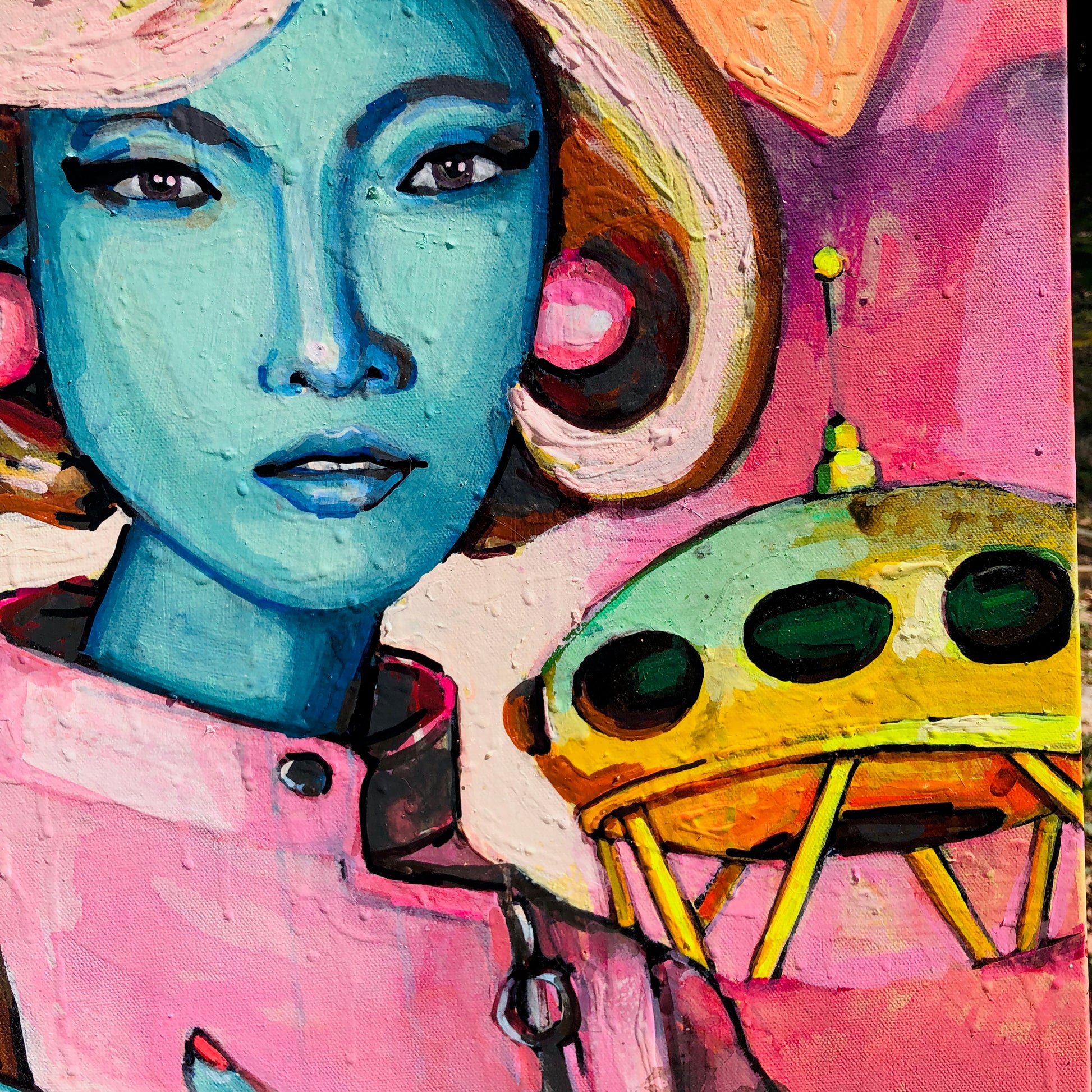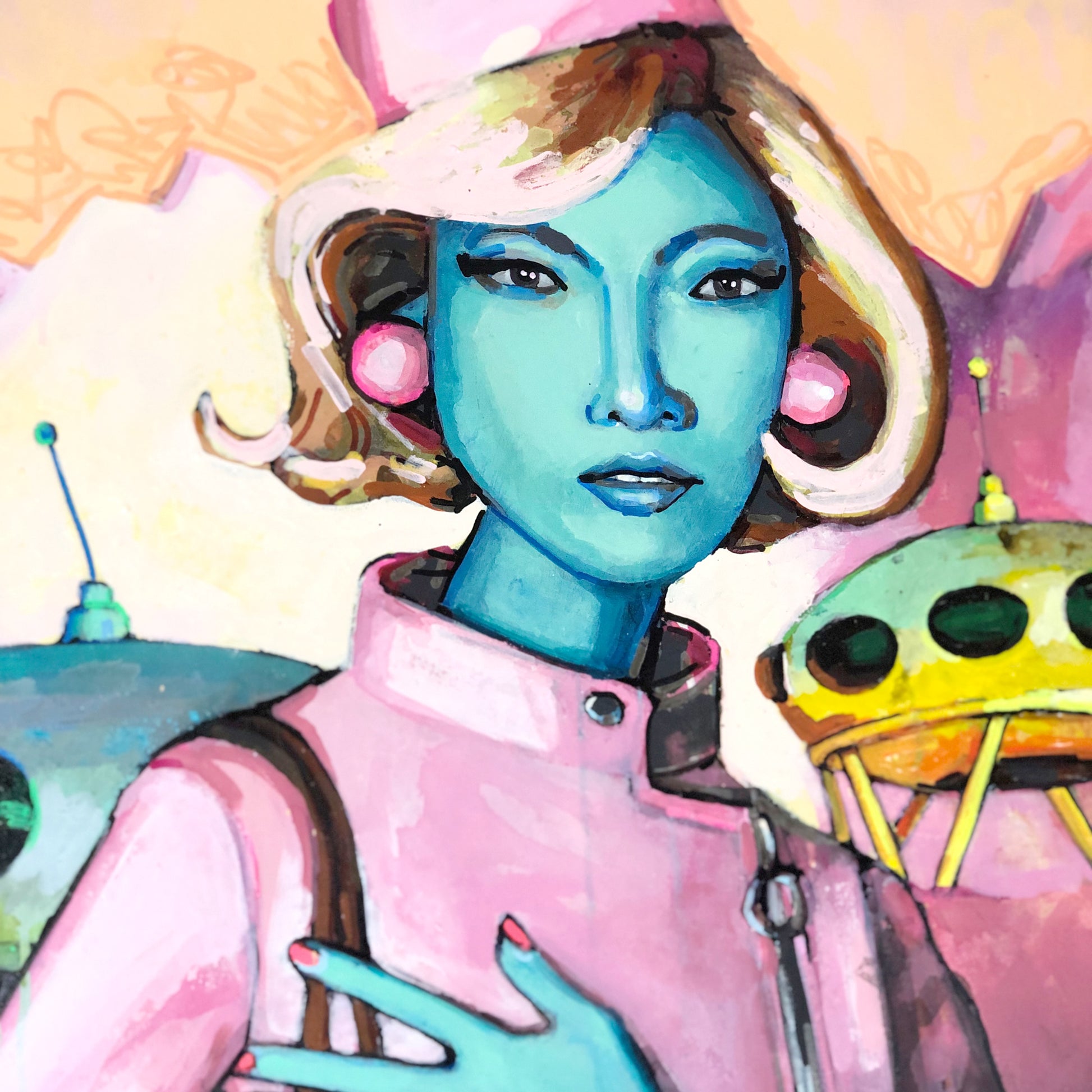 Step into a vibrant, retro-futuristic world with Sky Miles, an electrifying canvas art piece from Liz Haywood’s Alien Worlds series. Featuring a poised, blue-skinned space traveler decked out in a striking pink space suit, this artwork perfectly blends bold, eye-catching colors with a playful, futuristic aesthetic. The intriguing background includes whimsical spacecrafts, giving the scene a unique retro sci-fi vibe that invites the viewer to imagine new worlds and possibilities.