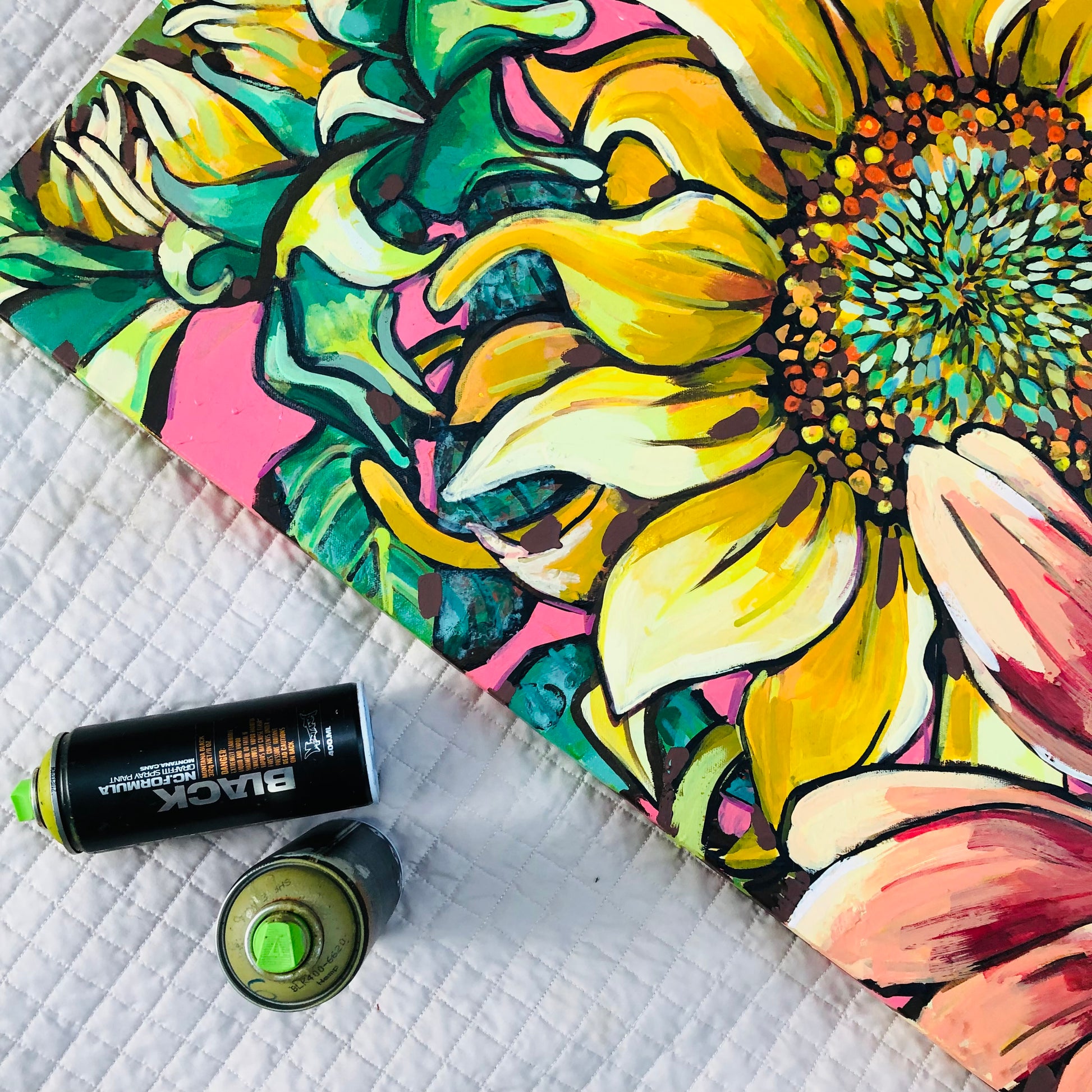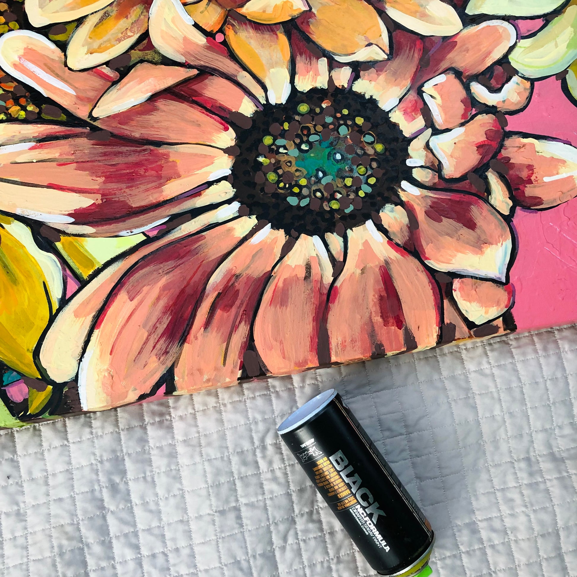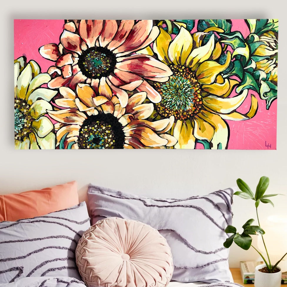 Brighten any space with Sunflowers on Pink, an original painting by North Carolina artist Liz Haywood. Featuring vibrant shades of apricot and sunshine yellow, this artwork captures the warmth and joy of summer, making it perfect for year-round display. With bold gestural strokes in the background and detailed seeds, this piece brings a mix of raw emotion and refined detail. Whether hung horizontally or vertically, Sunflowers on Pink will add cheerful energy to any room.