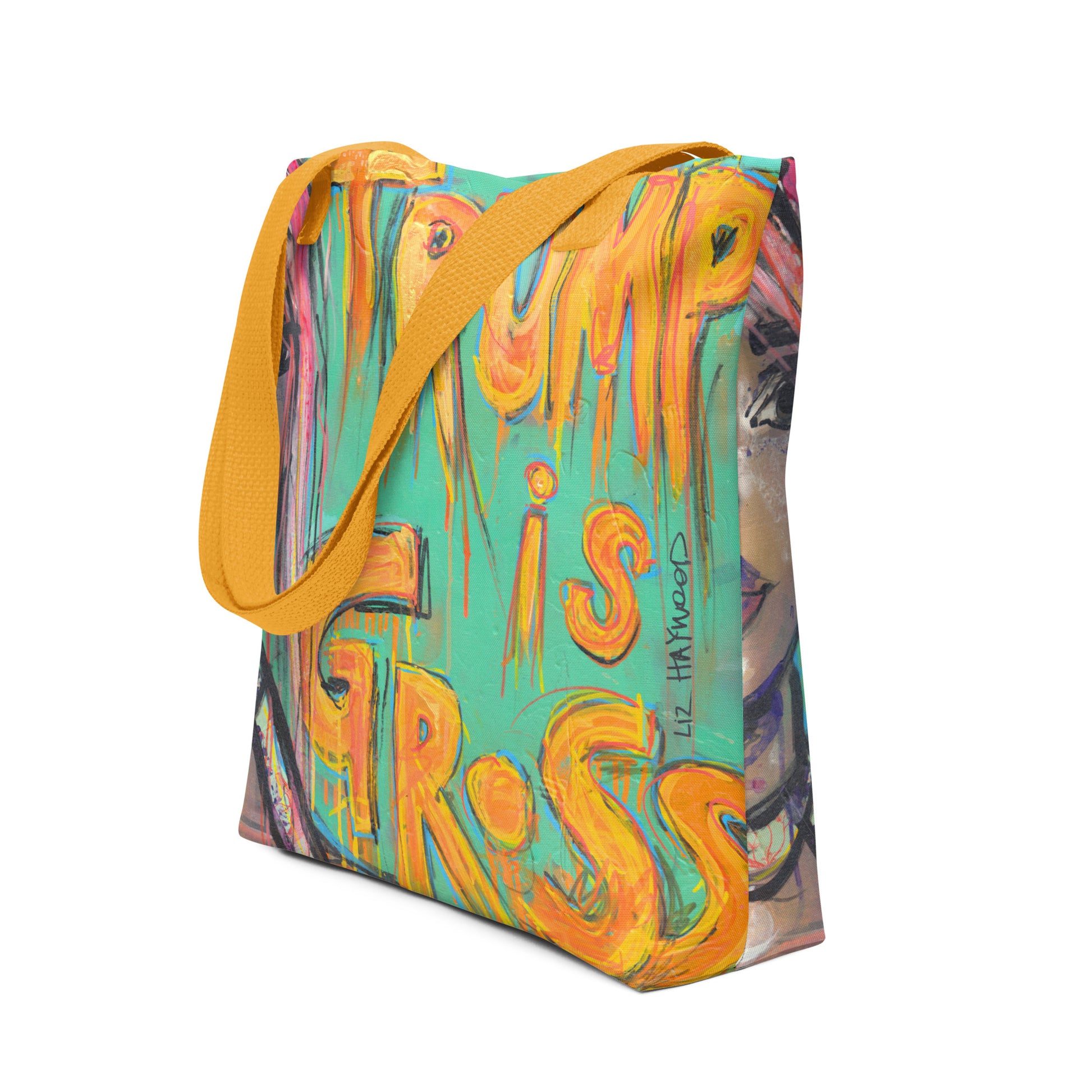 A spacious and trendy tote bag to help you carry around everything that matters. SUPPORTING A CAUSE We’re putting action behind the message. 15% of proceeds from this bag will go directly to support Kamala Harris’s campaign until the election. The remaining funds will be used to create paint supplies for an upcoming Trump is Gross mural, because public art can inspire real change!