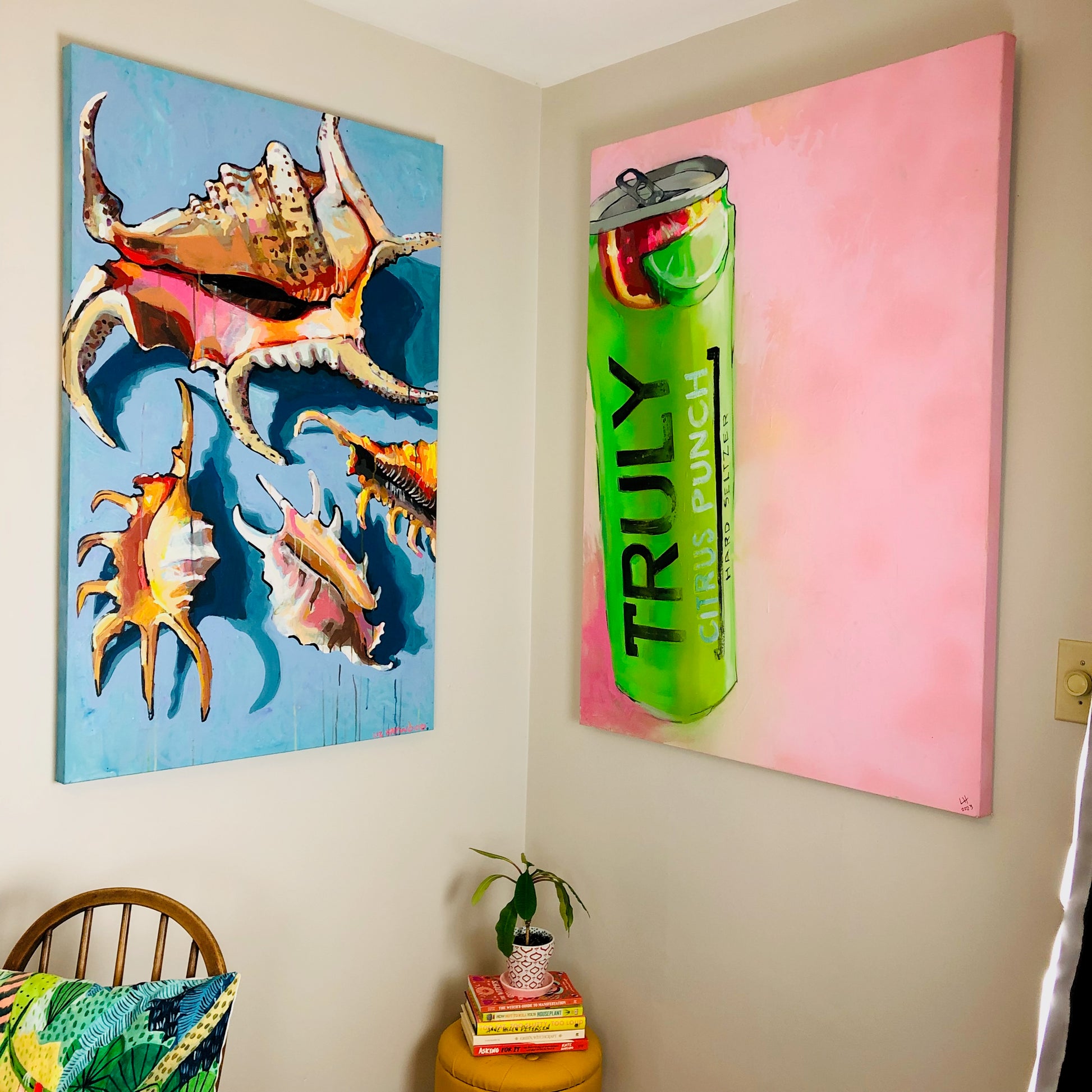 Elevate your space with this striking pop art canvas titled TRULY by Charlotte-based artist Liz Haywood. Featuring a vibrant lime-green hard seltzer can against a playful pink backdrop, this artwork brings a refreshing and contemporary feel to any room. Liz's signature use of bright colors and textured details makes this piece perfect for kitchens, dining areas, or home bars.